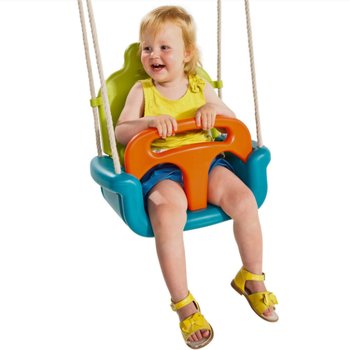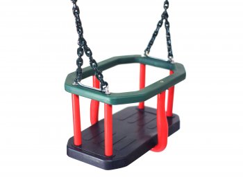 - Качели для малышей. Обычно предназначены для детей от 1 года до 3 лет. Они более устойчивые и имеют защитные барьеры.