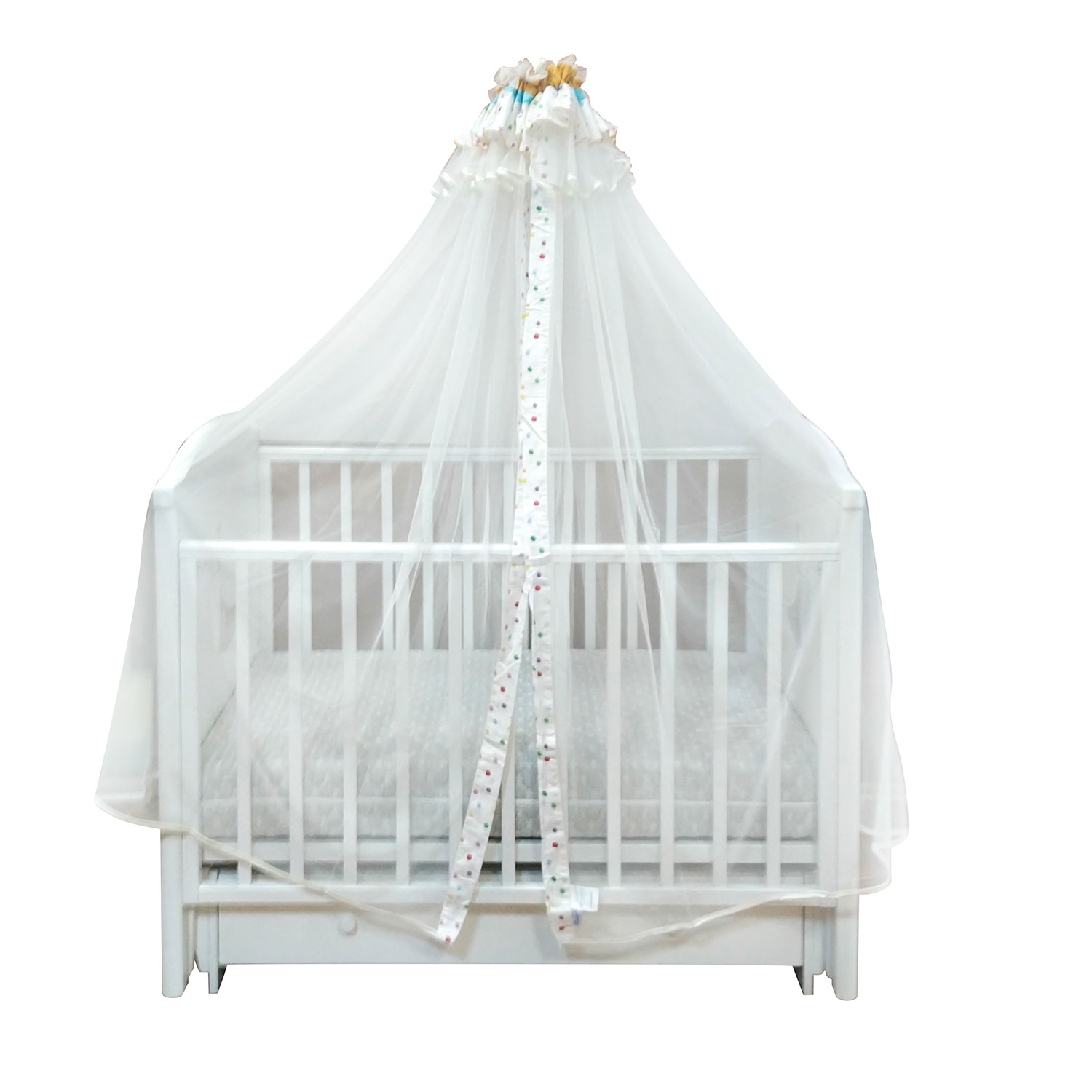 Приятные особенности:Легкий тюлевый балдахинFeretti Puppet станет вашим незаменимым помощником в спальной комнате, когда понадобится создать комфортную обстановку для ребенка. При изготовлениитекстиля фирма использует только натуральные материалы, обеспечивая высокую экологичность изделий. Способность отталкивать частички пыли. Данное свойство ткань приобрела в результате специальной обработки полотна. П резентабельный внешний вид. Для изготовления балдахина Feretti Puppet производитель использовал тюль, по периметру которого проходит белая атласная лента. Сверху материал декорирован прозрачным бантом.