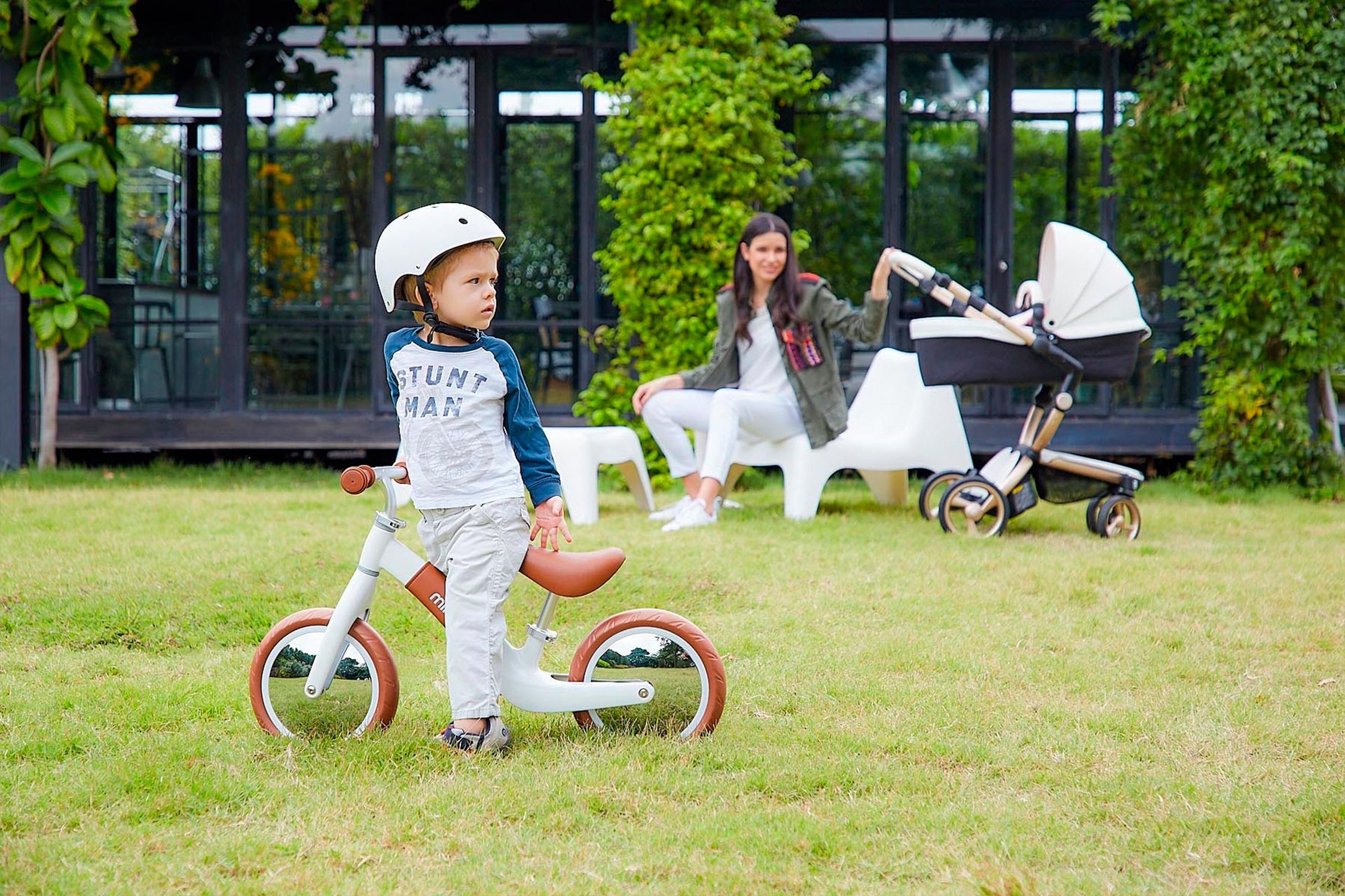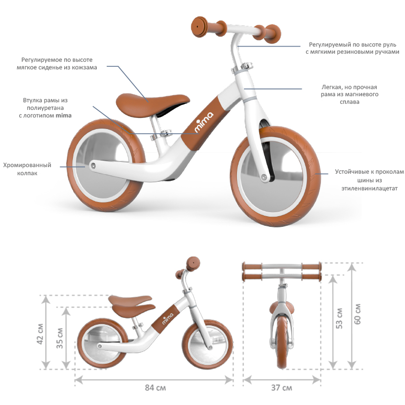 Приятные особенности: Беговел Mima Zoom (Мима Зум) - детский беговел для ребенка от 2 до 5 лет в современном дизайне. Вы обязательно оцените невероятно легкую и надежную раму из магниевого сплава. Мягкое кожаное сидение легко регулируется по высоте, что позволит быстро настроить транспорт под рост ребенка. Руль так же регулируется по высоте, без инструментов, что позволит даже на улице отрегулировать беговел за несколько секунд. Качественные колеса из не прокалываемого материала с хромированными колпаками смотрятся очень эффектно и обеспечат прекрасное катание по любым дорогам. Такая модель научит ребенка держать равновесие, управлять транспортом, а так же станет отличным тренажером для двухколесного велосипеда.