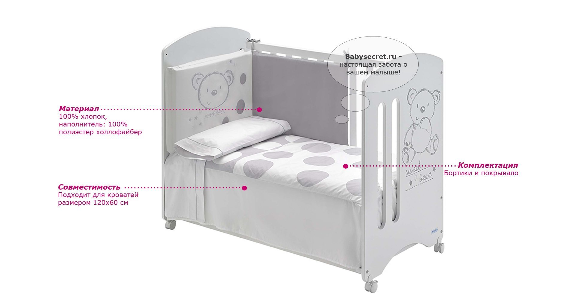 Приятные особенности бортика и покрывала Micuna:коллекция текстиля для детской комнаты от испанской компании Micuna создана из натурального хлопка самой тонкой выделки. Нежная, гипоаллергенная ткань благоприятна для кожи малышей. Она легко стирается и быстро сохнет. Наполнитель мягких бортиков – холлофайбер – состоит из пустотелых полиэстеровых волокон, скрученных в форме пружин. Обеспечивает лучшую, чем синтепон, теплоизоляцию и меньше слёживается. Текстиль Micuna – гарантия настоящего качества.