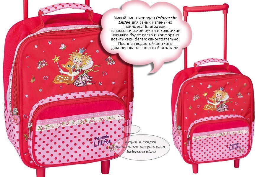 Приятные особенности чемодана Spiegelburg Prinzessin Lillifee30394:милый мини-чемодан Prinzessin Lilifee для самых маленьких принцесс! Благодаря, телескопической ручки и колесикам малышке будет легко и комфортно возить свой багаж самостоятельно. Прочная водостойкая ткань декорирована вышивкой стразами. С таким чемоданчиком любая малышка сможет почувствовать себя героиней любимой сказки!