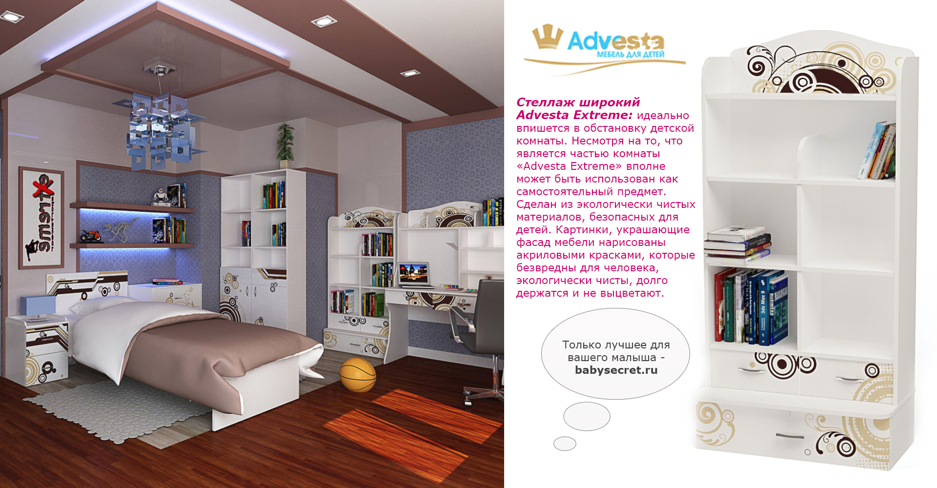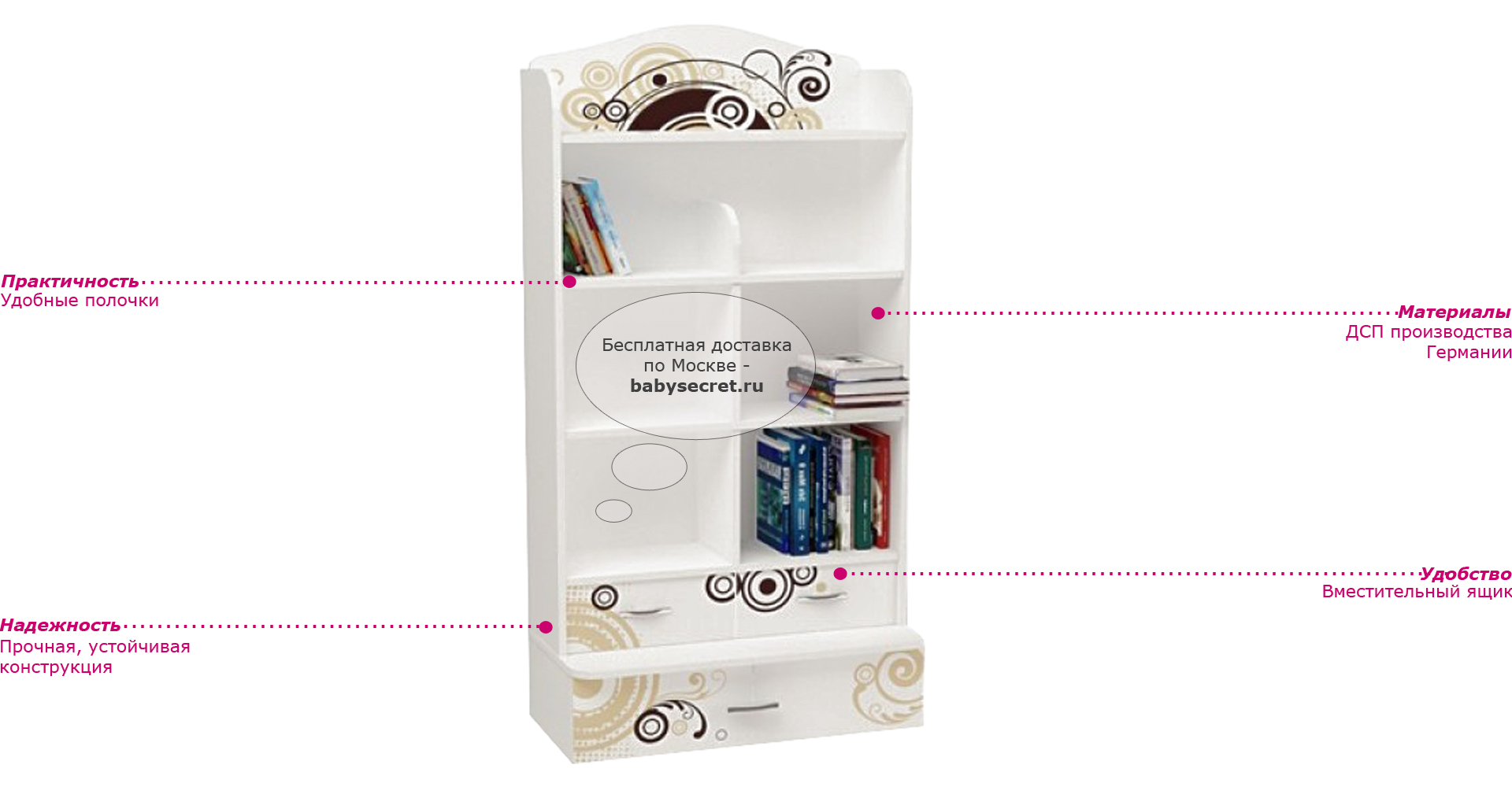 Приятные особенности стеллажа широкий:сделан из экологически чистых материалов, безопасных для детей. Основой является ДСП производства Германии, где предъявляются самые строгие требования к качеству.У мебели есть преимущество, которое понравится, как детям, так и взрослым. Детскую мебель можно красиво оформить специальными картинками, которые изготовлены из прочных и долговечных материалов, позволяющих проводить влажную уборку. Картинки, украшающие фасады мебели нарисованы акриловыми красками, которые безвредны для человека, экологически чисты, долго держатся и не выцветают.