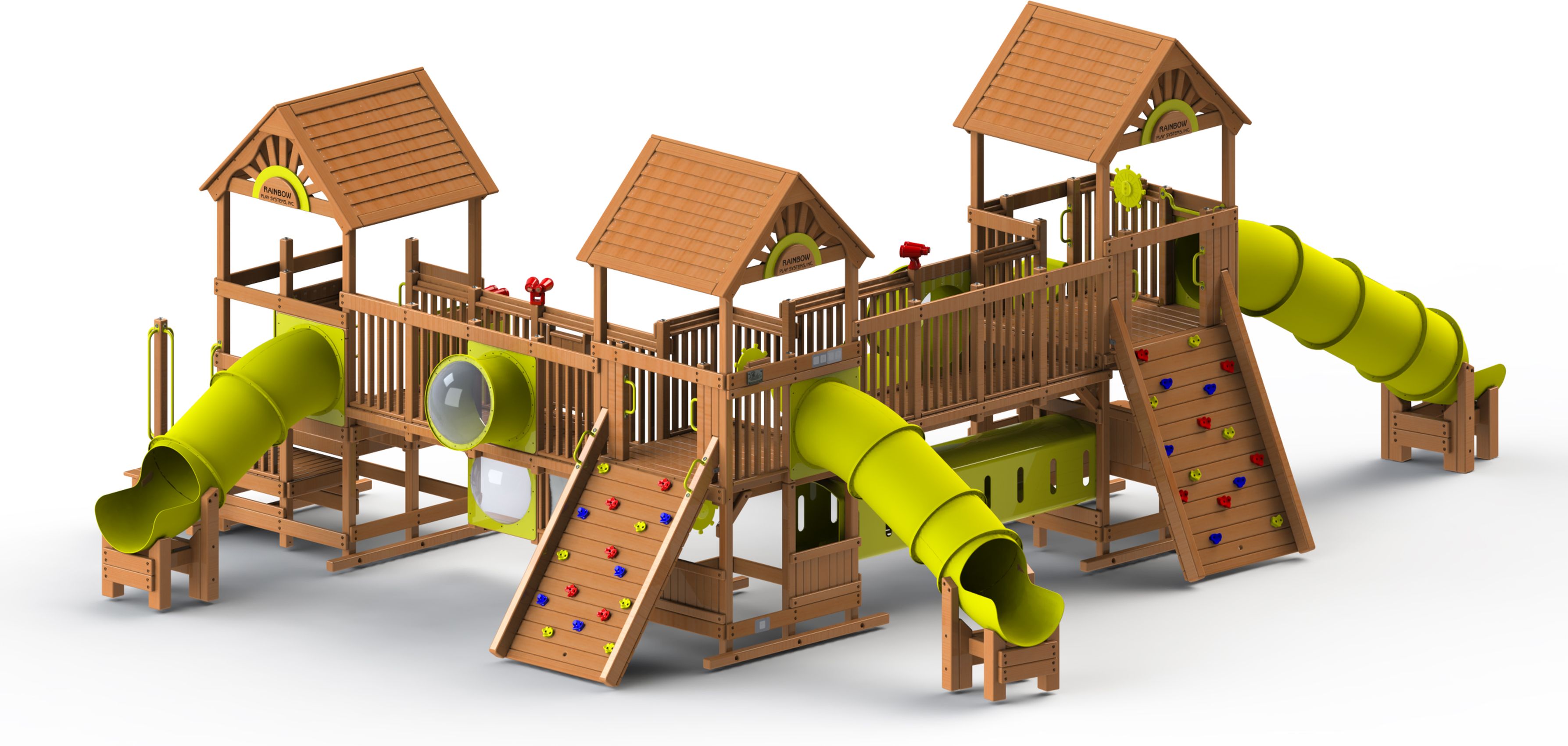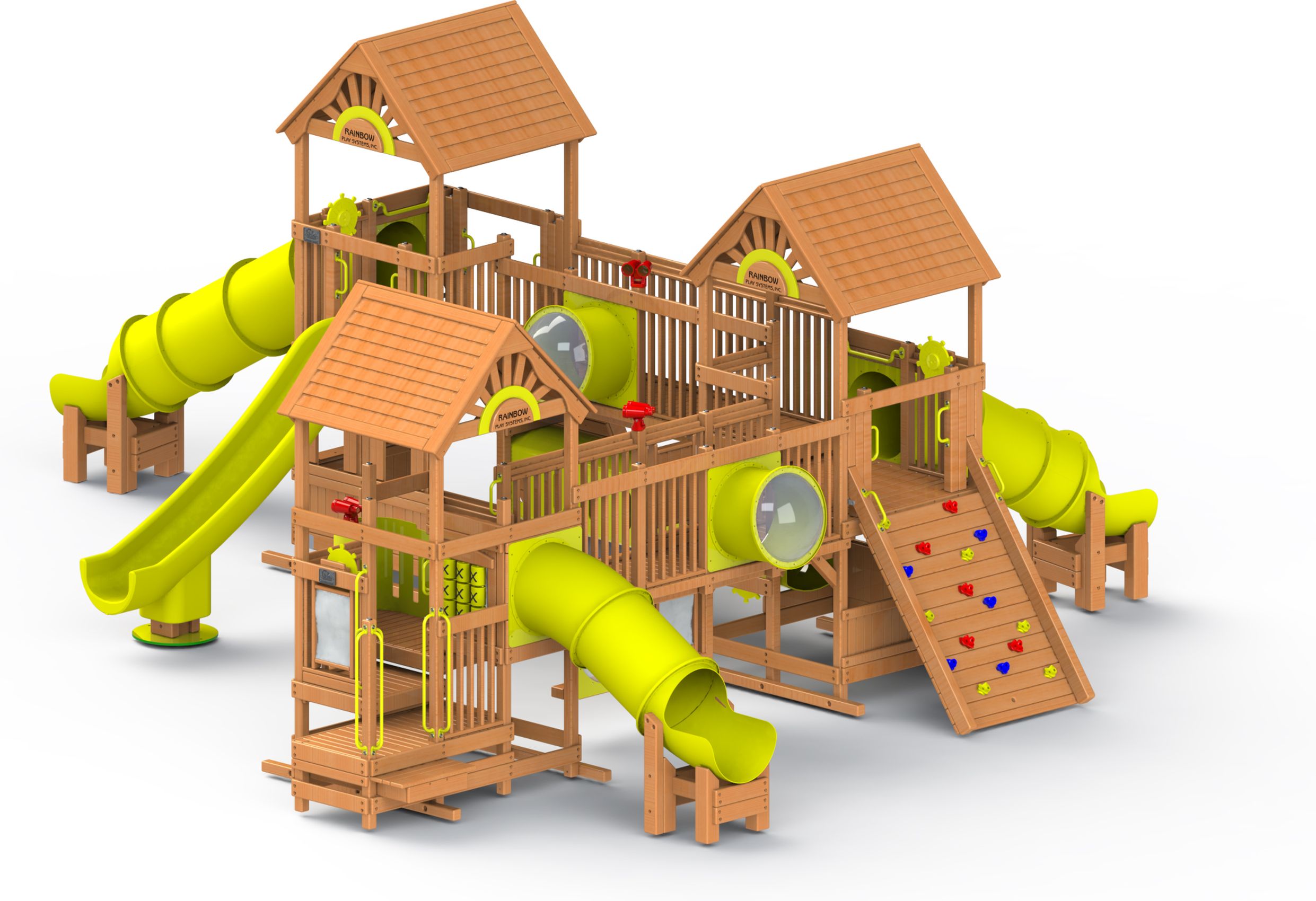 Приятные особенности :Детский игровой комплекс, выполненный из самого прочного и устойчивого к погодным изменениям дерева, будет долгие годы радовать окрестную детвору, предоставляя площадку для полёта детской фантазии и игр. Тут сможет играть и подросток, и карапуз – всем найдётся место в игровом пространстве детского городка.На его территории дети смогут играть как в подвижные, так и в спокойные игры. Двускатная крыша будет укрывать малышей от солнца и дождя, а надёжные рукояти и невысокие ступеньки делают игровую площадку доступной для детей-инвалидов.