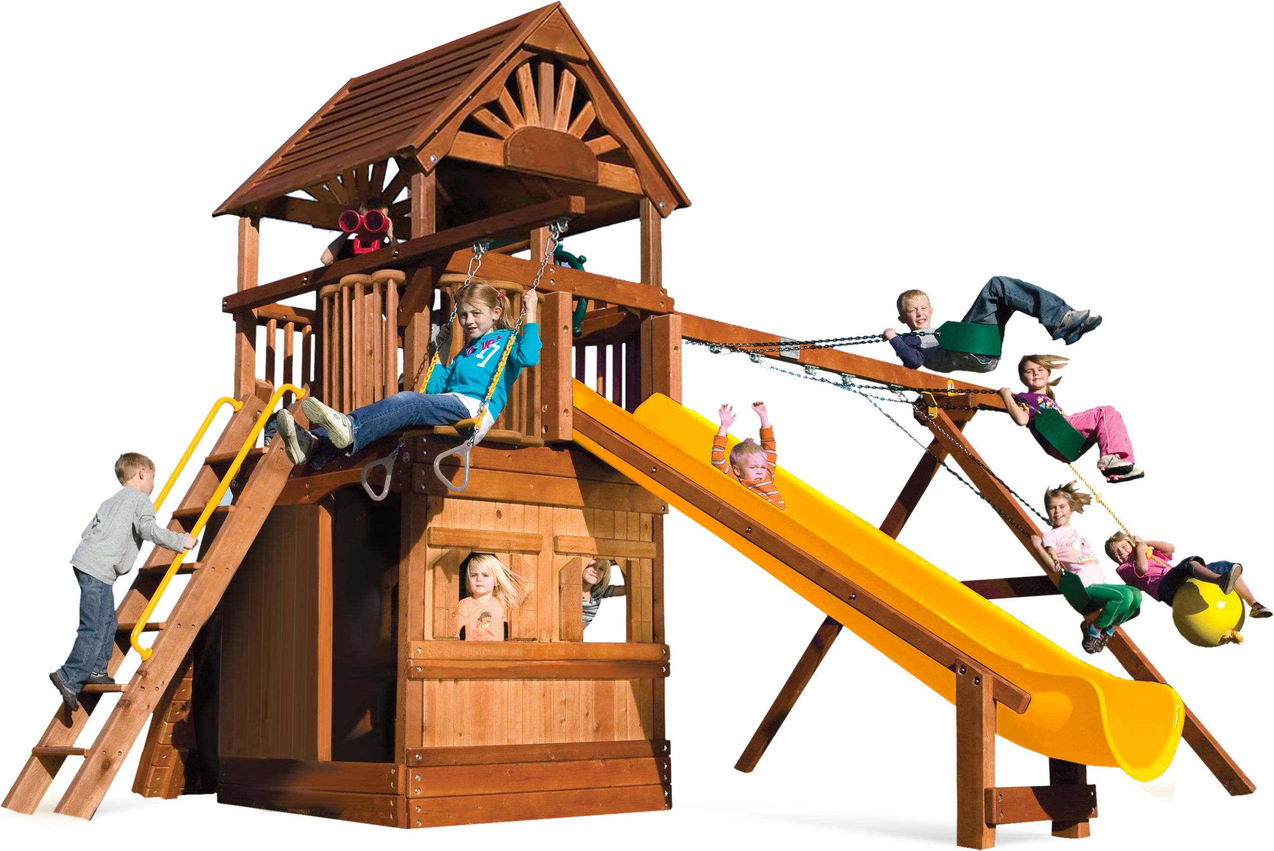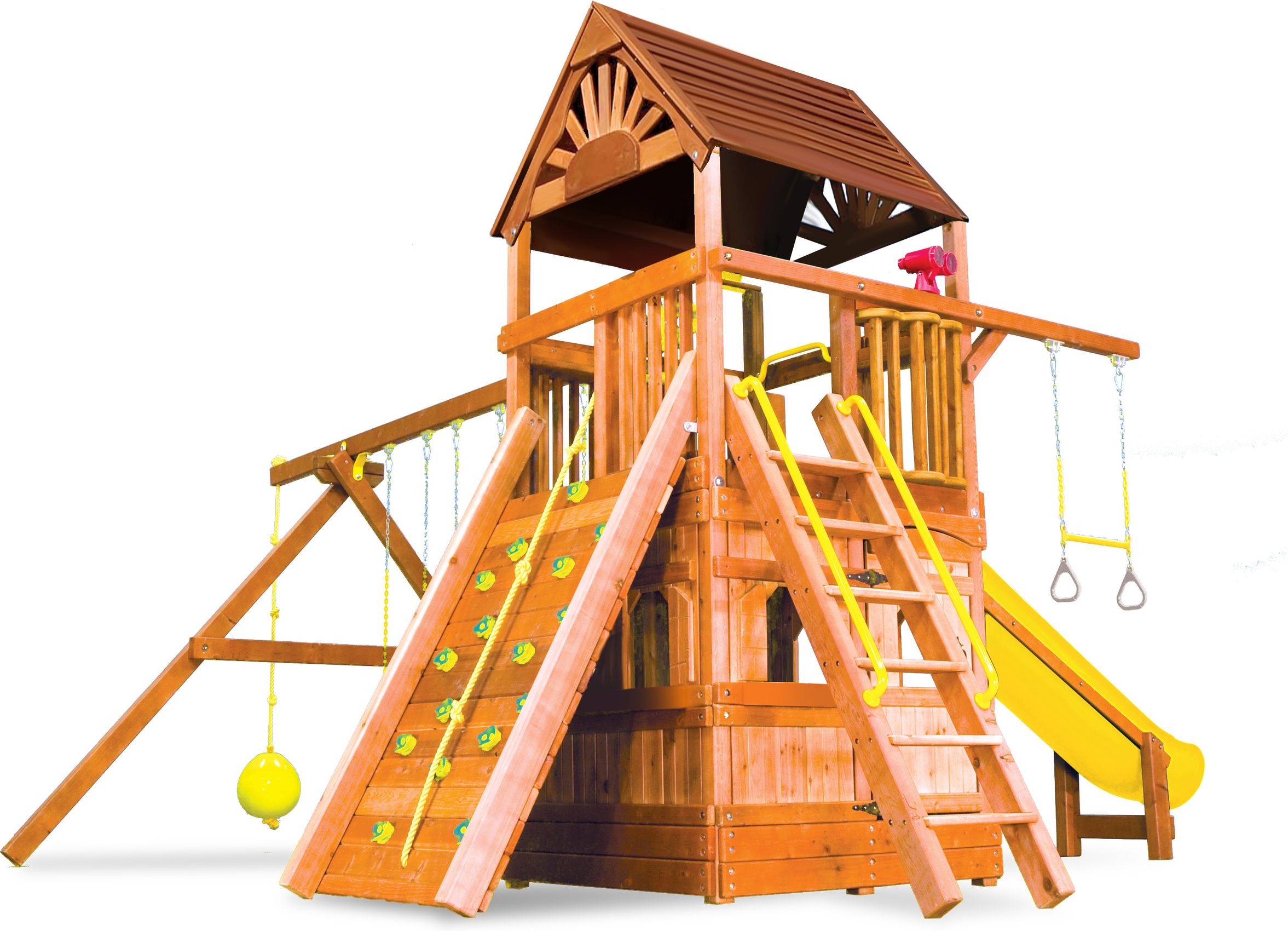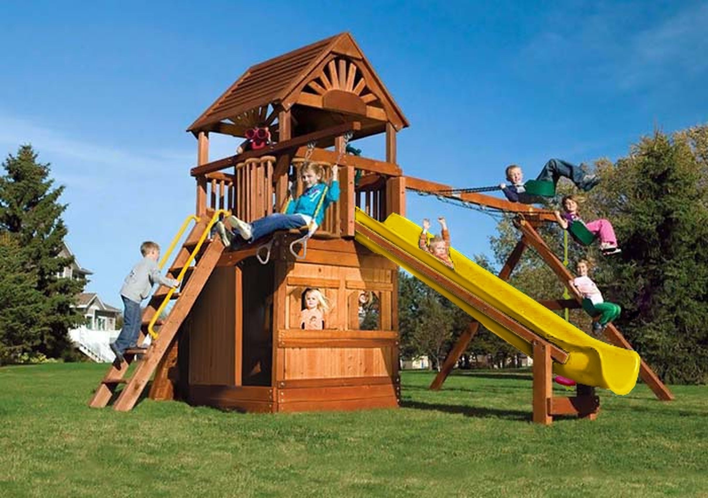 Приятные особенности :Эта детская площадка великолепно подходит для обустройства «своего» игрового мира в нижнем закрытом домике. И пока юные хозяюшки будут укладывать кукол спать, мужчины смогут внимательно обозревать окрестности со второго этажа или с качелей. А при необходимости озорные защитники моментально доберутся с горки быстрого скольжения до лакомых кусочков на родительском пикнике.