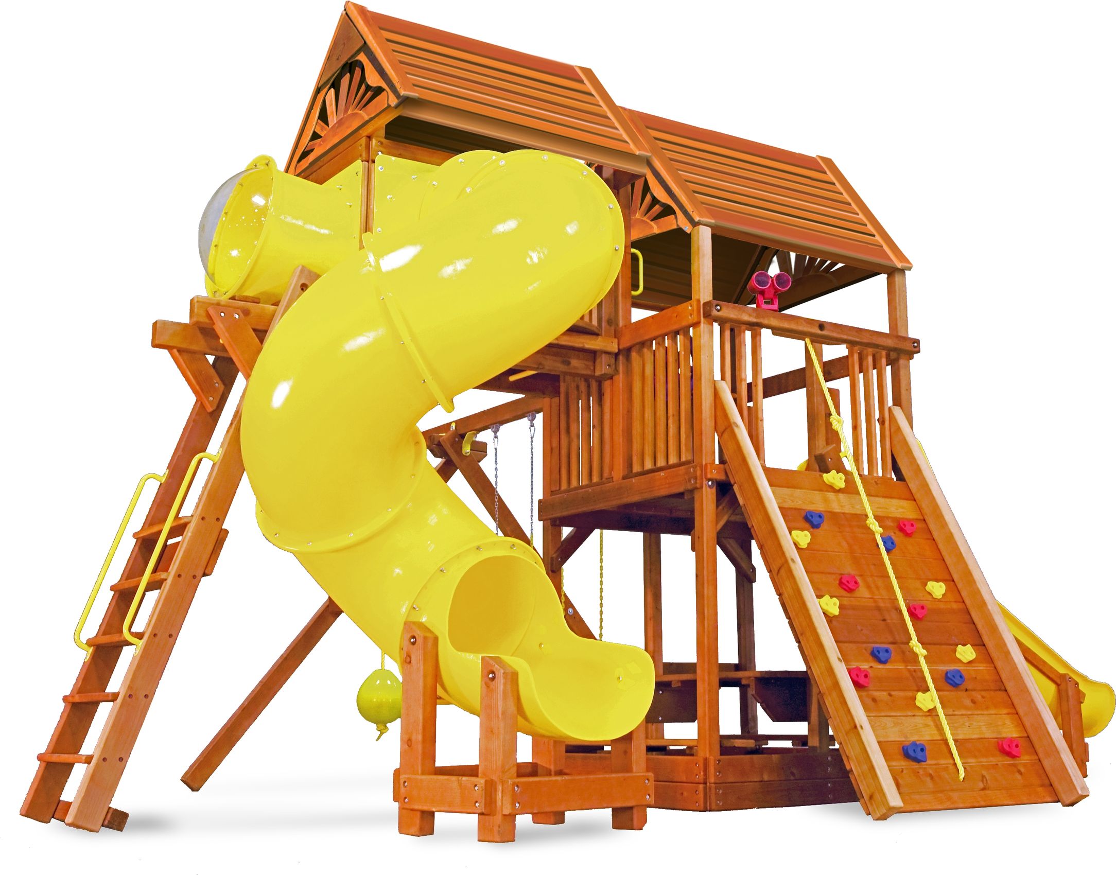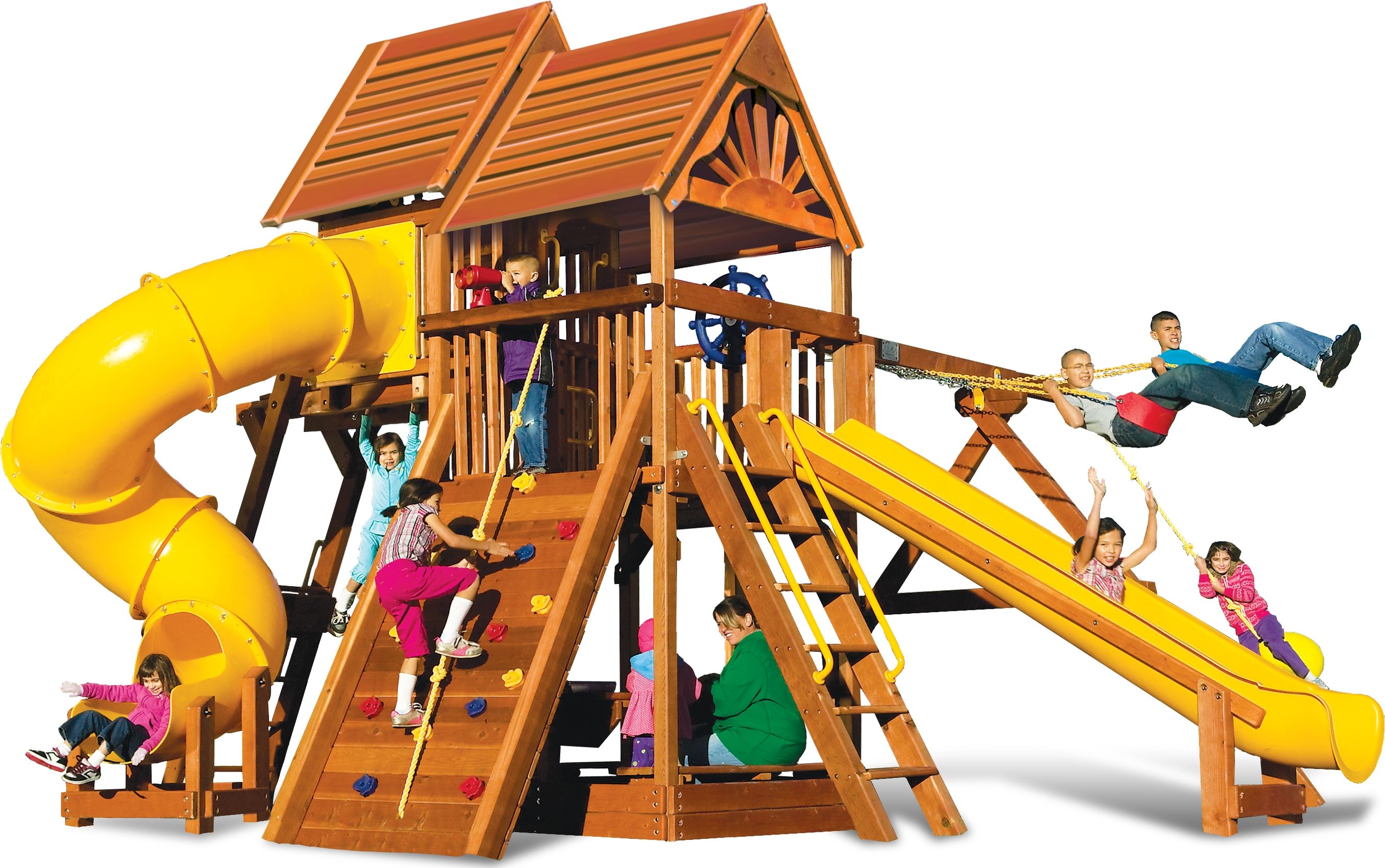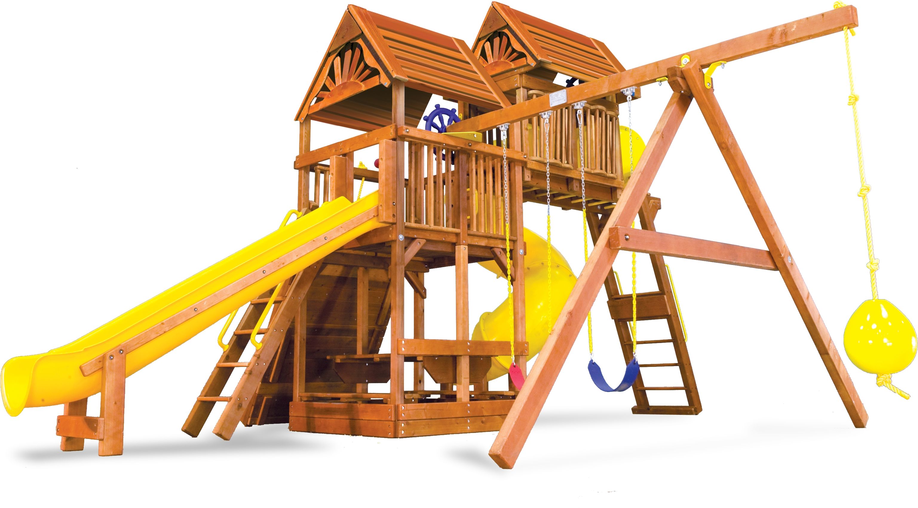 Приятные особенности :Богатство игровых аксессуаров не оставит равнодушным ни одного ребёнка.Ведь уютные столик и скамеечки под домиком или капитанские штурвалы вкупе с биноклем на втором этаже располагают к сюжетным играм.А спиральная горка, качели, скалодром и горка быстрого скольжения зовут к приключениям, преодолению сложных маршрутов и придумыванию ролевых активных игр.Для родителей весомым аргументом в пользу выбора именно этого комплекса будет надежность конструкции, качество (все детали выполнены из цельного бруса и тщательно обработаны) и продуманность всех мелочей в исполнении для полной безопасности детей.