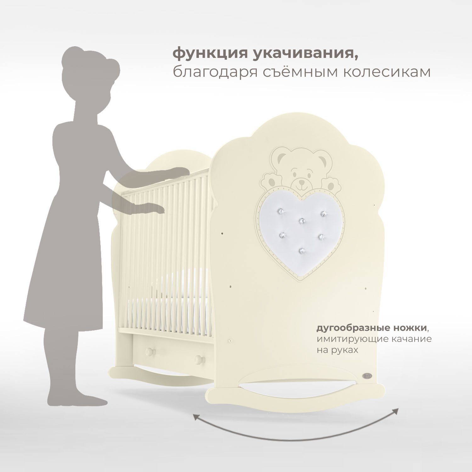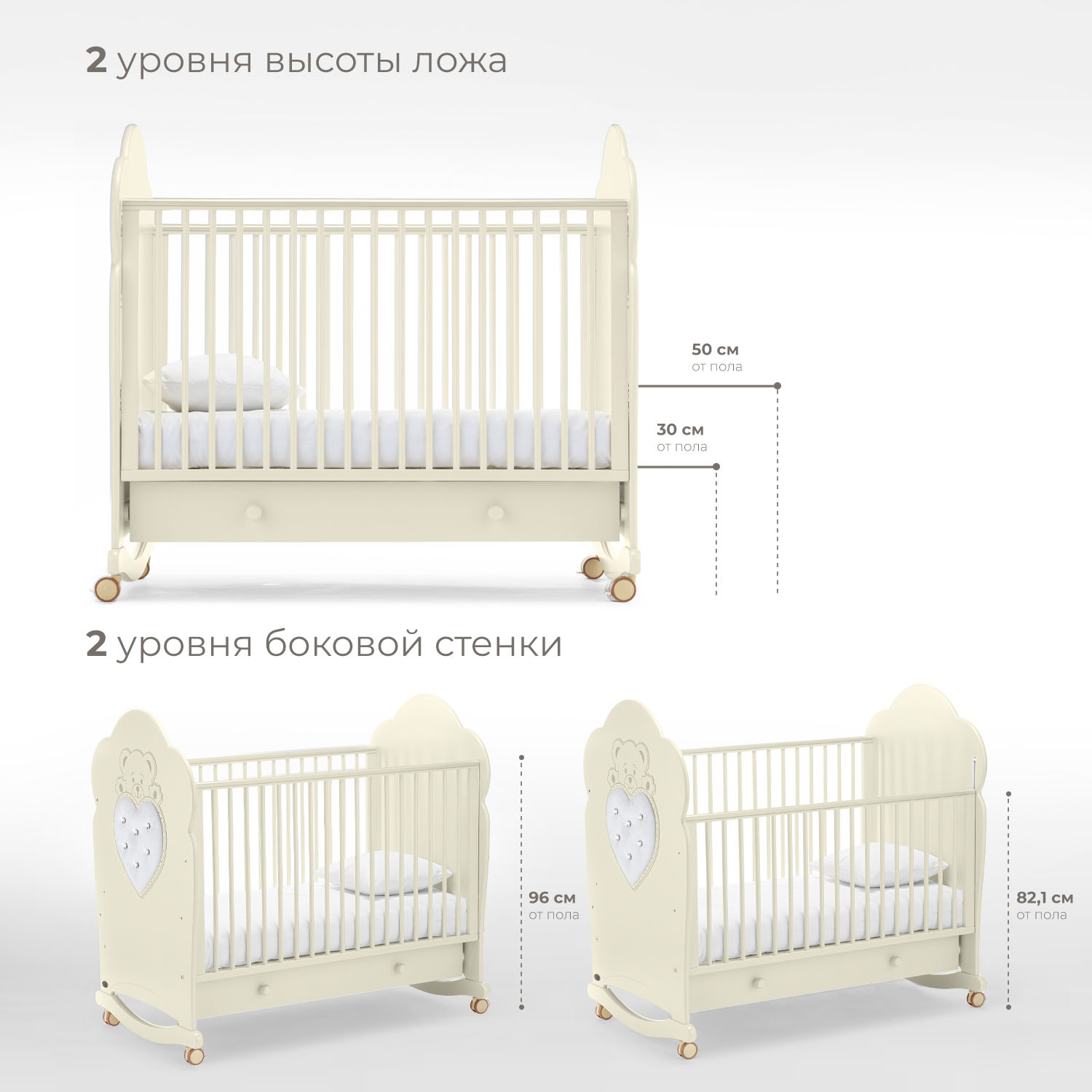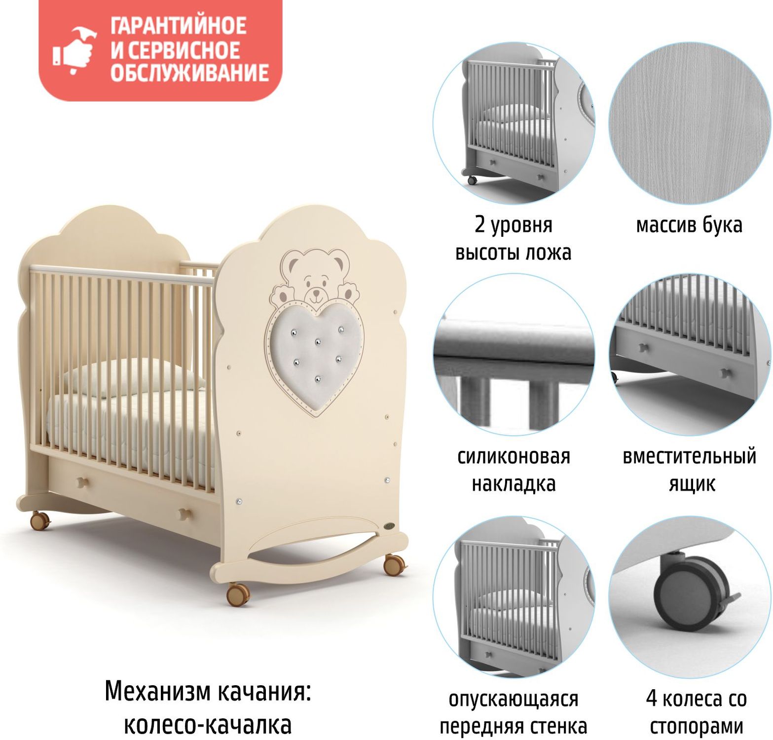 Приятные особенности :Детская кровать Nuovita Fortuna Dondolo – это изысканный дизайн, практичность и передовые технологии, которые помогут наилучшим образом организовать спальное место для малыша и подарить ему спокойный сон и полноценный отдых. Кроватка изготовлена на современном оборудовании в соответствии с европейскими стандартами качества и под строгим контролем специалистов из Италии. Ее исполнение безупречно, а материалы натуральны и безопасны: корпус кроватки выполнен из знаменитого своей прочностью бука и покрыт экологически чистыми красками и лаками. Колеса имеют механизм вращения (на 360°), оснащены стопорами. Это свойство следует применять во время бодрствования ребенка. Прорезиненная поверхность колес делает скольжение кроватки бесшумным, не оставляя следов на паркете и ковровом покрытии. Опускающаяся передняя стенка облегчает контакт матери с ребенком и имеет надежный механизм фиксации.