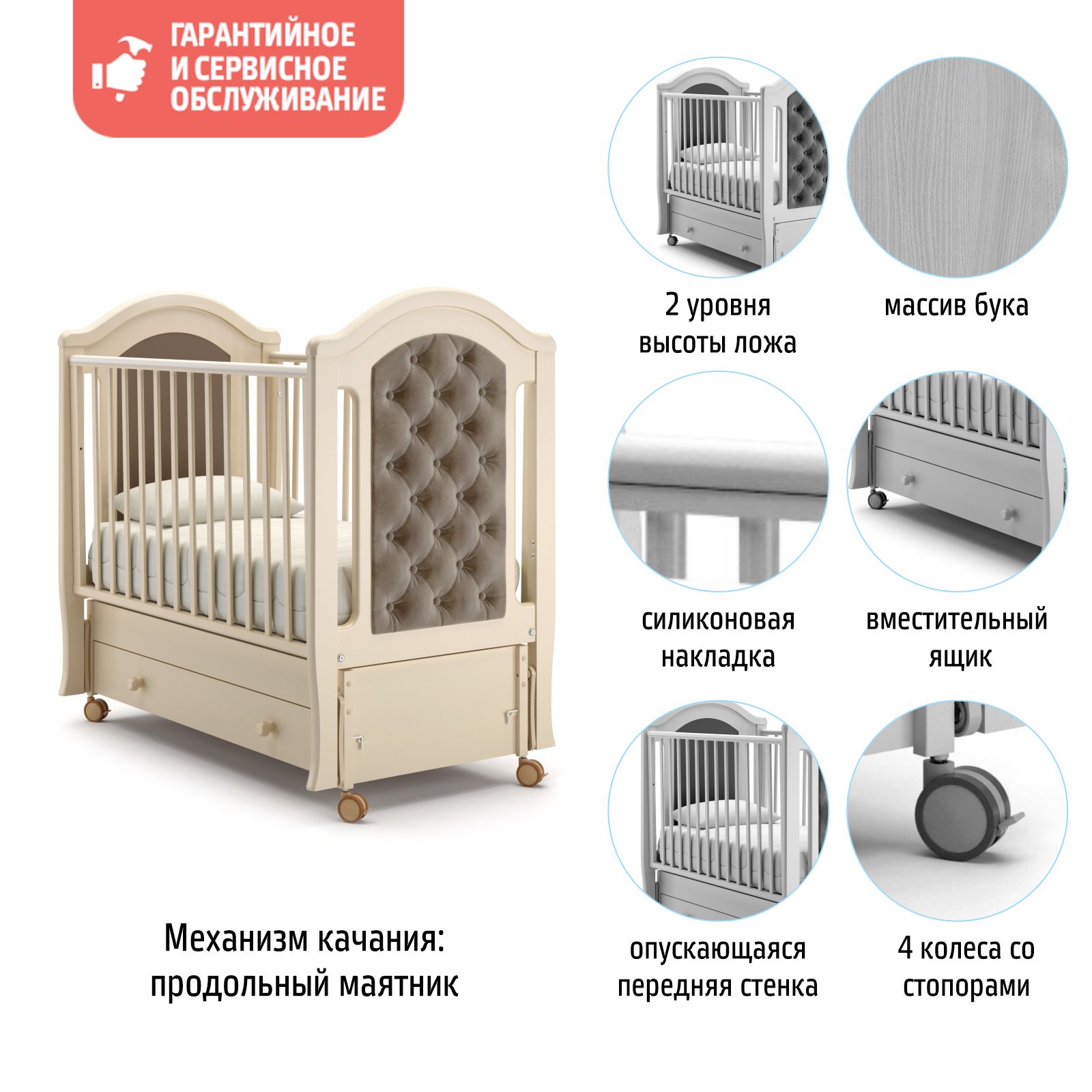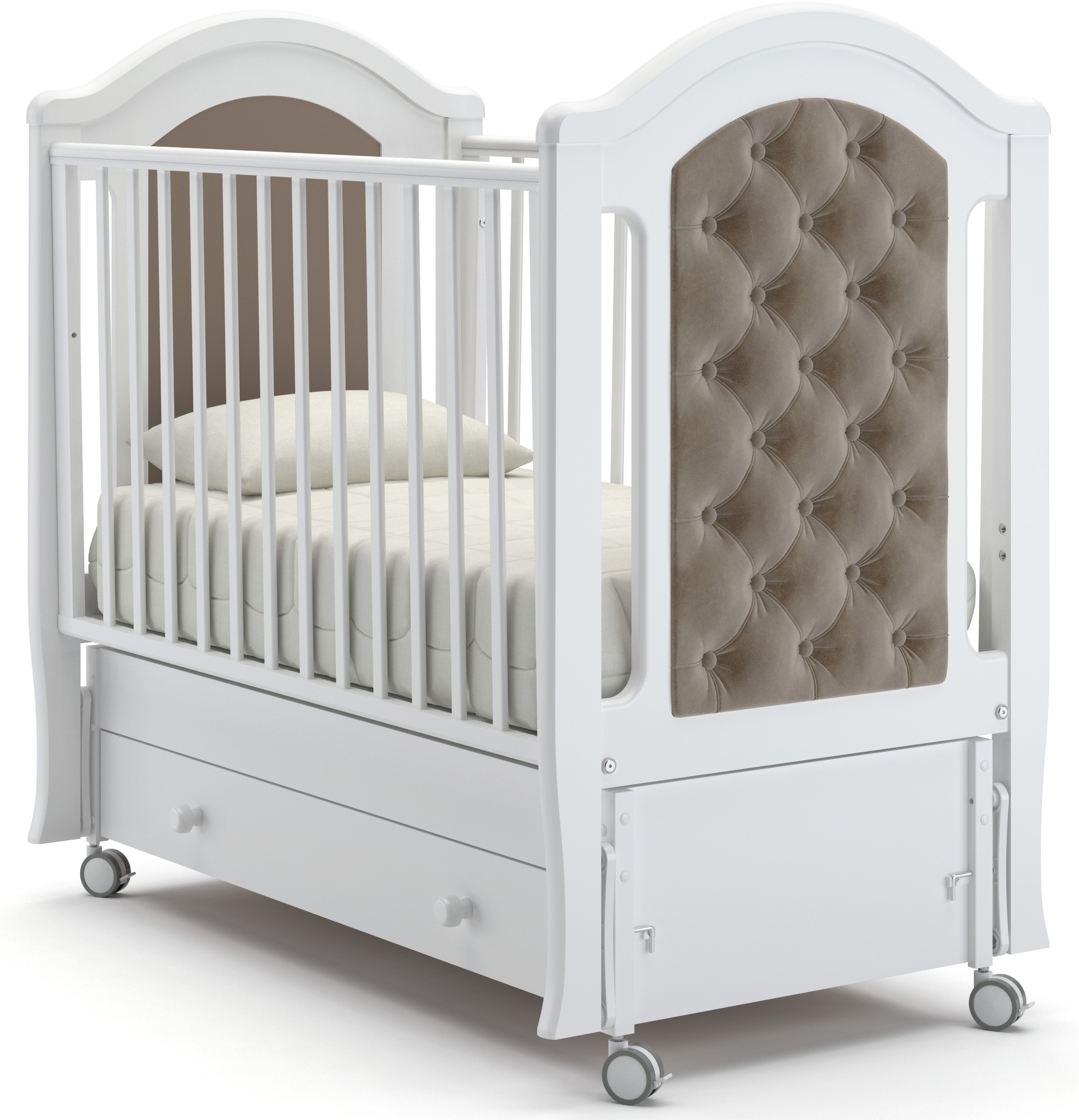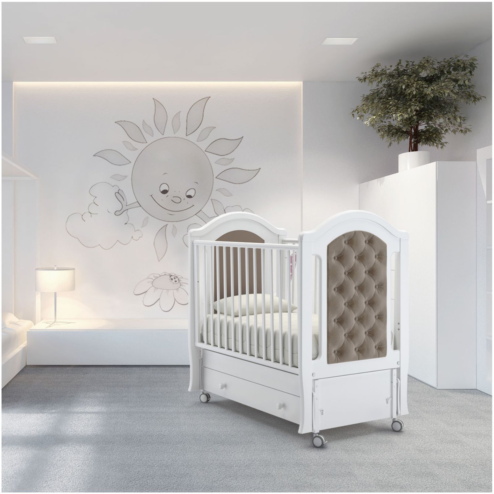 Приятные особенности :Детская кровать Grazia swing от итальянской марки Nuovita — это комфортная классическая кроватка для малыша, изготовленная из массива бука. Яркой особенностью модели является запоминающийся дизайн, основным элементом которого выступает объемная «каретная» стяжка на внешней стороне спинок.Кроватка Нуовита Грация Свинг изготовлена из высококачественных материалов на современном европейском оборудовании и рассчитана на длительное применение.Она может использоваться с первых дней жизни новорожденного, поскольку имеет маятник продольного укачивания, 2 уровня высоты и регулируемую боковую стенку. В конструкции предусмотрена возможность полного демонтажа боковой стенки, что позволит подросшему ребенку ложиться в кровать самостоятельно. В дальнейшем можно добавить несколько мягких подушек и использовать кроватку как диванчик. Кроватка очень удобна: размер спального места составляет 120x60см и подходит для большинства матрасиков, на поручнях находятся противоскользящие накладки, для перемещения предусмотрены колесики со стопорами. Расположенный внизу бельевой ящик является прочным и вместительным.Корпус кроватки и основные элементы сделаны из массива бука, изящные фигурные спинки выполнены из МДФ, в конструкции ящика для белья используется ЛДСП. Все материалы, покрытия и фурнитура соответствуют европейским требованиям, предъявляемым к безопасности детской мебели.Детская кровать Nuovita Grazia swing выпускается в различных расцветках, что позволяет подобрать модель, как для мальчика, так и для девочки.