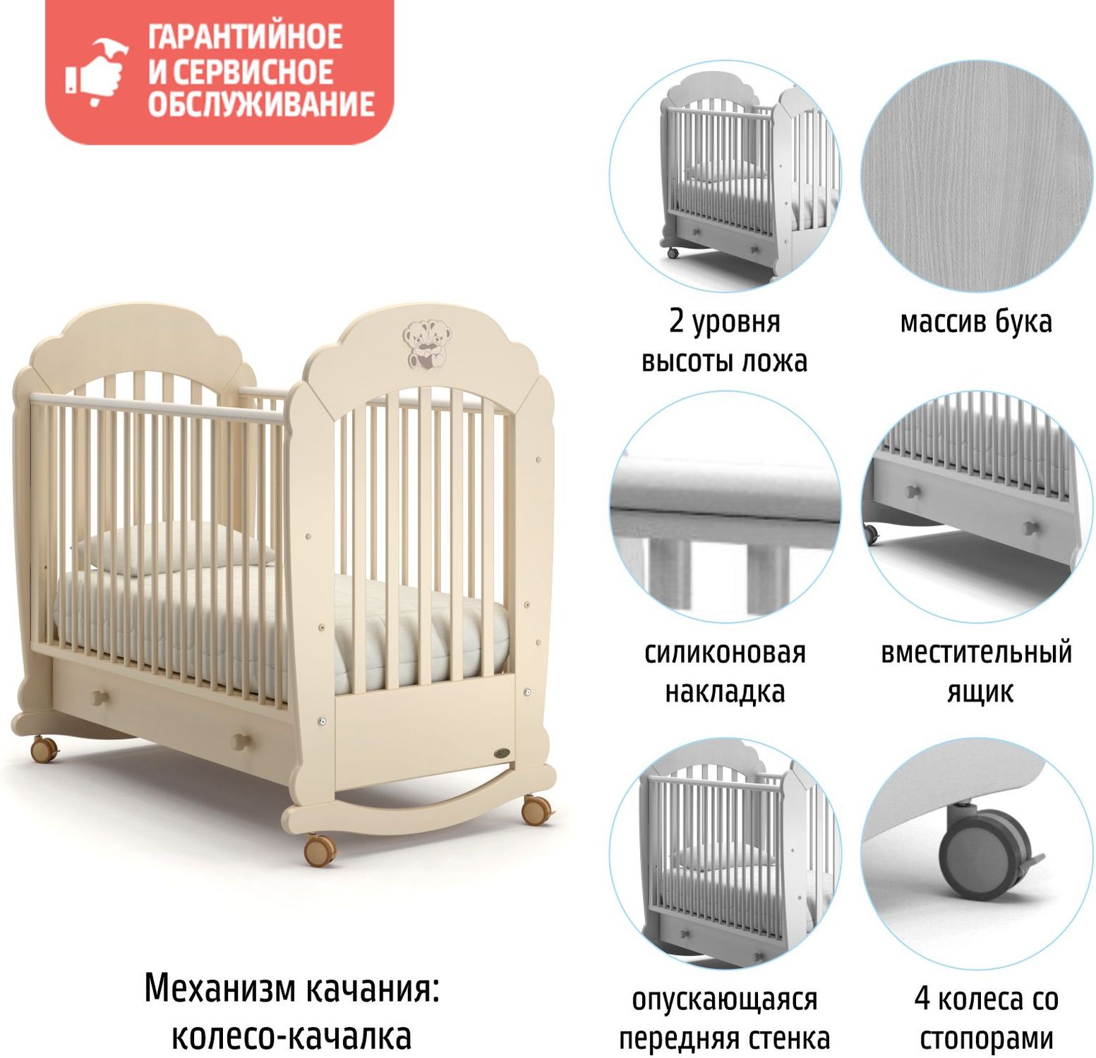 Приятные особенности :Детская кровать Nuovita Parte Dondolo - это изысканный дизайн, практичность и передовые технологии, которые помогут наилучшим образом организовать спальное место для малыша и подарить ему спокойный сон и полноценный отдых. Кроватка изготовлена на современном оборудовании в соответствии с европейскими стандартами качества и под строгим контролем специалистов из Италии. Ее исполнение безупречно, а материалы натуральны и безопасны: корпус кроватки выполнен из знаменитого своей прочностью бука и покрыт экологически чистыми красками и лаками. Колеса имеют механизм вращения (на 360°), оснащены стопорами. Это свойство следует применять во время бодрствования ребенка. Прорезиненная поверхность колес делает скольжение кроватки бесшумным, не оставляя следов на паркете и ковровом покрытии. Опускающаяся передняя стенка облегчает контакт матери с ребенком и имеет надежный механизм фиксации.