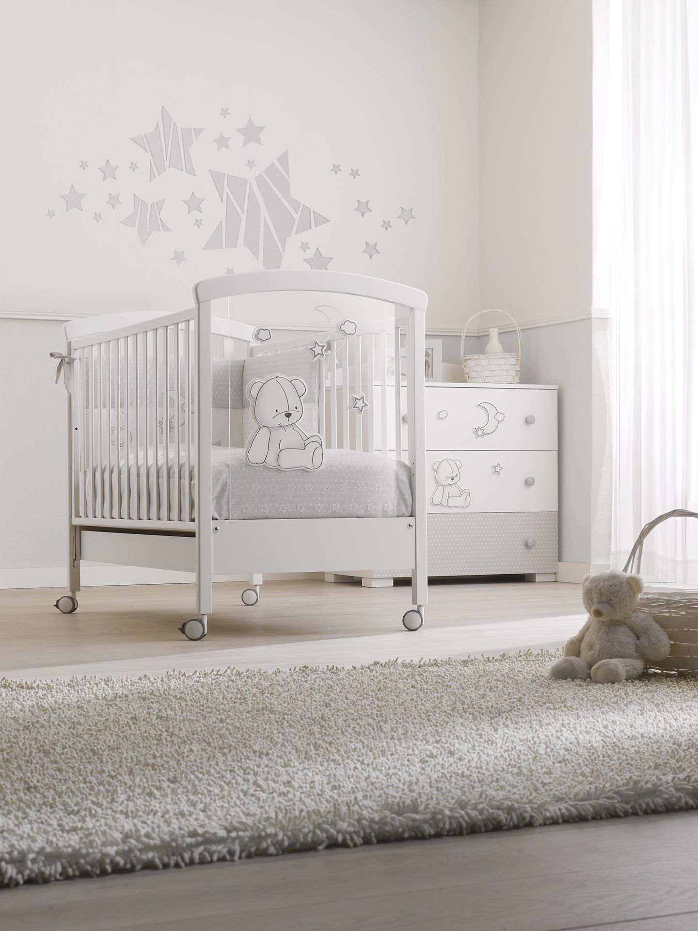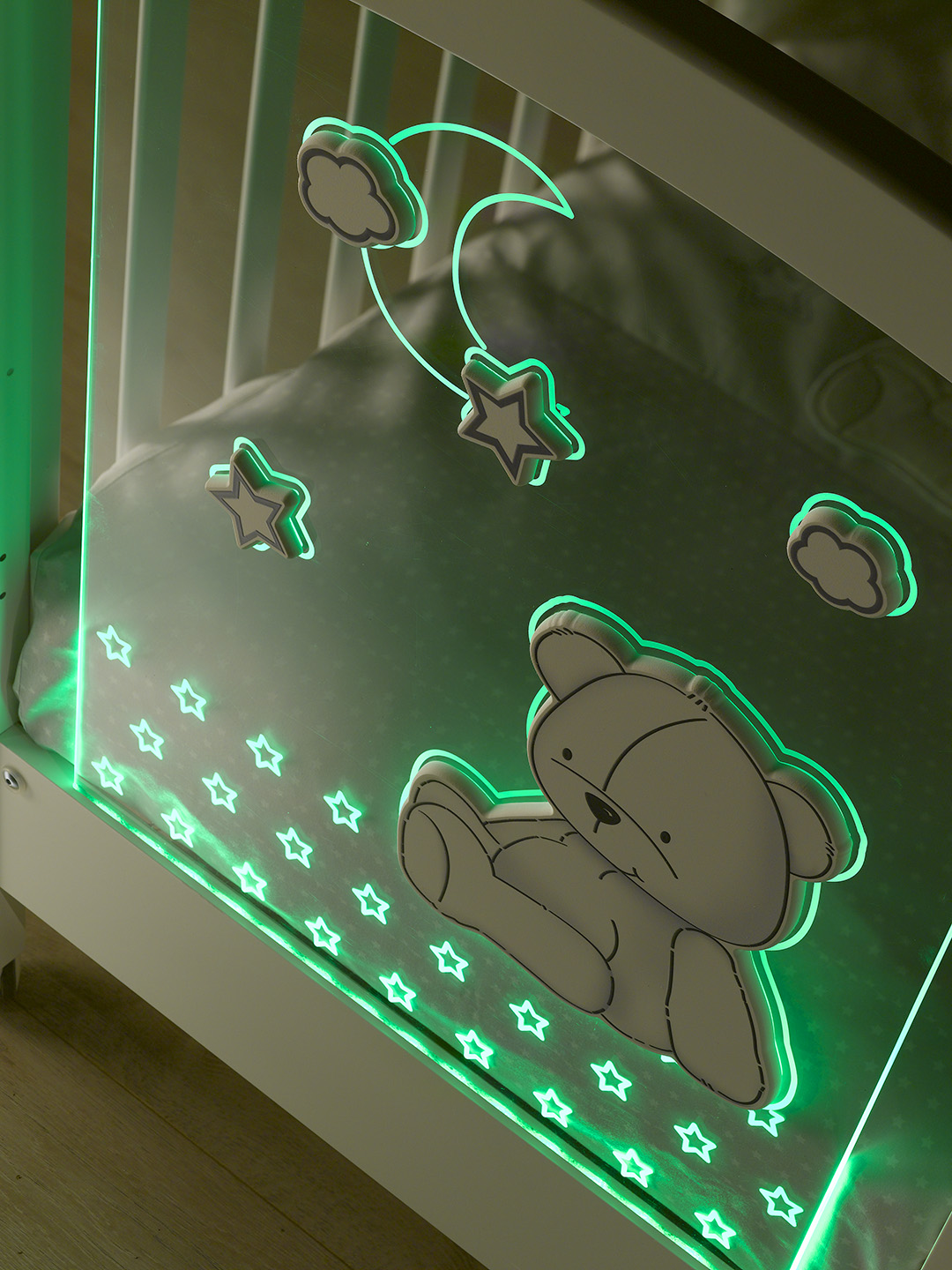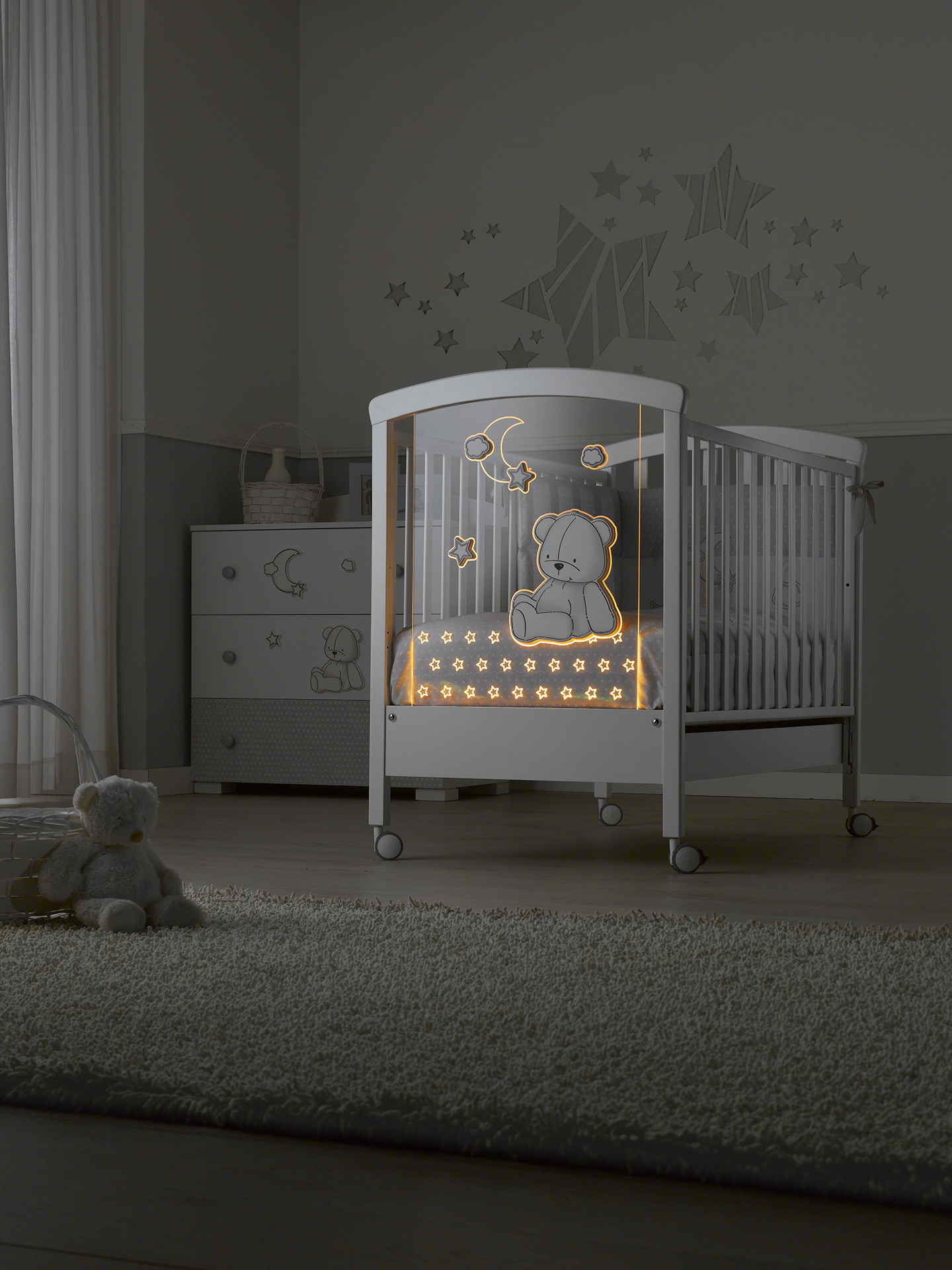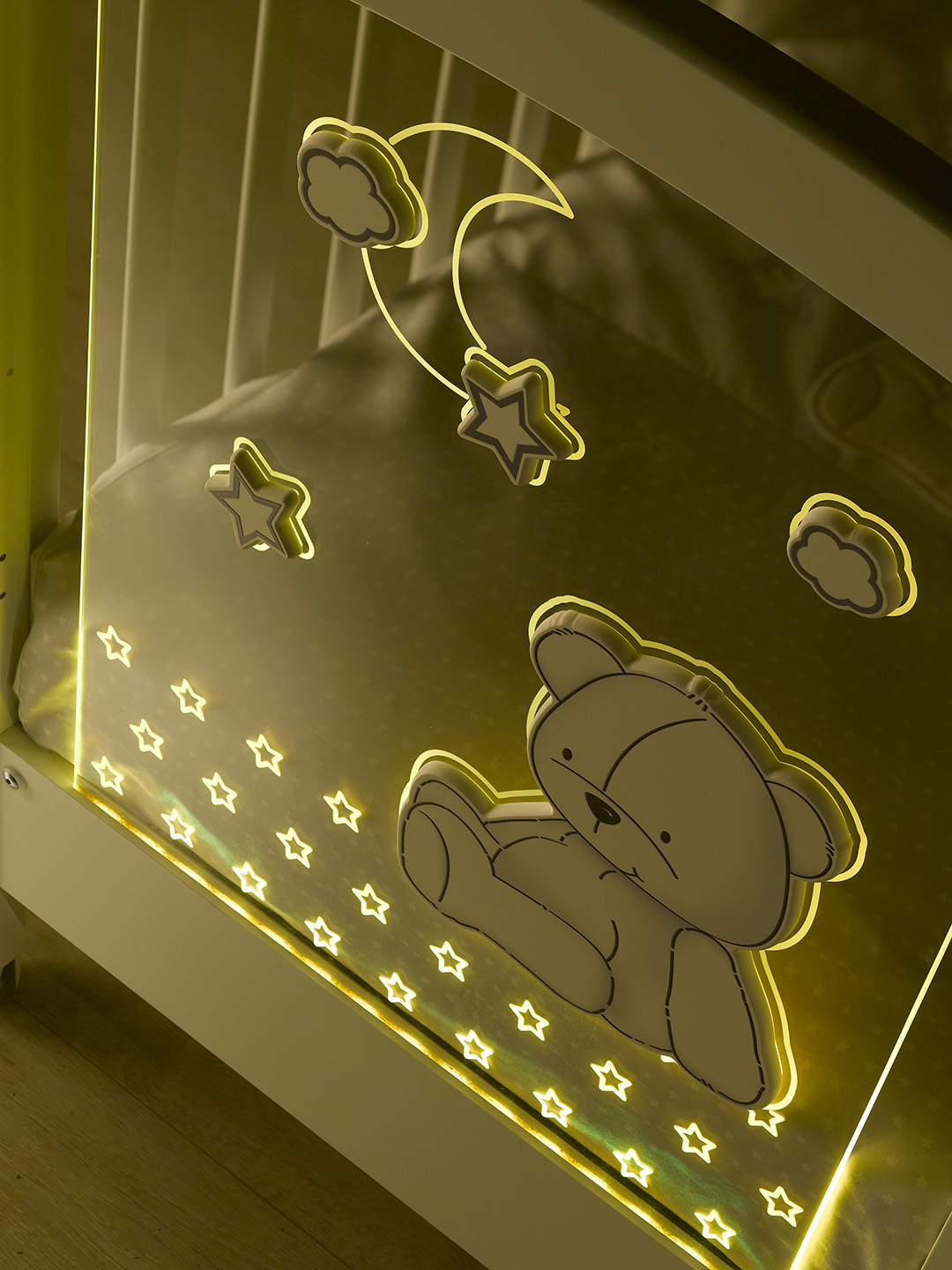 Приятные особенности :Детская кроватка Erbesi Stella Magic LED- основание матраса регулируется в двух различных положениях, самое верхнее положение лучше всего подходит для первых месяцев использования, чтобы облегчить движения мамы, особенно после кесарева сечения. Мы предлагаем закрепить обе боковые направляющие с помощью прилагаемых винтов.Вы можете отрегулировать оба бортика кровати для удобства мамы, когда основание матраса собрано в нижнем положении: потяните боковую направляющую вверх рукой и надавите ногой на нижнюю часть борт, чтобы опустить его вниз. Выполните те же действия, чтобы поднять борт обычное положение. Мы предлагаем зафиксировать один из двух боковин, чтобы придать кроватке большую устойчивость.Как только ребенок подрастет настолько, что сможет самостоятельно вставать и покидать кроватку, вы можете легко снять одну из боковин: опустите борт в нижнее положение при этом потяните его нижнюю часть на себя, пока не услышите щелчок. Штифты с двух сторон боковики выйдут из пазов, потяните борт на себя.Широкий ящик из ДСП, обтянутый ПВХ материалом, удобен в использовании с обеих сторон кроватки.