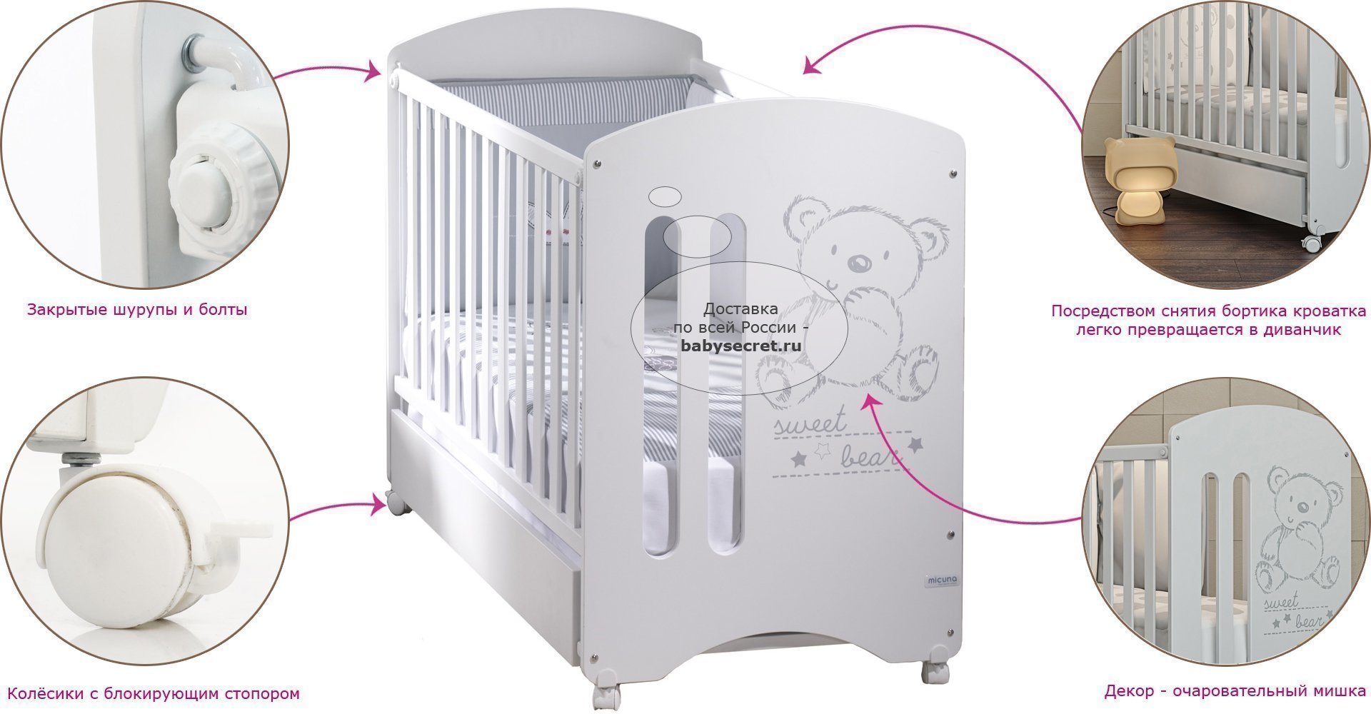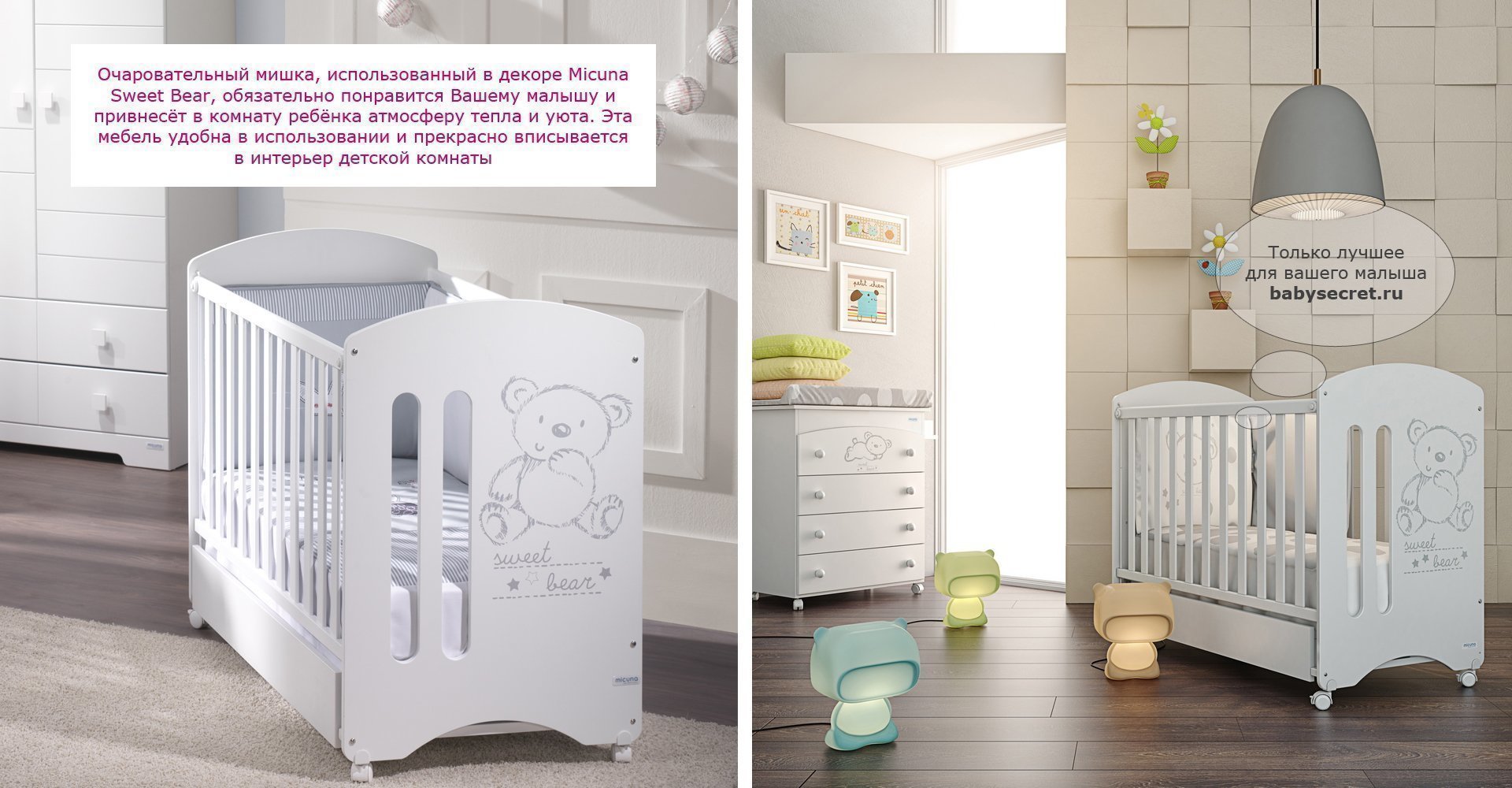 Приятные особенности детской кроватки Micuna Sweet Bear:очаровательный мишка, использованный в декоре Micuna Sweet Bear, обязательно понравится Вашему малышу и привнесёт в комнату ребёнка атмосферу тепла и уюта. Эта мебель удобна в использовании и прекрасно вписывается в интерьер детской комнаты. Кроватки испанской компании Micuna изготавливаются в Валенсии из экологически чистых материалов. В первую очередь, это бук – традиционное дерево для мебели и музыкальных инструментов. Элементы из МДФ – материала, созданного без применения эпоксидных смол и фенола на основе природного полимера лигнина, дополняют конструкцию. Краски и лак, которыми покрывают кроватки, приготовлены из натуральных компонентов и не создают вредных испарений. Матрас Micuna CH-620 способствует правильному развитию позвоночника ребёнка: упругий и гибкий, не слишком мягкий и не слишком жесткий. Гипоаллергенный наполнитель матраса – пенополиуретан – хорошо подходит для детских кроваток. Он не выделяет вредных испарений, не крошится, не собирает пыль, не отсыревает. Чехол матраса изготовлен из особой ткани – микрофибры: благодаря высокой плотности полотна она меньше пачкается и меньше пылится, чем традиционный хлопок. Микрофибра является неблагоприятной средой для размножения бактерий и клещей, а потому редко становится причиной аллергии.
