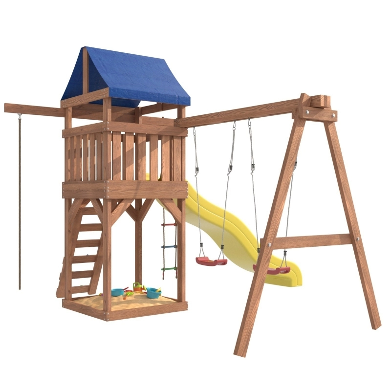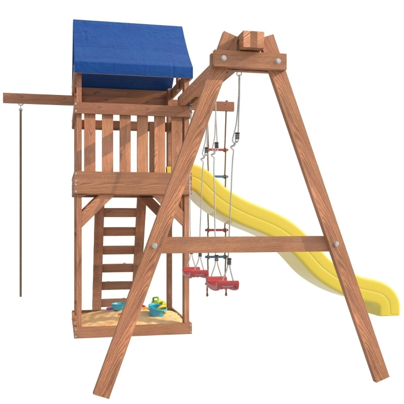 Приятные особенности:Детская площадка IgroWoods - отличное решение для активного отдыха детей на свежем воздухе. Она представляет собой многофункциональный игровой комплекс, который включает в себя горку, качели, песочницу, игровую веранду, веревочную лестницу, скалодром и канат. Все элементы выполнены из качественных и безопасных материалов, что обеспечивает долговечность и надежность конструкции.Детская игровая площадка является многофункциональным спортивным игровым комплексом для детей от 3 до 14 лет.С помощью этой площадки дети смогут развить свою физическую форму, координацию движений и логическое мышление. Кроме того, игры на свежем воздухе способствуют укреплению иммунитета и улучшению общего состояния здоровья детей.Садовые качели подвесные для улицы детские и взрослые, подойдут абсолютно для всех, так как качельная балка и полиуретановые канаты выдерживают общий вес до 250 кг. На уличных дачных качелях вы можете расслабиться и отдохнуть у себя в саду и провести время со своим ребенком.Площадка изготавливается из лесоматериалов лиственных и хвойных пород. Материал имеет естественную древесную текстуру, обработан специальными составами для большего срока использования и предохранения от разрушения древесины. Все элементы проходят предварительную шлифовку, а края изделия закруглены. Небольшое количество металлических элементов значительно исключает возможность получения ребенком травм.