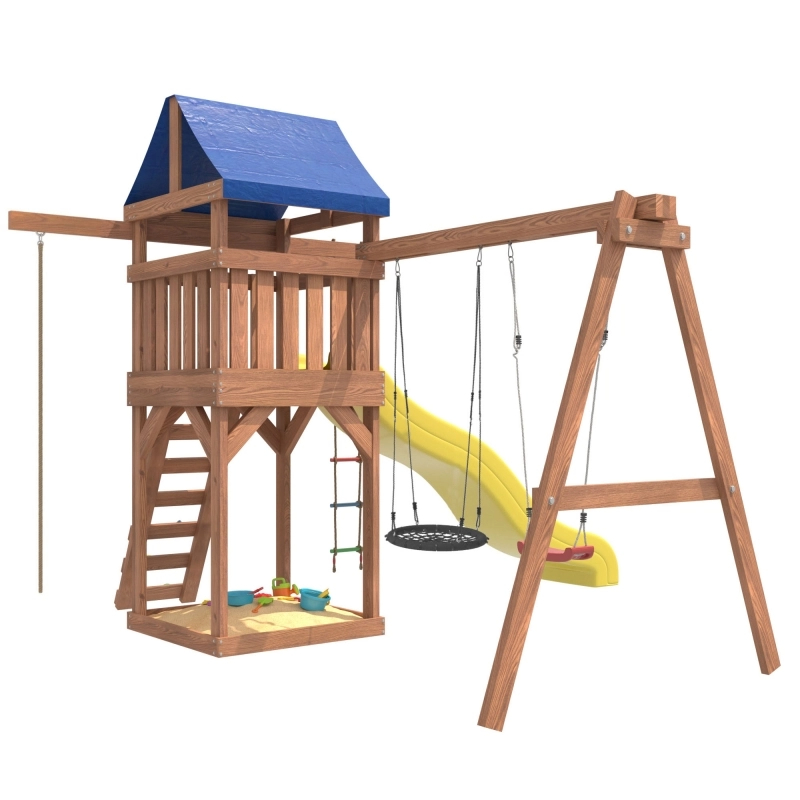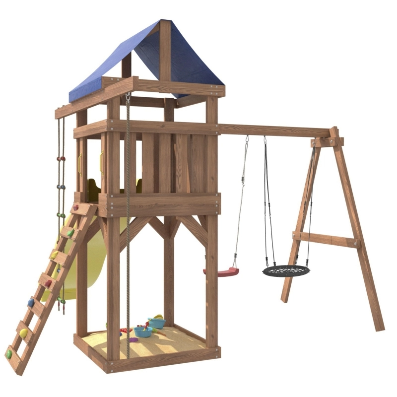 Приятные особенности: Детская площадка IgroWoods - отличное решение для активного отдыха детей на свежем воздухе. Она представляет собой многофункциональный игровой комплекс, который включает в себя горку, качели, песочницу, игровую веранду, веревочную лестницу, скалодром и канат. Все элементы выполнены из качественных и безопасных материалов, что обеспечивает долговечность и надежность конструкции. Детская игровая площадка является многофункциональным спортивным игровым комплексом для детей от 3 до 14 лет. С помощью этой площадки дети смогут развить свою физическую форму, координацию движений и логическое мышление. Кроме того, игры на свежем воздухе способствуют укреплению иммунитета и улучшению общего состояния здоровья детей. Садовые качели подвесные для улицы детские и взрослые, подойдут абсолютно для всех, так как качельная балка и полиуретановые канаты выдерживают общий вес до 250 кг. На уличных дачных качелях вы можете расслабиться и отдохнуть у себя в саду и провести время со своим ребенком. Площадка изготавливается из лесоматериалов лиственных и хвойных пород. Материал имеет естественную древесную текстуру, обработан специальными составами для большего срока использования и предохранения от разрушения древесины. Все элементы проходят предварительную шлифовку, а края изделия закруглены. Небольшое количество металлических элементов значительно исключает возможность получения ребенком травм.