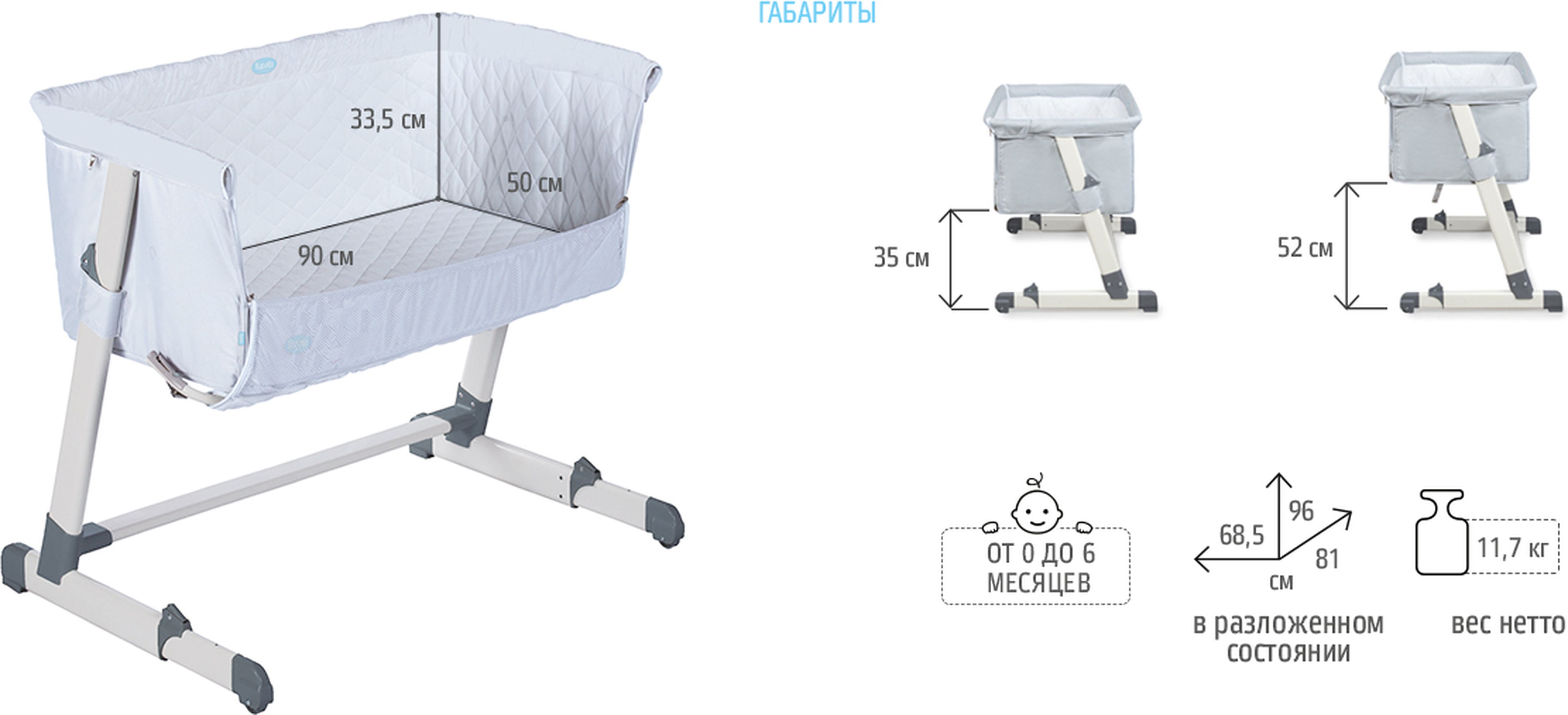 Общие размеры:размер спального места 50*90 смвысота бортиков 33 смразмер изделия 81*68,5*96 смрегулировка по высоте в 5 положениях в диапазоне 35-52 смвес 11,7 кг.