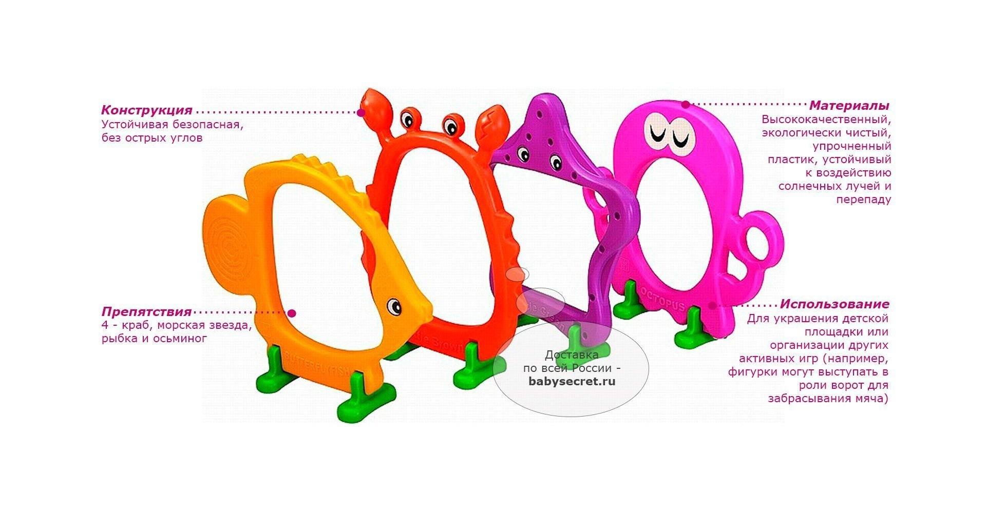 Приятные особенности детской эстафетыLerado LA-629:набор препятствий для эстафеты Lerado - яркий и привлекательный комплект фигурок морских обитателей, каждая из которых снабжена большим отверстием в центре. Во время игры малыш должен преодолеть препятствия пройдя через эти отверстия. Помимо этого вы можете использовать набор для украшения детской площадки или организации других активных игр (например, фигурки могут выступать в роли ворот для забрасывания мяча). Благодаря тому, что препятствия изготовлены из морозостойкого пластика и покрыты красителями, устойчивыми к осадкам, истиранию, ультрафиолету, температурным перепадам и механическим воздействиям, их можно использовать как в помещении, так и на улице.