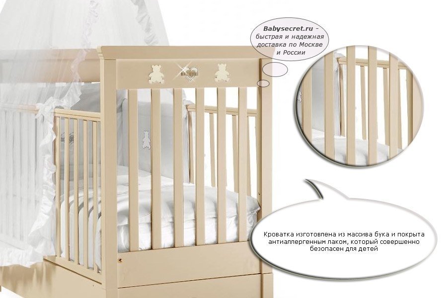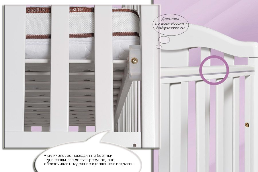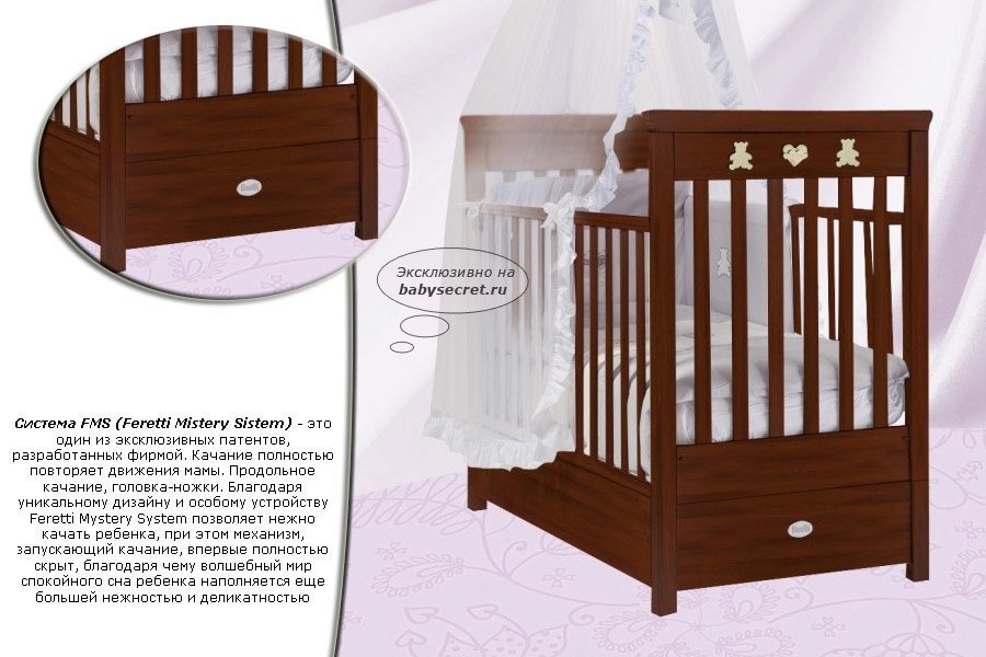 Приятные особенности кроватки Feretti Elite FMS:детская кроватка с маятниковым механизмом Feretti Mistery Sistem (FMS). Кроватка изготовлена из массива бука и покрыта антиаллергенным лаком, который совершенно безопасен для детей. Так же за безопасность отвечают и силиконовые накладки, которые специально предусмотрены для того, чтобы ребенок не повредил свои молочные зубки в момент, когда ему захочется попробовать на вкус свою любимую кроватку, а отсутствие острых углов предохранит его от ударов. Два уровня высоты позволяют регулировать ортопедическое ложе по мере взросления малыша, а переднюю стенку можно будет убрать, когда она не понадобится.