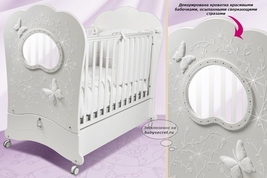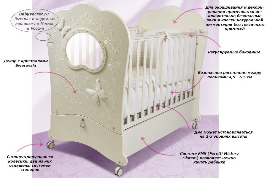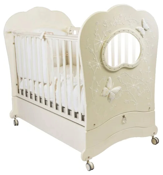 Приятные особенности детской кроватки Feretti FMS Oblo Charme Brillante продольный маятник:эксклюзивная детская кроватка с продольным маятником. Роскошная детская кроваткаFeretti Oblo Charme Brillante изготовлена из массива бука и украшена цветочным орнаментом, объемной аппликацией из вышитого тюля в виде бабочек и сверкающими стразами. При производстве используются только гипоаллергенные и нетоксичные материалы. Регулируемые реечные боковины имеют безопасное расстояние между собой и обеспечивают естественное проветривание. Ортопедическое основание регулируется по высоте, фиксируясь в двух возможных положениях. Имеется выдвижной ящик, в котором можно хранить постельное белье или игрушки.