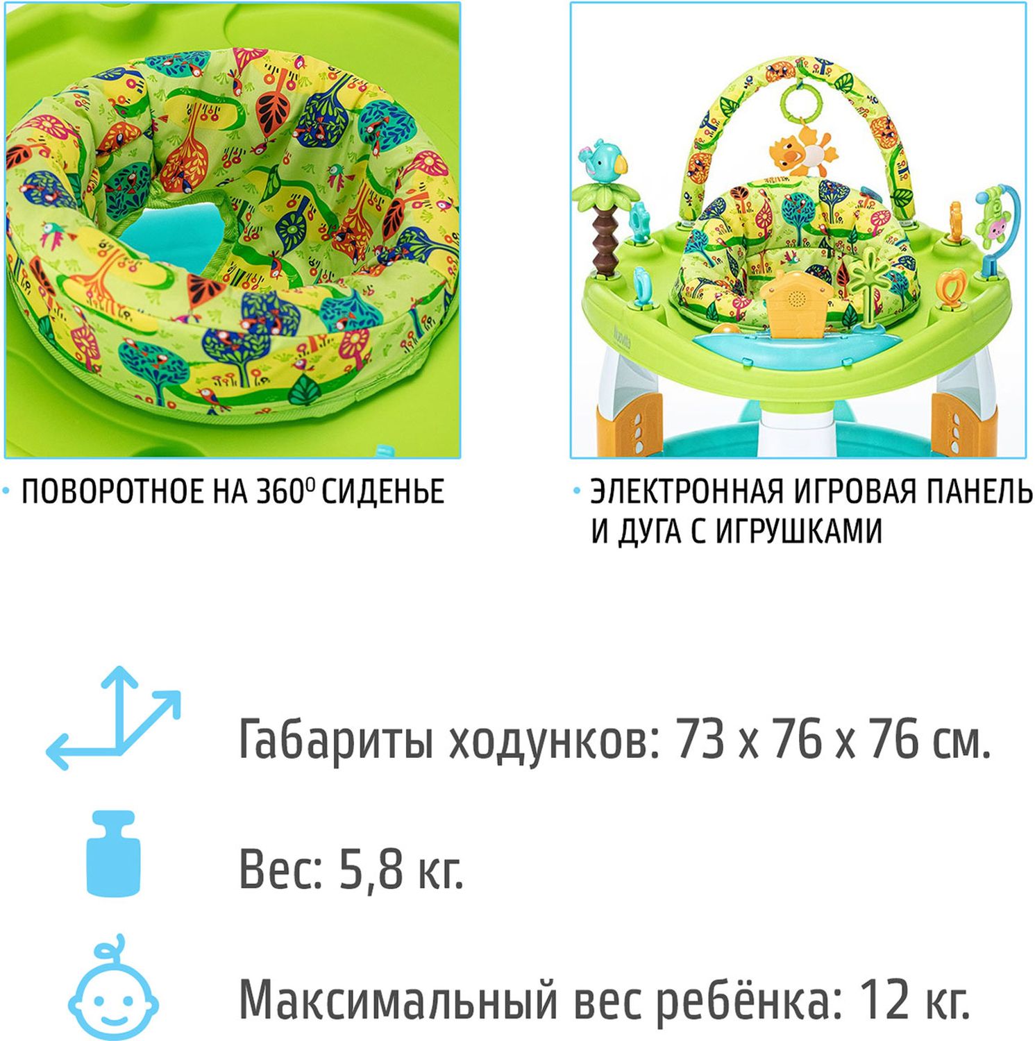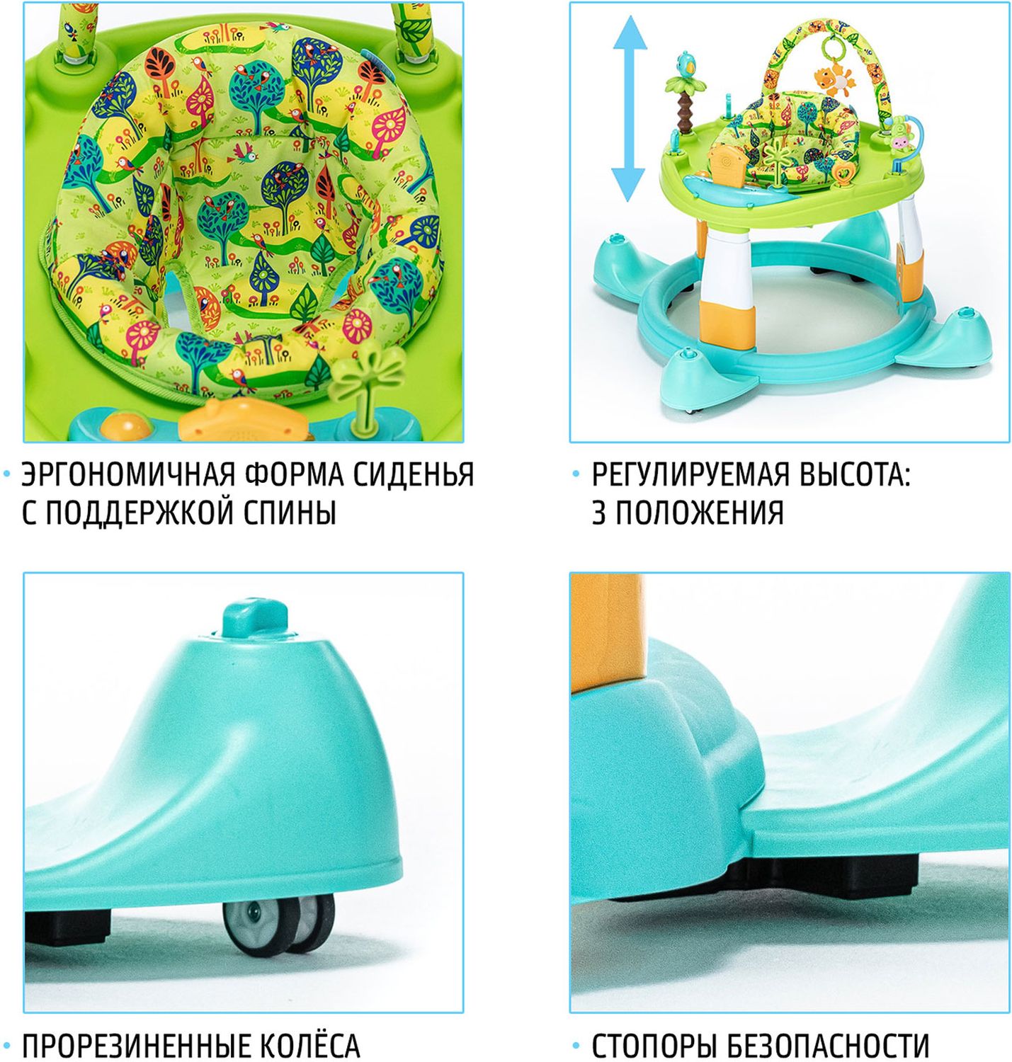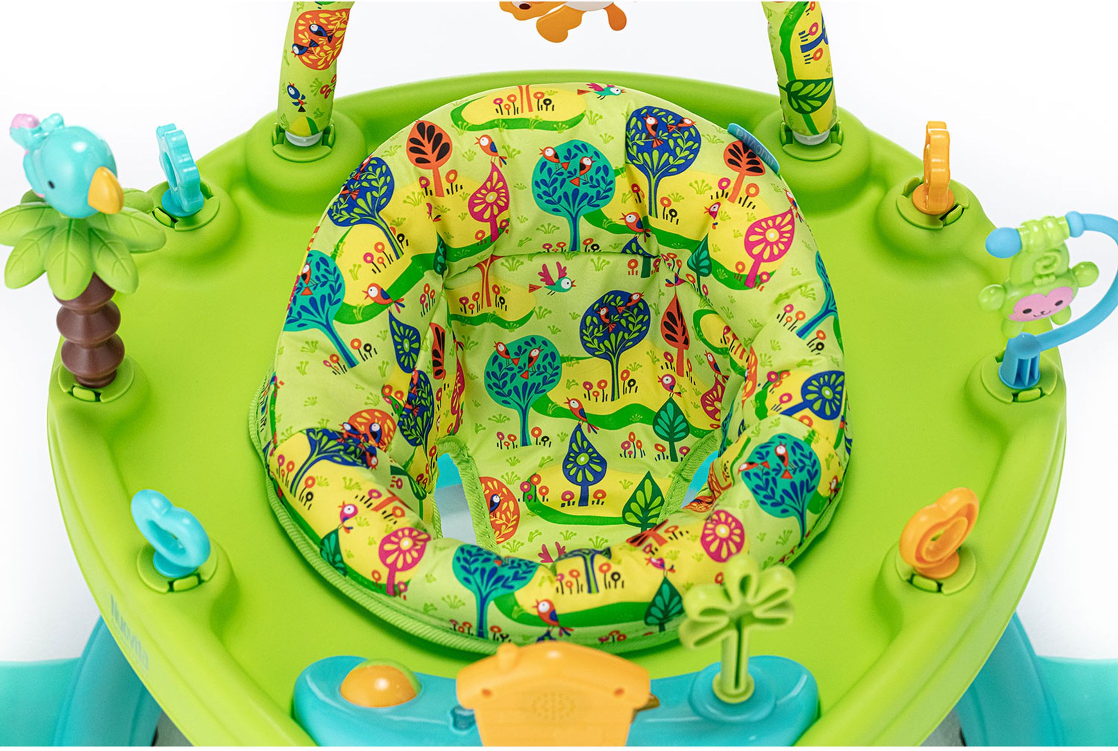 Мягкое сиденье с высокой спинкой является поворотным и позволяет малышу развернуться именно в том направлении, где расположен объект его внимания. Предусмотрена регулировка по высоте, поэтому родителям не составит труда подобрать уровень расположения сиденья в соответствии с ростом малыша. Это даст возможность добиться того, чтобы ребенок опирался на пол всей стопой, и исключить передвижение на цыпочках.