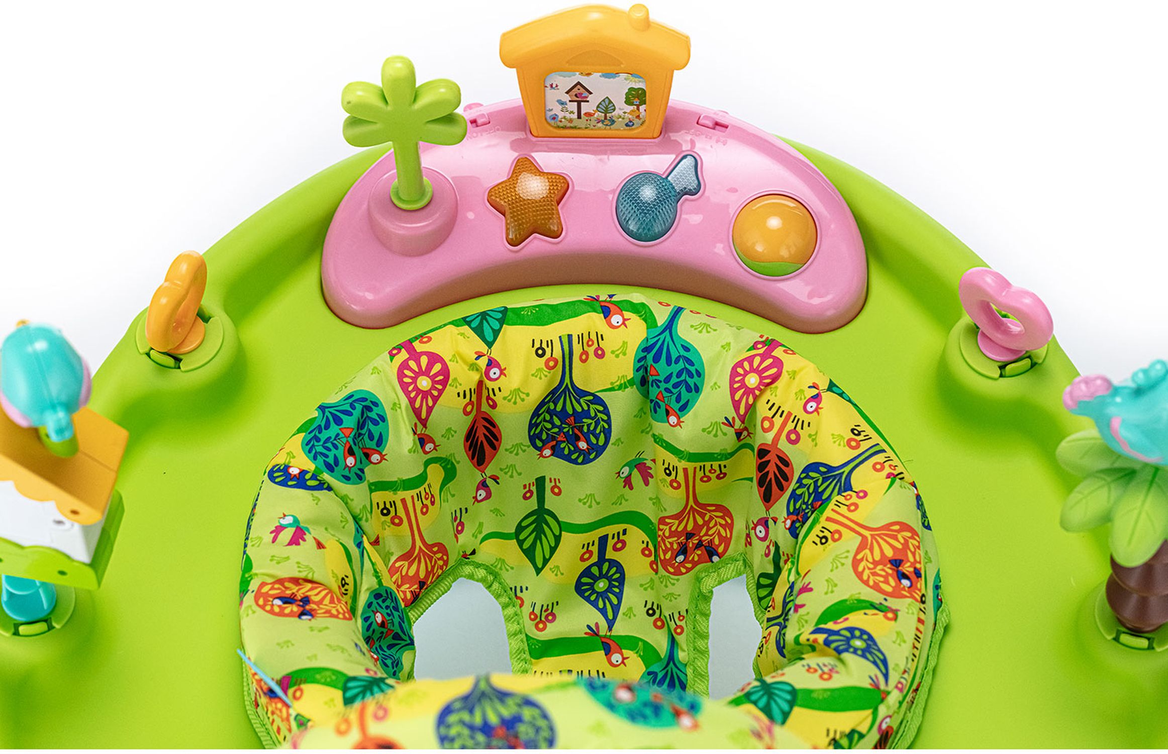 Столик с яркими развивающими игрушками, среди которых фигурки животных и растений, игрушечные домики, а также дуга с подвесной игрушкой, дополнен свето-музыкальным блоком. На консоли расположены кнопки в форме звезды и ноты, при нажатии на которые играет музыка, и загораются огоньки. Последовательно нажимая на кнопки, можно включать и выключать 8 мелодий, что развивает мелкую моторику и зрительную координацию ребенка, а также стимулирует осознание причинно-следственных связей.
