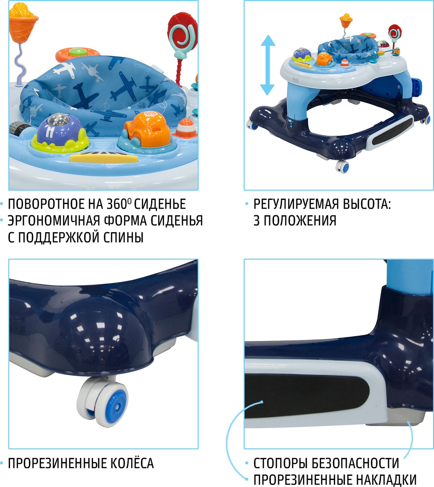 Предусмотрено 3 положения, поэтому для растущего малыша всегда можно подобрать оптимальный уровень, добиваясь, чтобы при ходьбе он ставил ножки на всю стопу. Дополнительными преимуществами являются функции батута и качалки, которые приводят в восторг каждого малыша. Удовольствие еще более усиливается, когда родители активируют поворотную функцию сиденья, что позволяет ребенку самостоятельно разворачиваться в любую из сторон. Перед тем, как использовать изделие в качестве ходунков, поворотная функция сиденья блокируется. Для трансформации в качалку достаточно отогнуть боковые дуги основания и закрепить на раме изделия коврик-батут.
