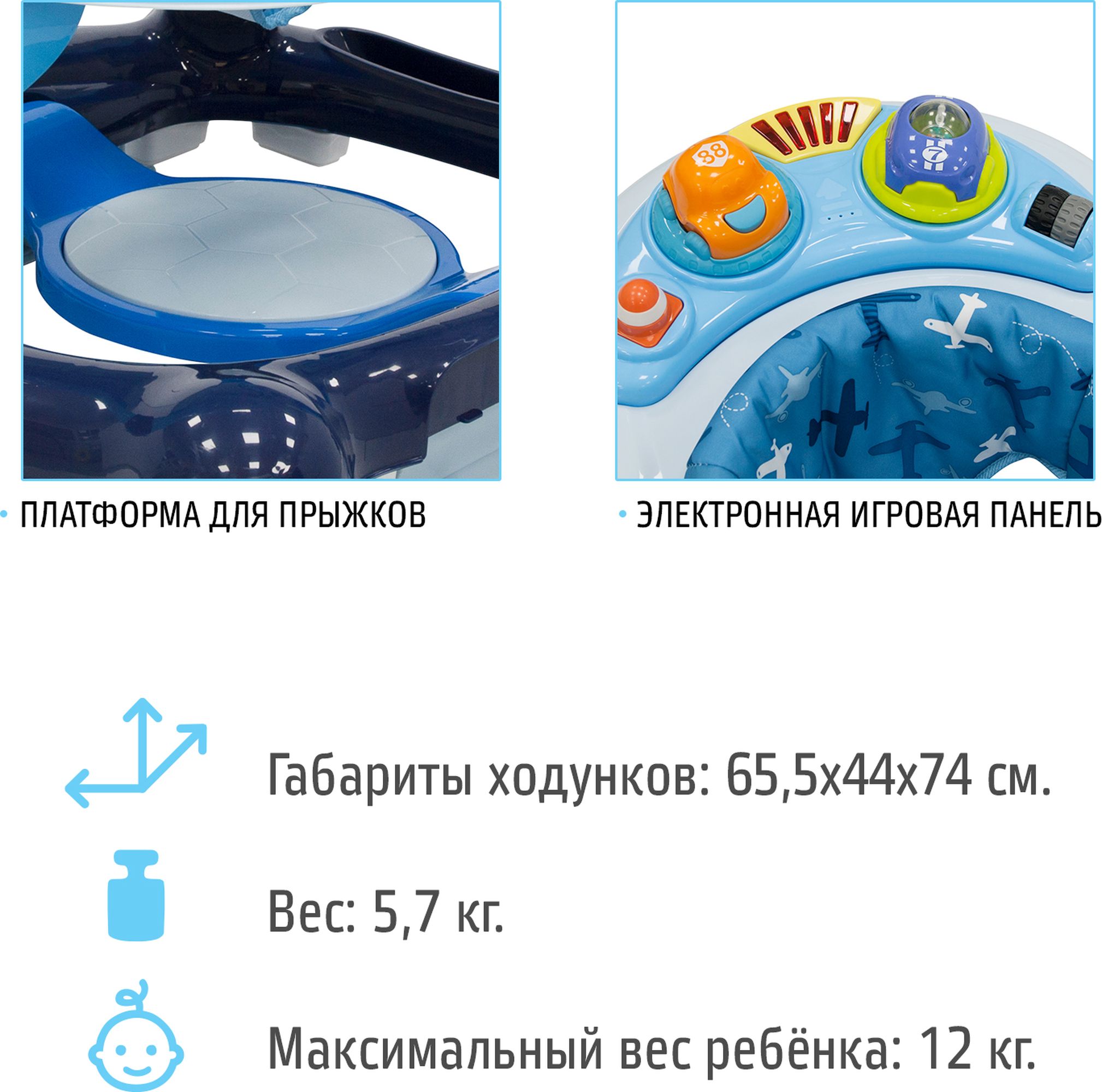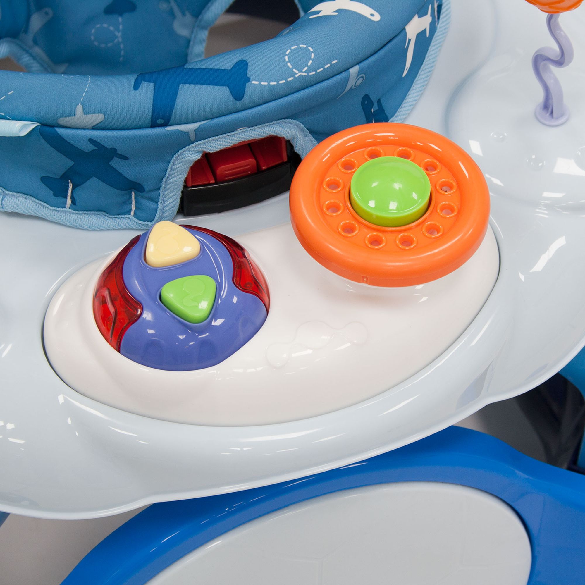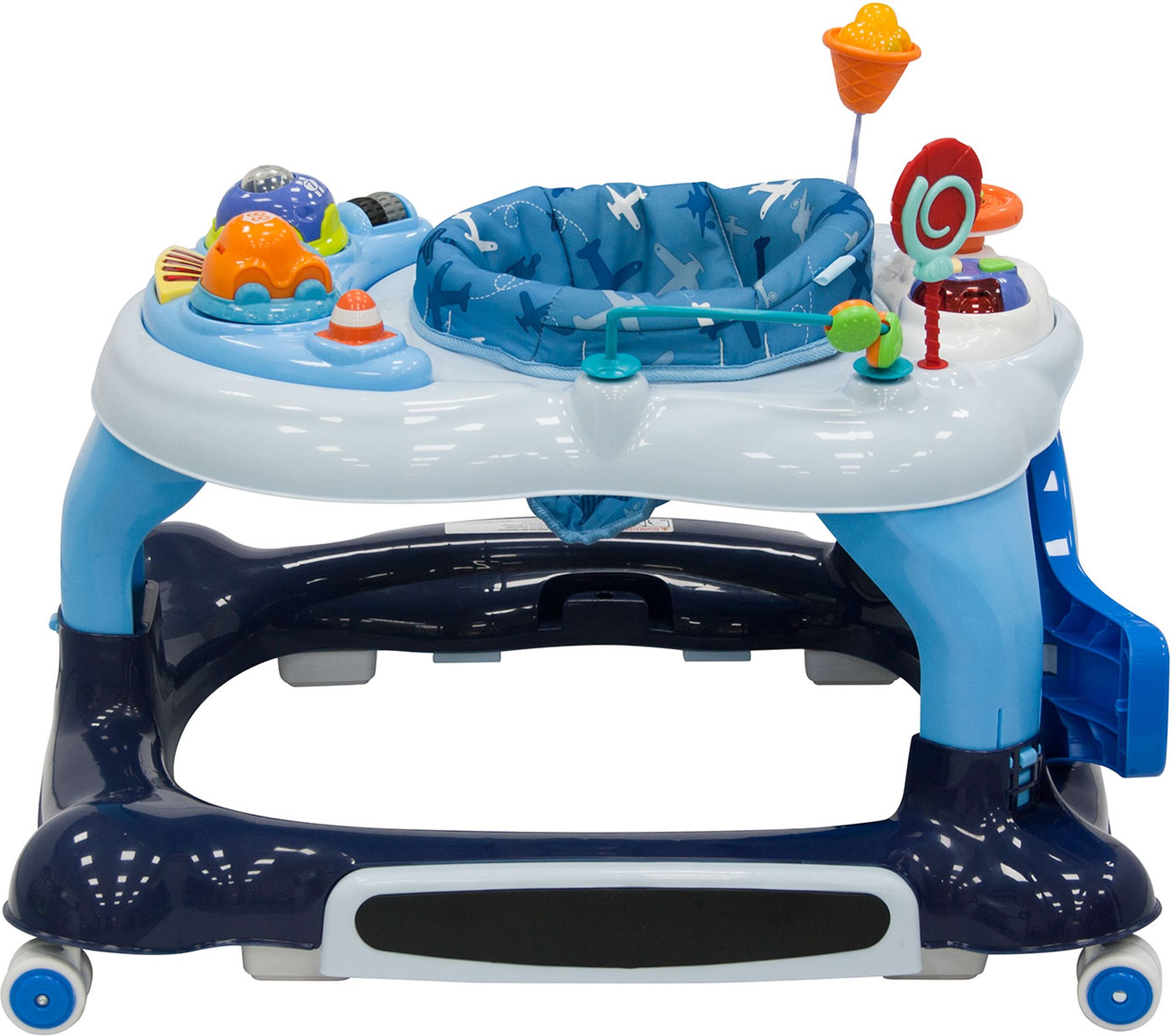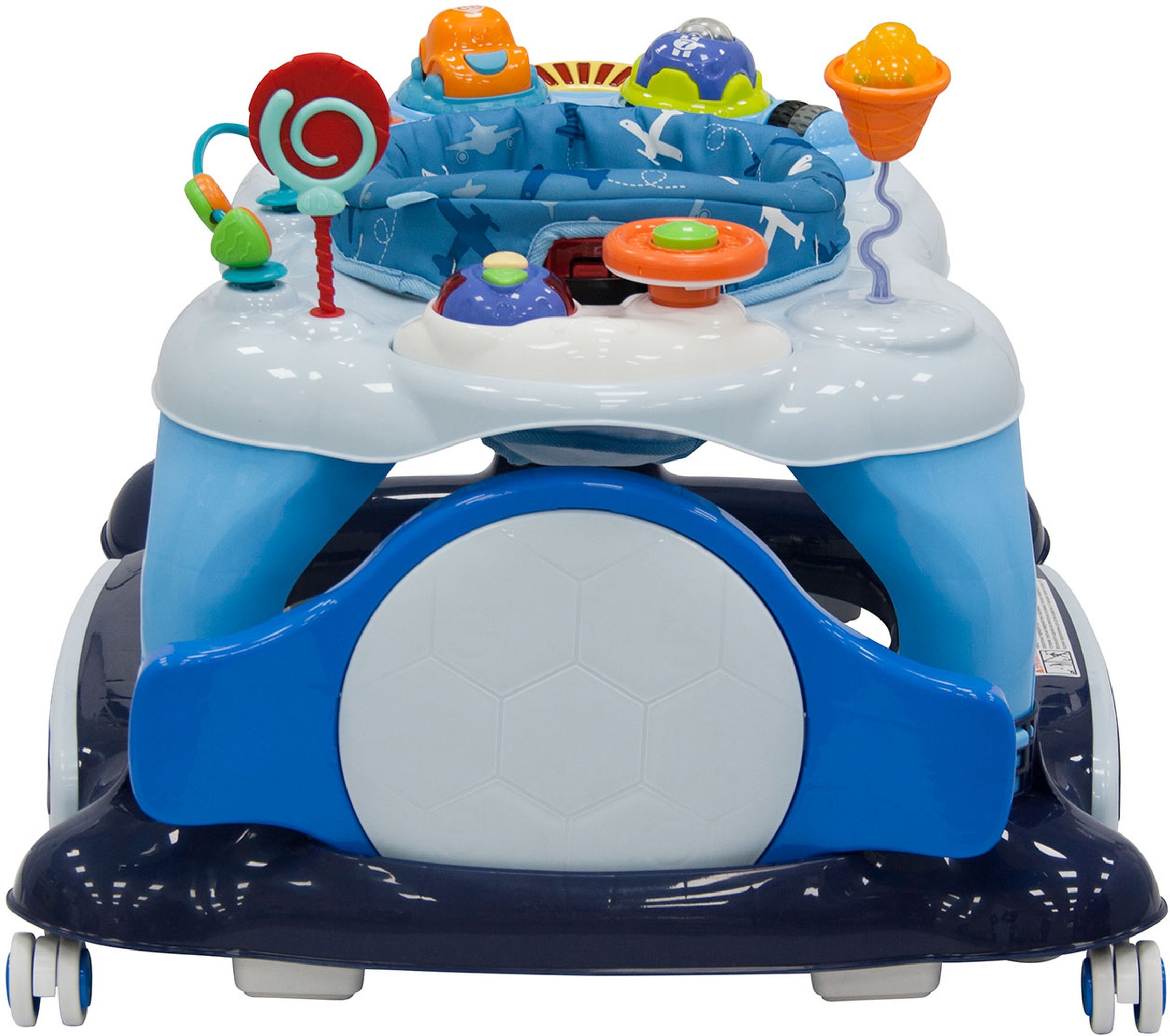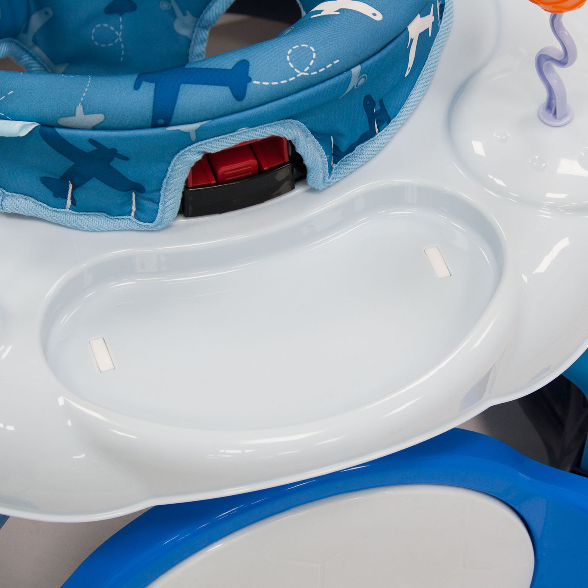 Яркие интересные игрушки, среди которых машинки, световые и звуковые кнопки, дуга с шариками и всевозможные «грызунки», закреплены как спереди, на специальной электронной панели, так и сзади. С их помощью в процессе игры ребенок всесторонне развивает координацию движений, сенсорику, звуковые и тактильные ощущения. Тканевое сиденье является съемным, его рекомендуется стирать в ручном режиме при t 30 градусов. Пластиковые элементы можно чистить при помощи губки с мягким моющим средством.