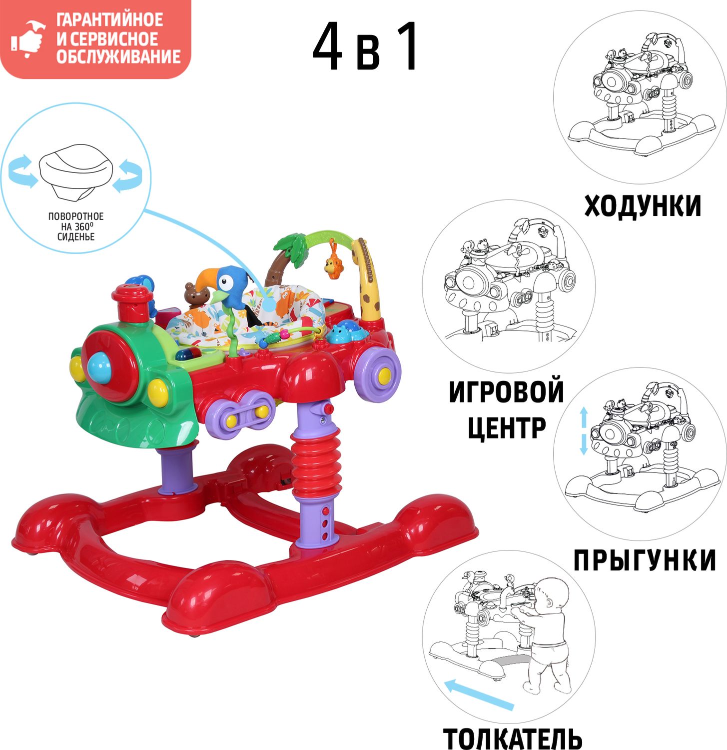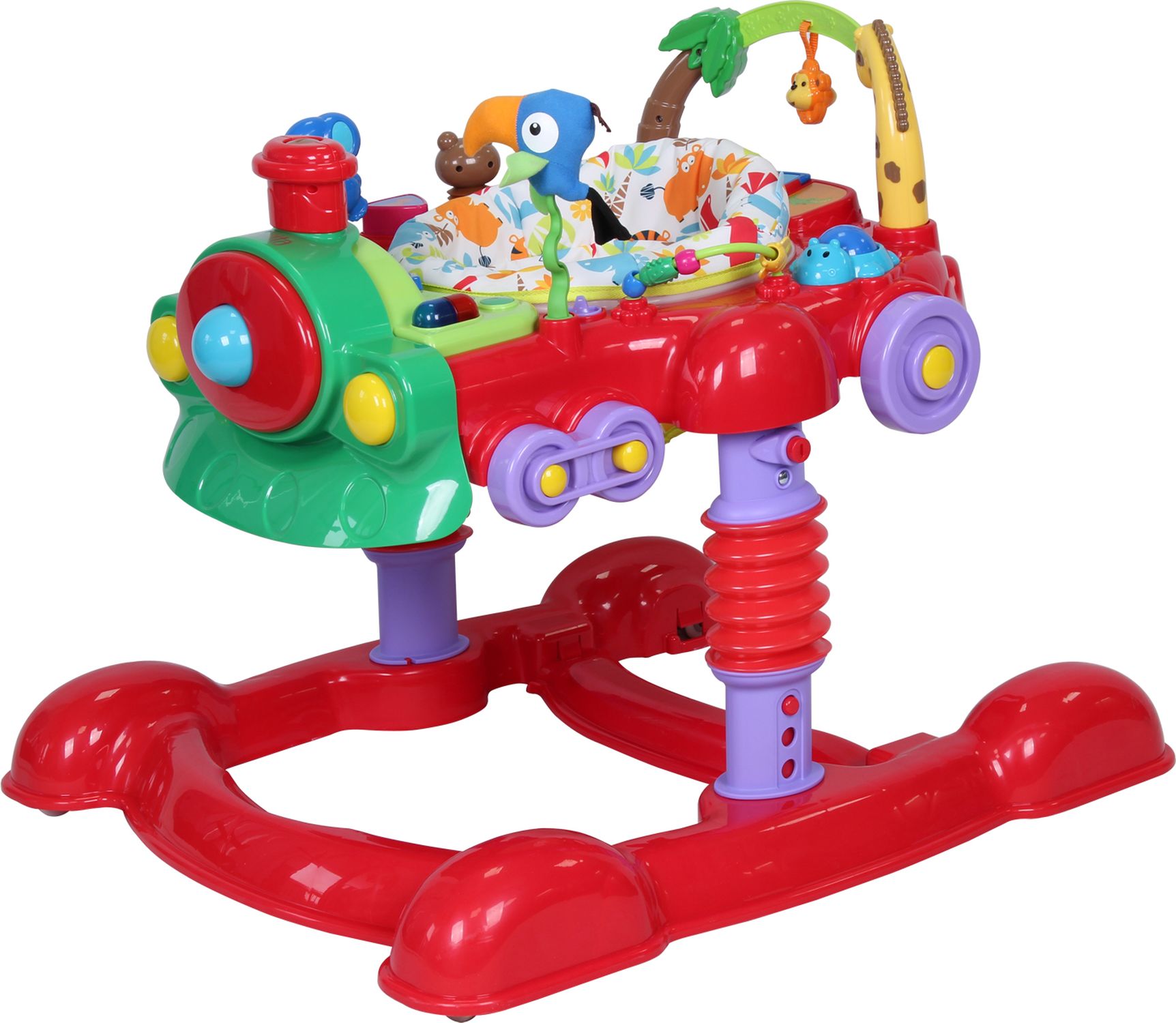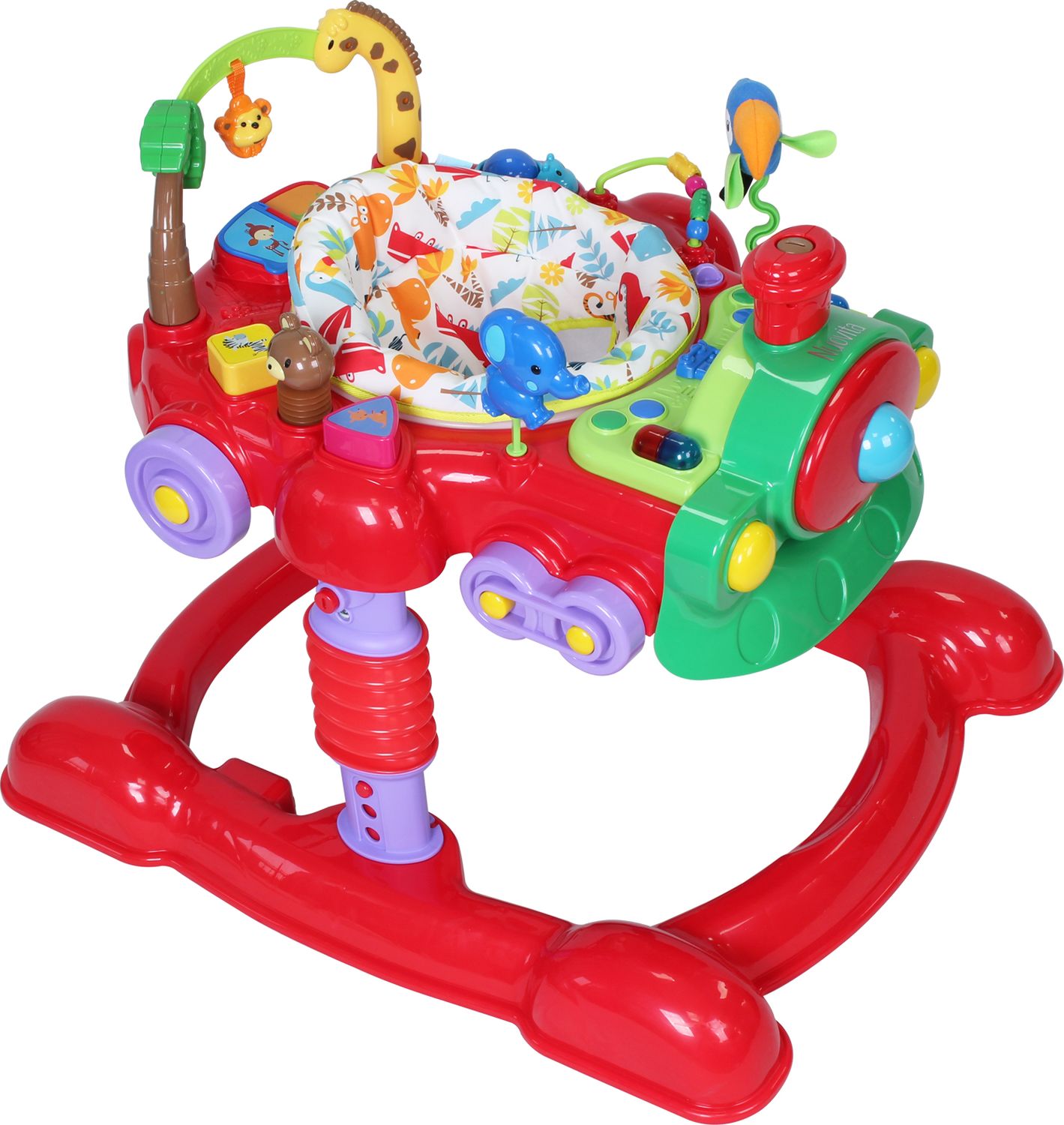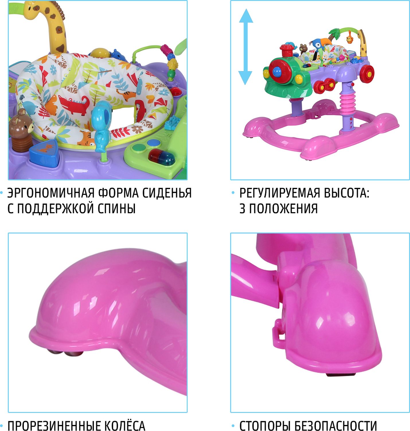 Верхняя панель ходунков выполнена в виде красочного паровозика: присутствуют декоративные колеса, труба и игрушечный свисток. Игровая консоль, которая работает от батареек, подчеркивает впечатление соответствующим свето-звуковым сопровождением: при нажатии на кнопки мигают огоньки, звучат звуки едущего паровозика и музыкальные мелодии. Игровая консоль привлекает внимание различными игрушками: фигурками животных и кнопками всевозможных геометрических форм, что помогает ребенку в развитии осязания, зрительного восприятия, обучает взаимодействию глаз и рук.