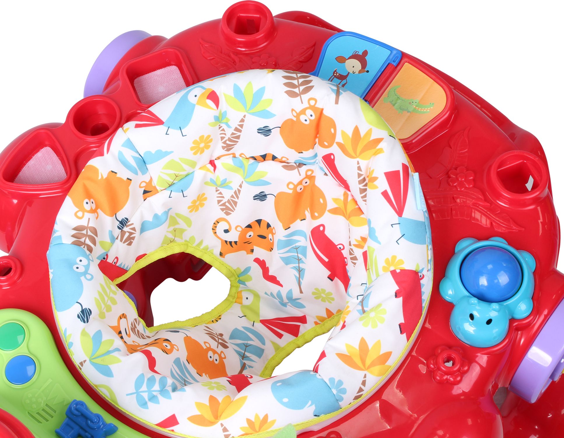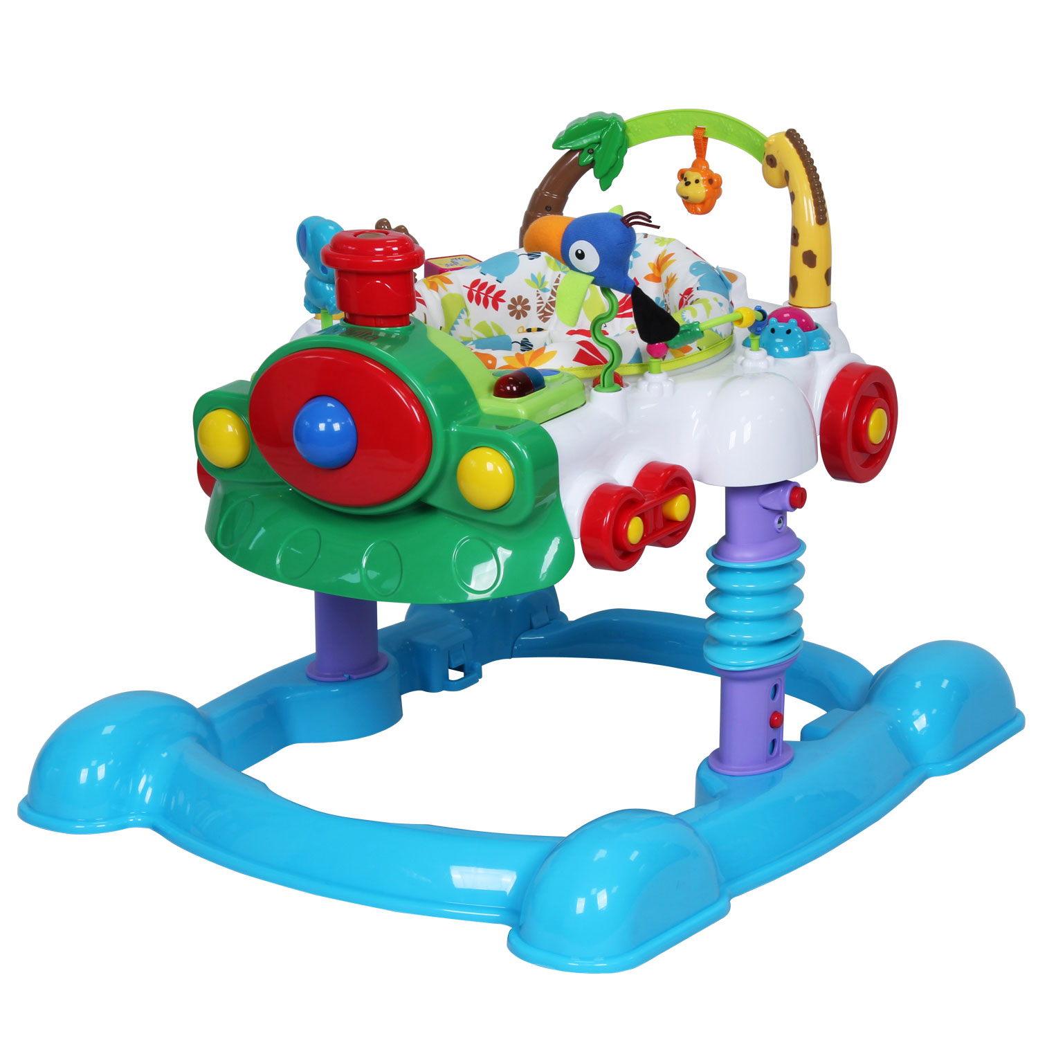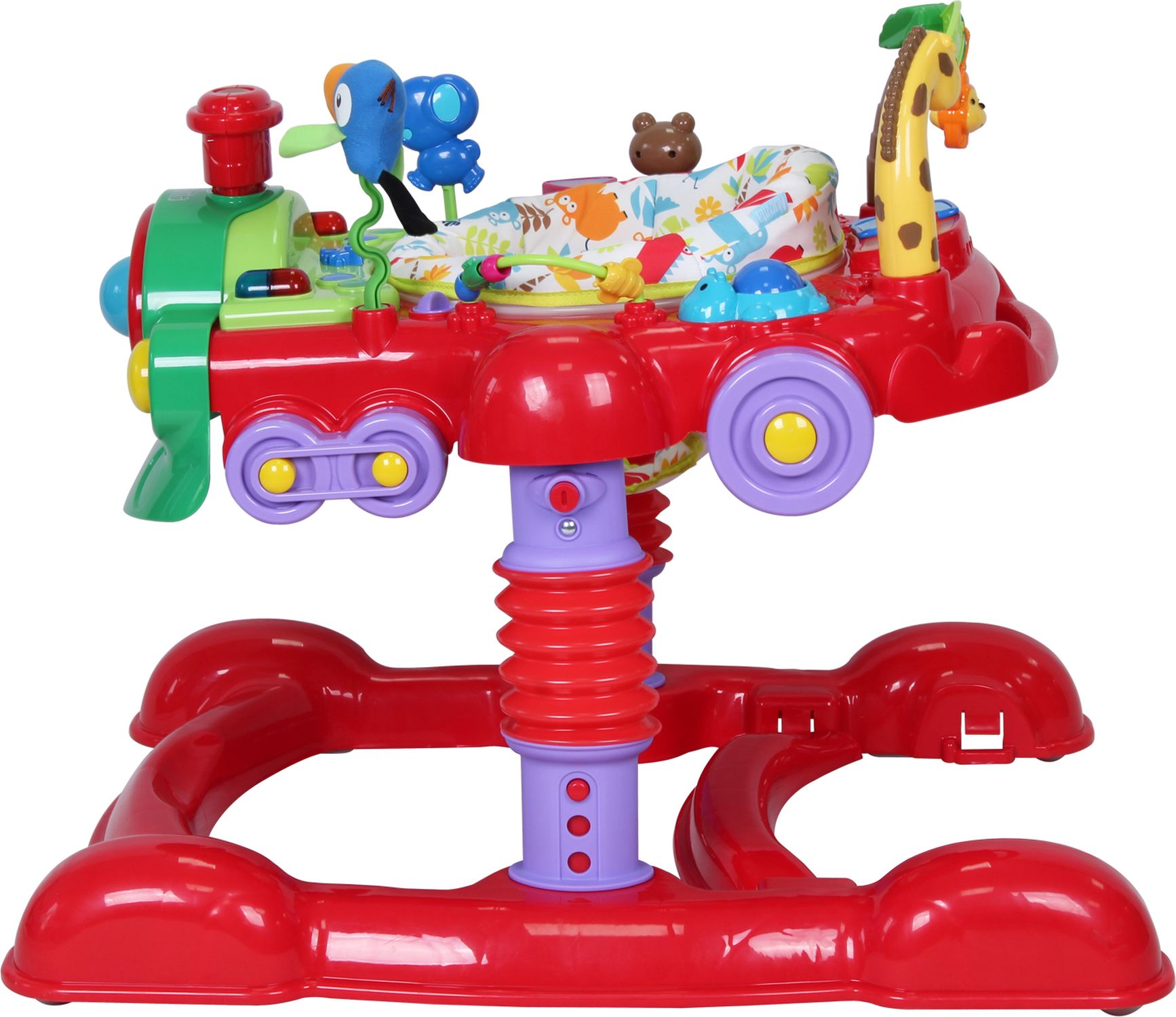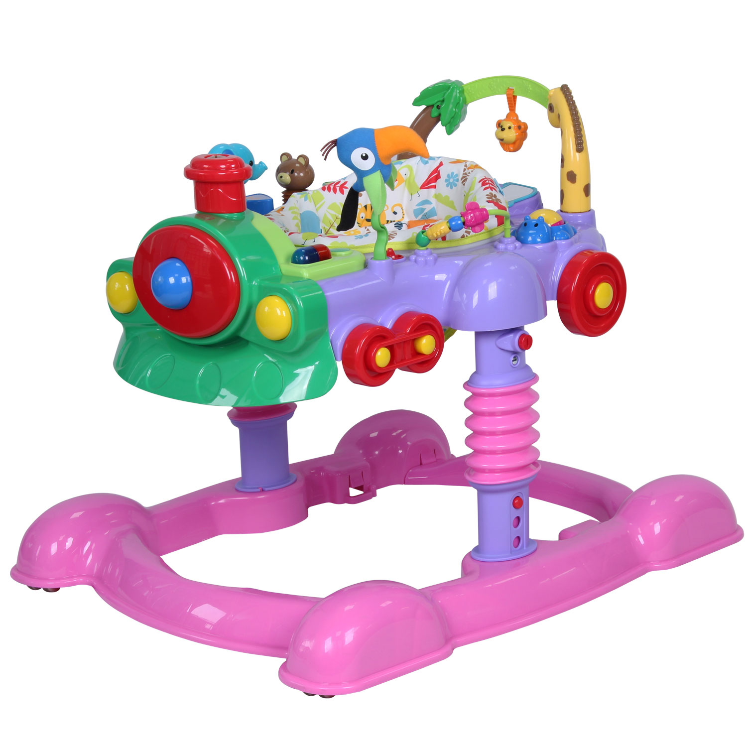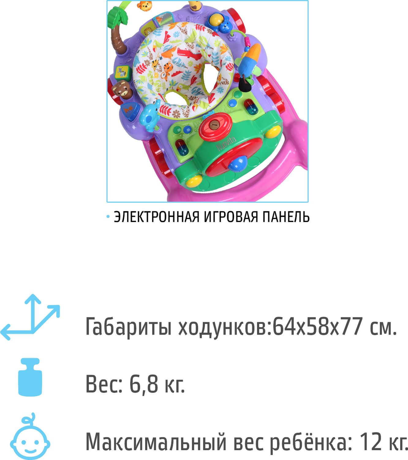 Верхняя панель ходунков выполнена в виде красочного паровозика: присутствуют декоративные колеса, труба и игрушечный свисток. Игровая консоль, которая работает от батареек, подчеркивает впечатление соответствующим свето-звуковым сопровождением: при нажатии на кнопки мигают огоньки, звучат звуки едущего паровозика и музыкальные мелодии. Игровая консоль привлекает внимание различными игрушками: фигурками животных и кнопками всевозможных геометрических форм, что помогает ребенку в развитии осязания, зрительного восприятия, обучает взаимодействию глаз и рук.