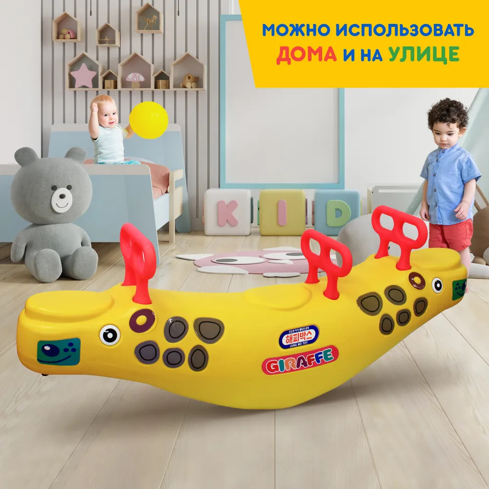 Приятные особенности:Детские качели Giraffe Seesaw от корейского бренда Happy Box подарят малышам радость, позитивные эмоции и отличное настроение. Это качалка-балансир, на которой одновременно могут раскачиваться 3-е детей, и каждому из них будет удобно и комфортно. Детские качели сделаны в виде очаровательного жирафа, который покатает малышей на своей длинной шее - во время веселой игры они смогут тренировать ловкость, навыки координации и чувство баланса. Детские качели изготовлены из прочного и экологически безопасного материала. Высококачественный пластик хорошо сохраняет форму, не боится влаги и прост в уходе. Надежное основание обеспечивает устойчивость, качание выполняется мягко, плавно и равномерно. Особое внимание в конструкции уделяется безопасности малышей: изделие не имеет острых углов и металлических деталей, ручки, за которые держаться дети, сделаны в форме колец. Детские качели удобны как для дома, так и для дачи, и рассчитаны на длительный срок использования - южнокорейское качество хорошо известно и высоко ценится во всем мире.