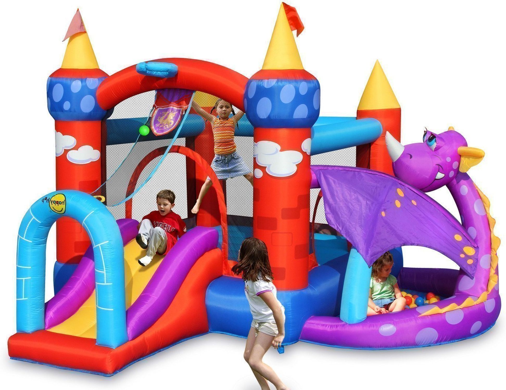 Приятные особенности детского надувного батута Happy Hop Дракоша 9022: каждый день превратит в настоящую сказку для Ваших детей. На нем можно веселиться и прыгать вместе с друзьями, наперегонки скатываться с горки, нырять и бороться в пластмассовых шариках внутри настоящего дракона. Но кроме этого каждая девочка может почувствовать себя прекрасной принцессой, которую похитил коварный дракон. А каждый мальчик в одночасье может превратится в рыцаря и спасителя-любые преображения внутри собственной сказки, которую веселые друзья сочинят вместе!Батут выполнен из качественных материалов. Оснащен защитной сеткой, оберегающей от падений. Насос (нагнетатель воздуха) должен работать все время пока дети играют на батуте!