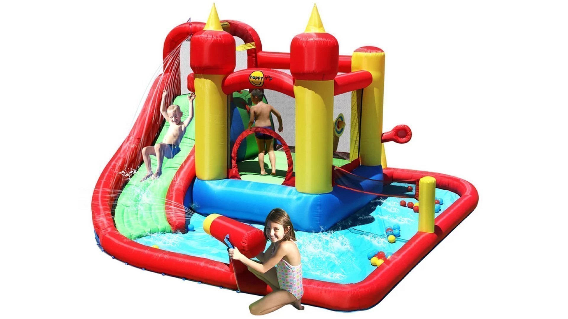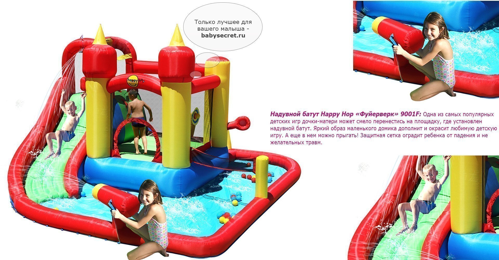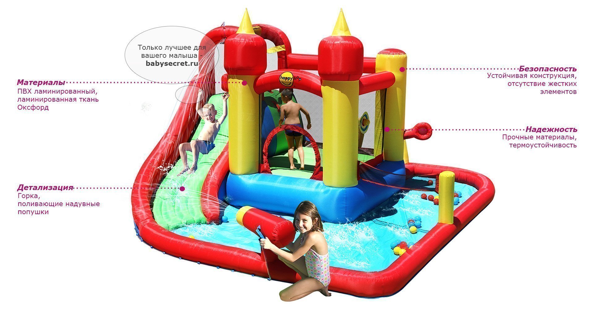 Приятные особенности детского надувного батута Happy Hop:свежий воздух, активное движение и хорошее настроение – то, что хочется обеспечить своему ребенку каждый день, особенно когда он растет и развивается! Очень легко этого добиться, если у вас во дворе установлен детский надувной батут.Батут дает возможность организовать досуг сразу группе детей – это очень удобно для родителей. Поверхность для прыжков выполнена из качественного ПВХ ламинированного материала. На горках используется ПВХ ламинированная ткань Оксфорд, обеспечивающая скользящую поверхность. Батут легко установить и демонтировать. Надувается менее чем за минуту. Насос (нагнетатель воздуха) должен работать все время пока дети играют на батуте!