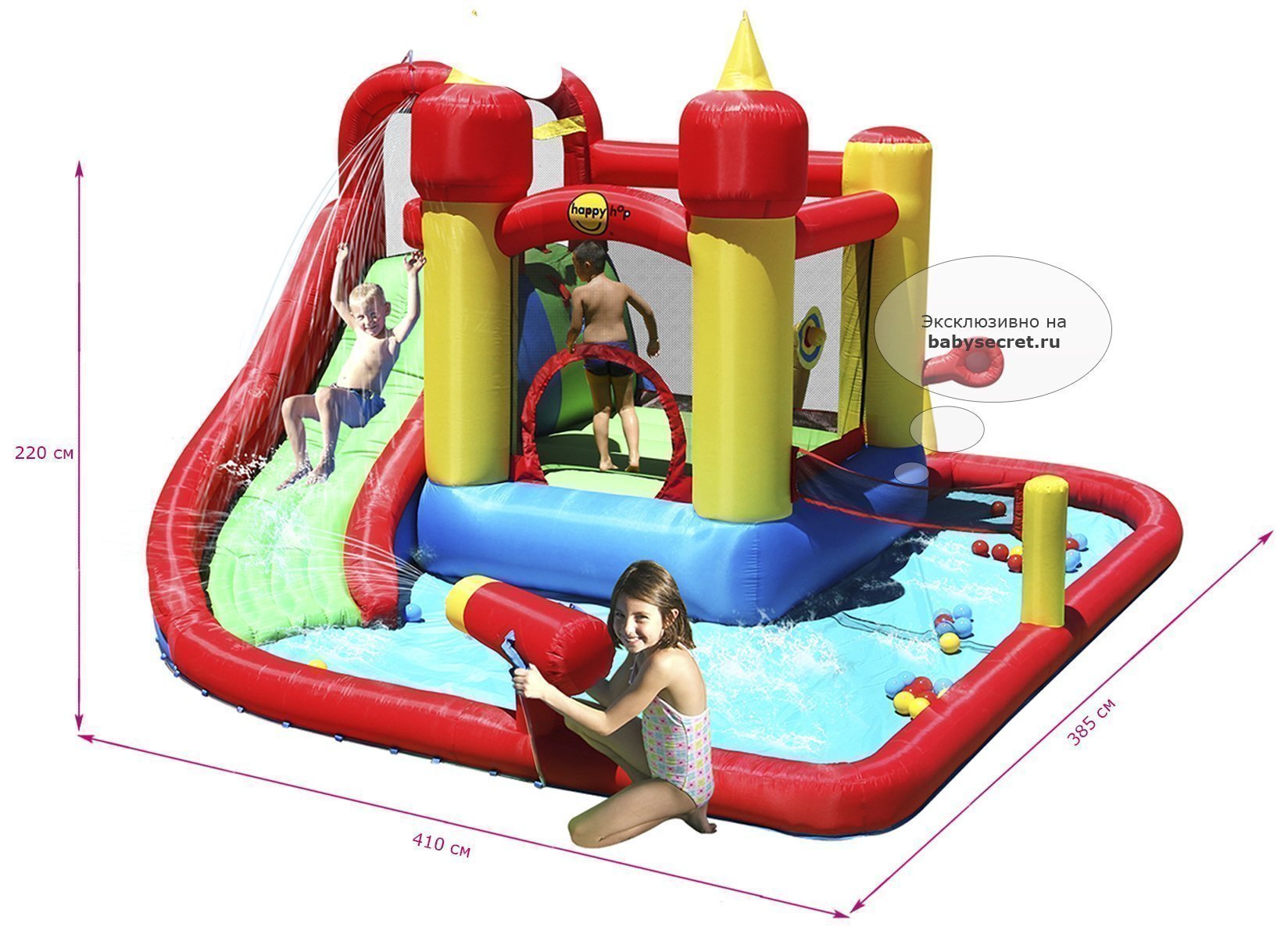 Общие размеры: (дхшхв) 410x385x220 cм высота основания батута 40 см батут (дхш) 183x162 см прыжковой поверхности (вхш) 143x127 см высота ограждения-сетки 90 см горка 162x90 см высота площадки горки 127 см ширина скользящей поверхности 60 см Габариты в упаковке (ШxДxВ): Коробка: 83x43x43 см, 0.15 м3 , 28 кг