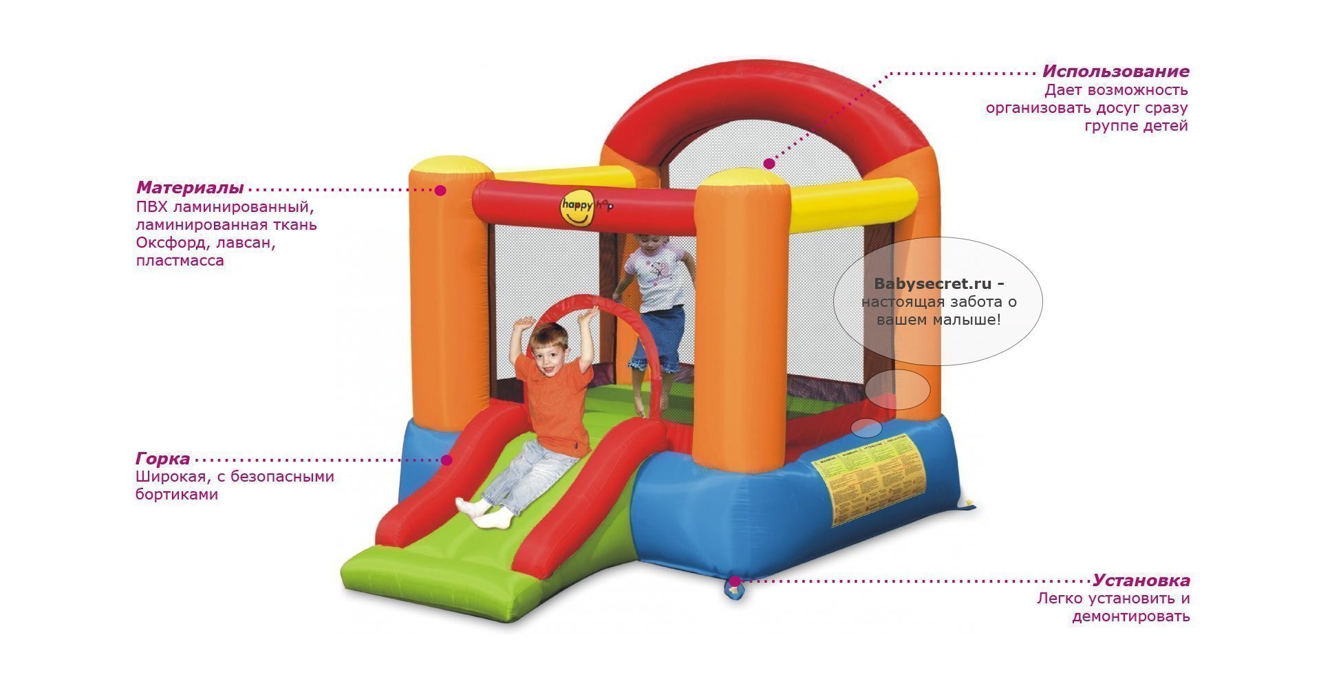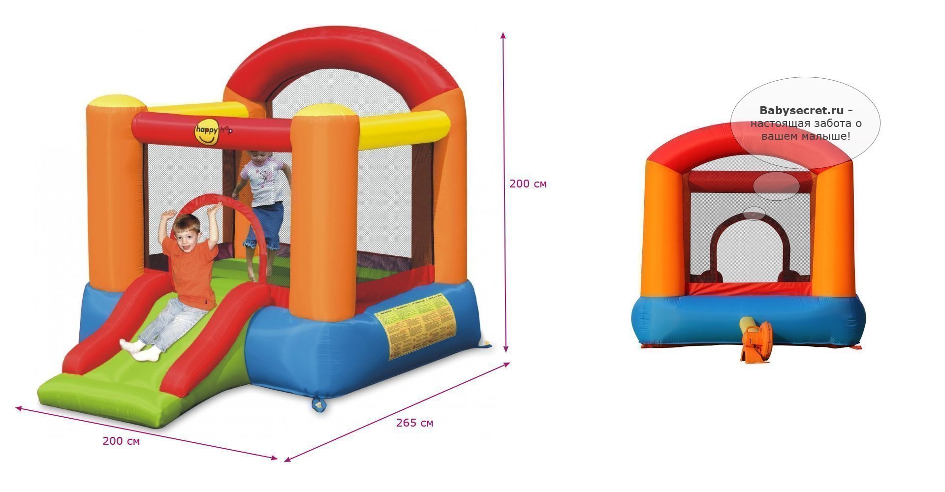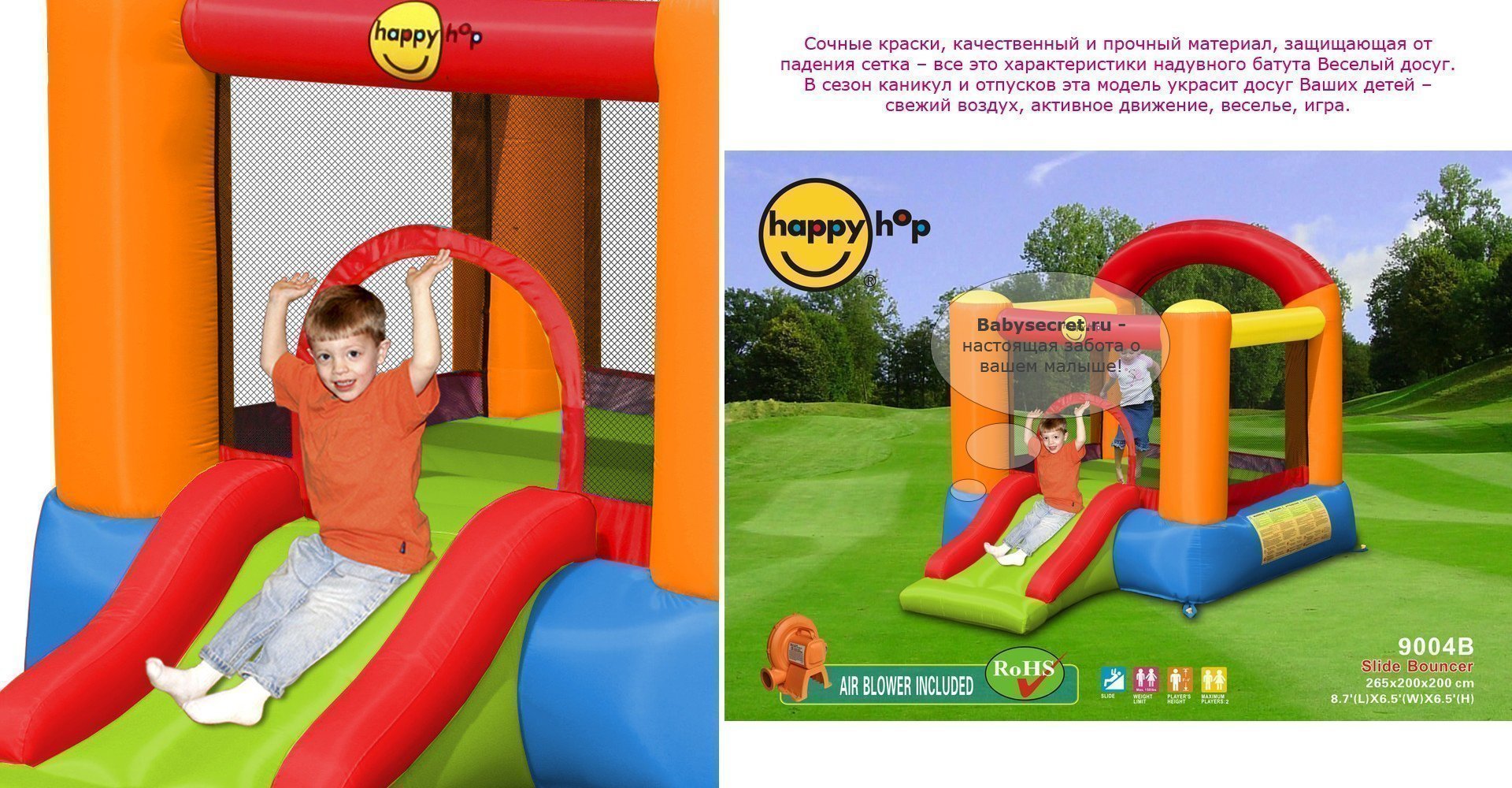Приятные особенности детского надувного батута Happy Hop Веселый досуг 9004B:сочные краски, качественный и прочный материал, защищающая от падения сетка – все это характеристики надувного батута Веселый досуг. В сезон каникул и отпусков эта модель украсит досуг Ваших детей – свежий воздух, активное движение, веселье, игра.Насос (нагнетатель воздуха) должен работать все время пока дети играют на батуте!