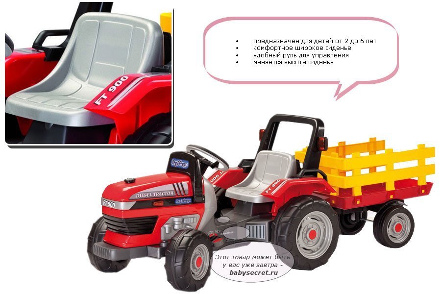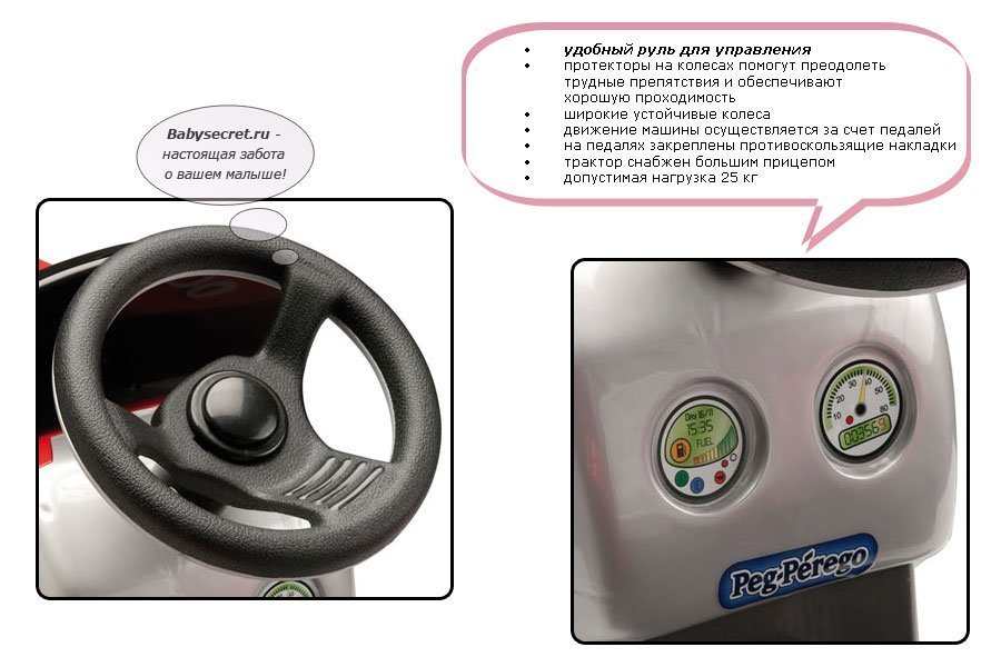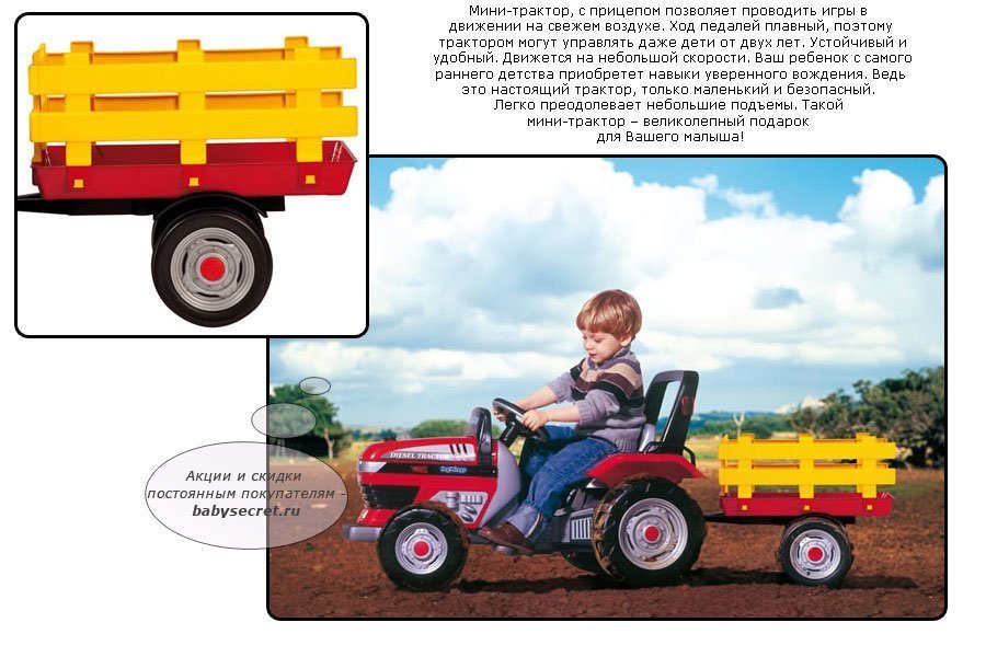 Приятные особенности детского тракторас механическим приводом Peg-Perego Diesel Tractor -мини-трактор, с прицепом позволяет проводить игры в движении на свежем воздухе. Ход педалей плавный, поэтому трактором могут управлять даже дети от двух лет. Устойчивый и удобный. Движется на небольшой скорости. Ваш ребенок с самого раннего детства приобретет навыки уверенного вождения. Ведь это настоящий трактор, только маленький и безопасный. Легко преодолевает небольшие подъемы. Такой мини-трактор – великолепный подарок для Вашего малыша!