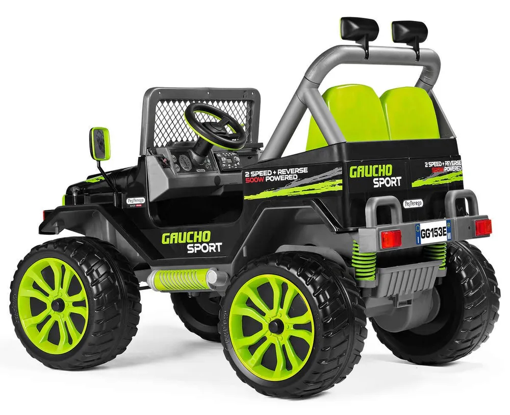 Приятные особенности : Детский электромобиль Peg-Perego Gaucho Sportпредставляет собой яркий двухместный внедорожник для малышей от 3-х лет. Модель комплектуется мощным электромотором 480W и аккумулятором 12V для обеспечения его бесперебойного питания. В приборную панель вмонтирована современная радио-магнитола с функцией подключения MP3, USB, AUX. Несколько скоростных режимов позволяют взрослым временно заблокировать более высокую скорость во время обучения для безопасности юного гонщика. Для Вашего удобства аккумулятор можно подзарядить от стандартной розетки, от автомобиля. Управлять машинкой легко и просто. Единая педаль отвечает и за движение вперед, и за торможения. Надавите ногой на педаль – и электромобиль плавно стартует, отпустите - и он остановится. При запуске двигателя Вы услышите характерный, реалистичный шум работы мотора. Сидения регулируются под рост ребенка. Колеса с протектором и задней амортизацией едут тихо, не дребезжат на асфальте. Внедорожник проедет даже по грунту и гравию.