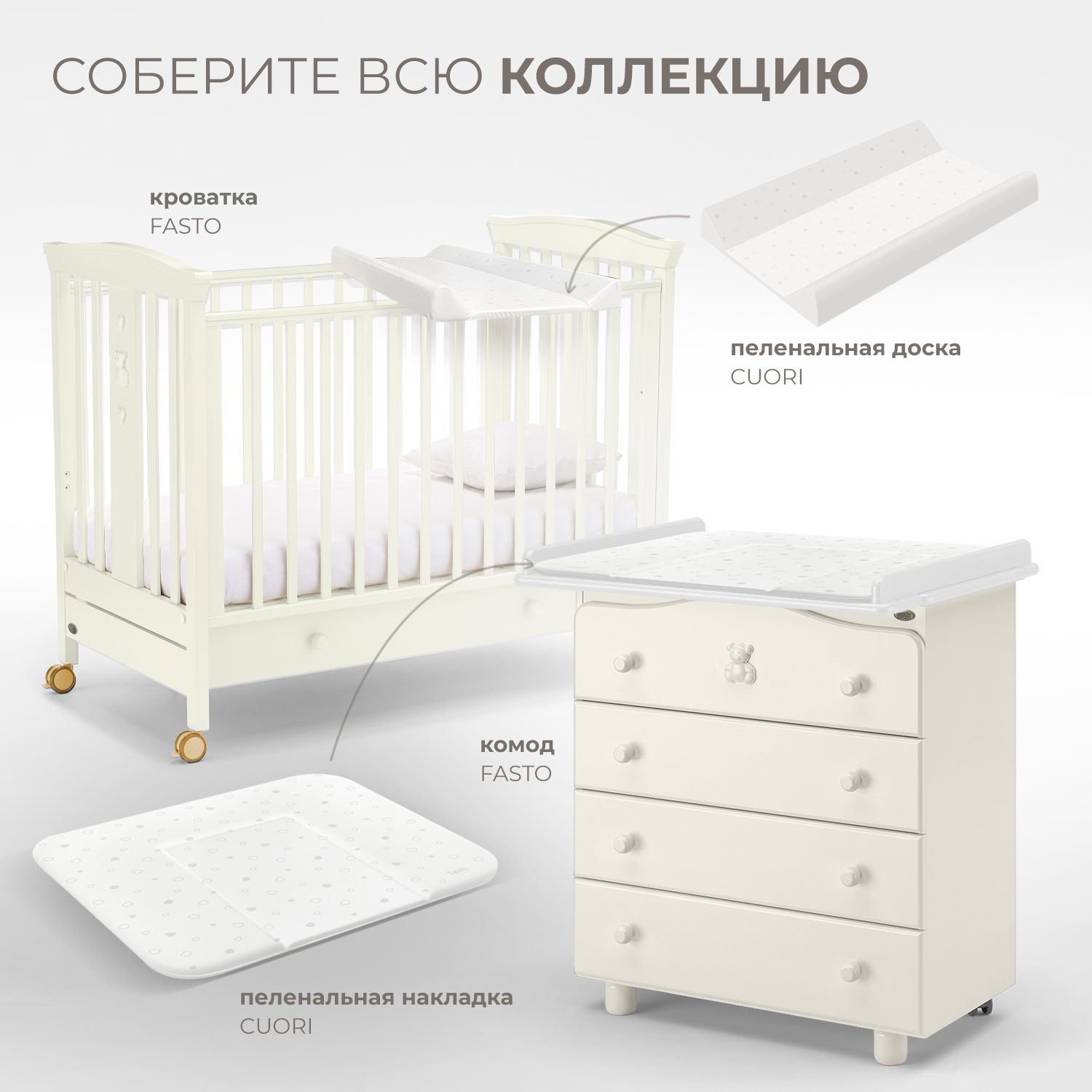 Приятные особенности :Удобный и надёжный детский комод Nuovita Fasto. Четыре вместительных ящика, два колеса для передвижения, легко съёмная пеленальная доска.