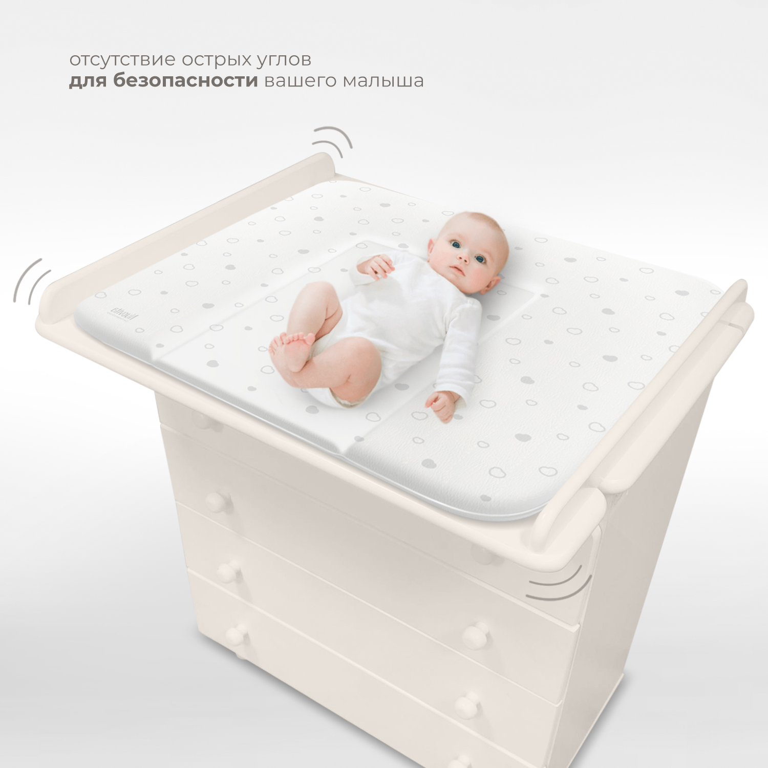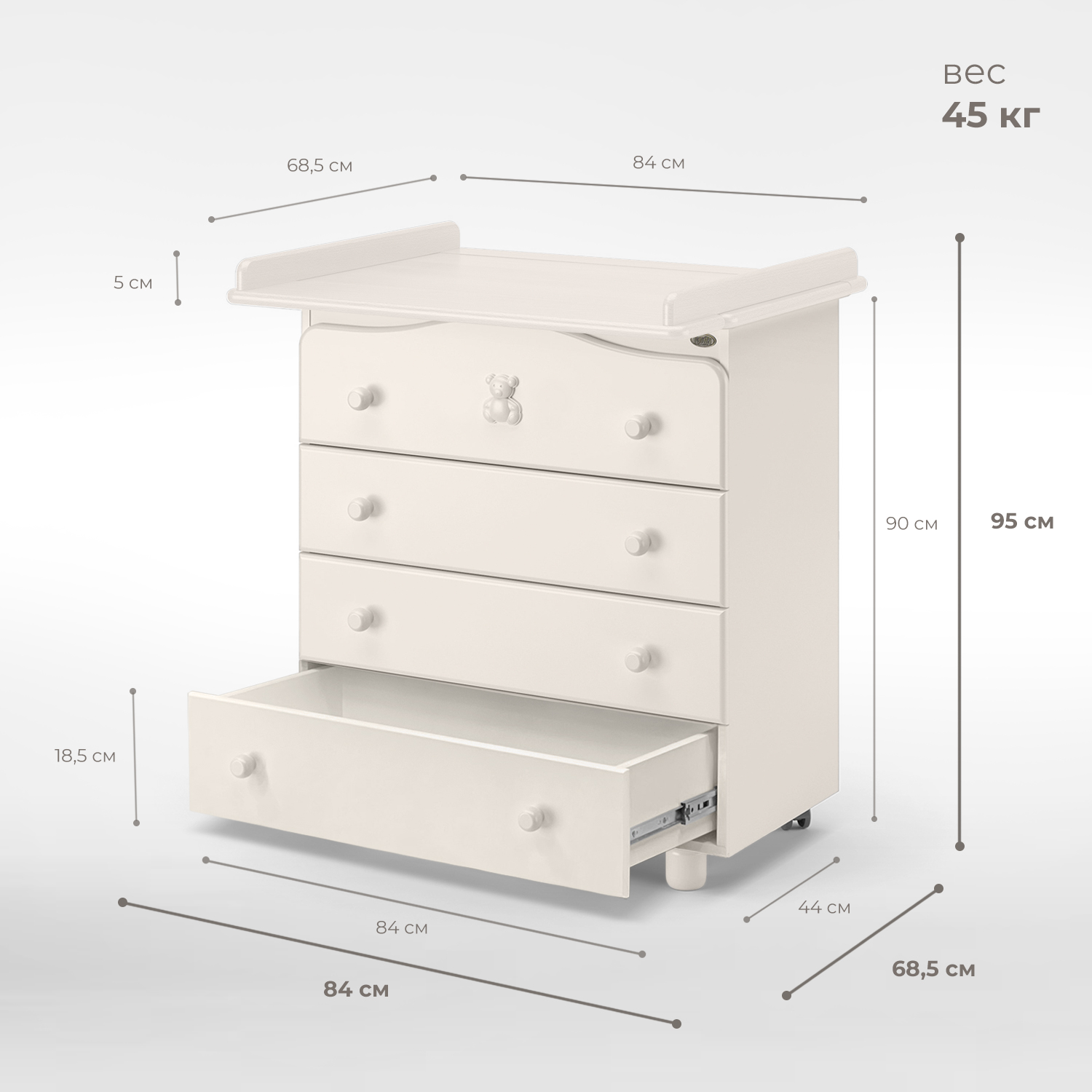 Размеры без пеленального столика (Высота х Ширина х Глубина): 900 х 840 х 440 мм; Габариты изделия с пеленальным столиком (Высота х Ширина х Глубина): 950 х 840 х 685 мм Внешние габариты (ДхШхВ), см: 90х84х44 Вес товара с упаковкой, кг: 48 Габариты упаковки (ДхШхВ), см: 88х47х25.5