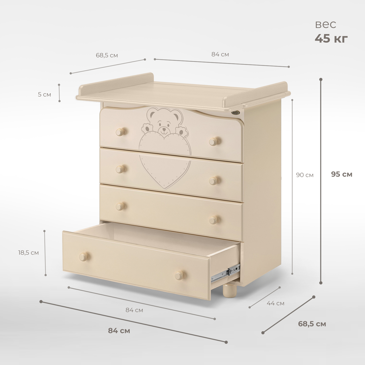 Размеры без пеленального столика (Высота х Ширина х Глубина): 900 х 840 х 440 мм; Габариты изделия с пеленальным столиком (Высота х Ширина х Глубина): 950 х 840 х 685 мм Внешние габариты (ДхШхВ), см: 90х84х44 Вес товара с упаковкой, кг: 48 Габариты упаковки (ДхШхВ), см: 88х47х25.5