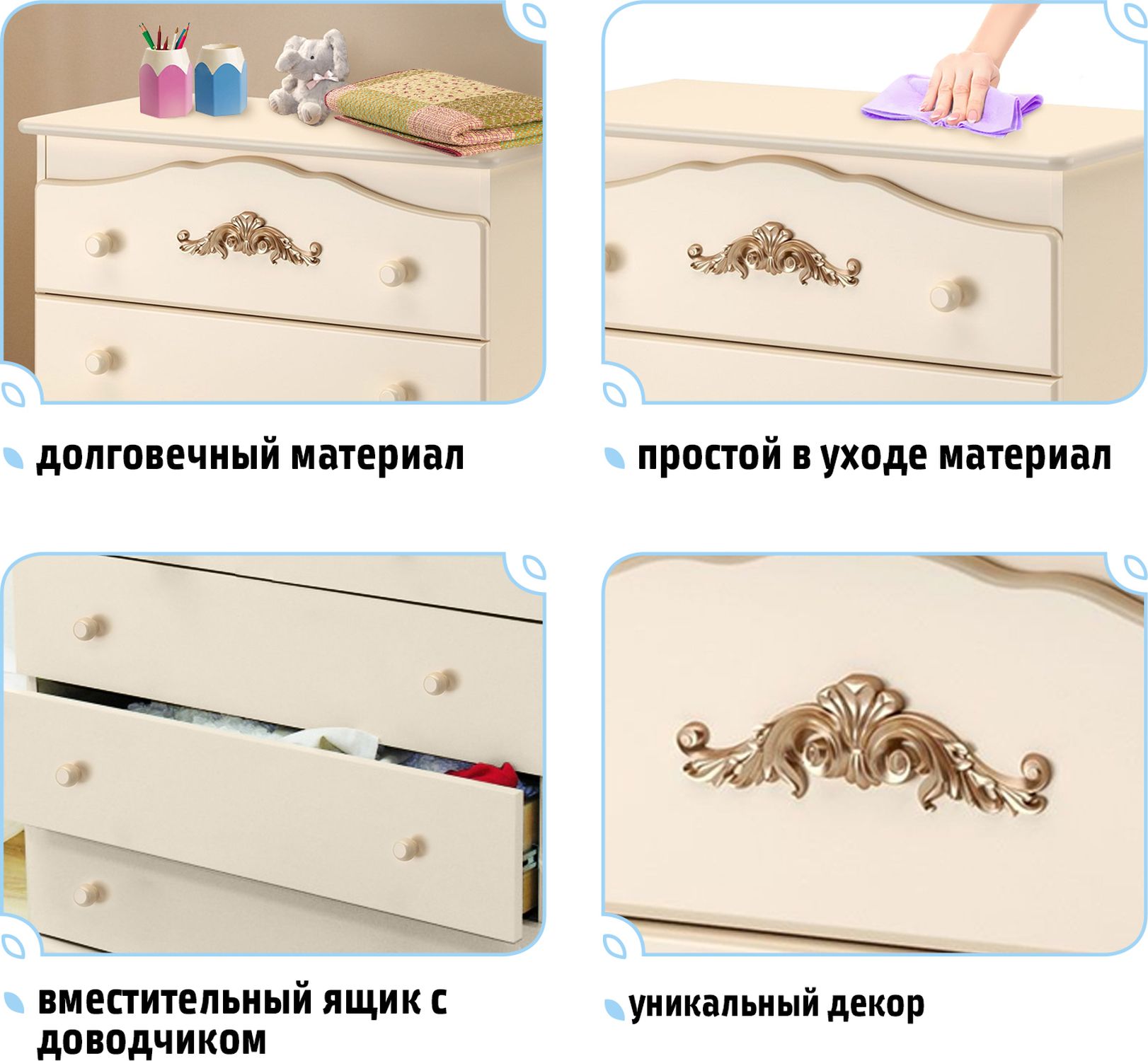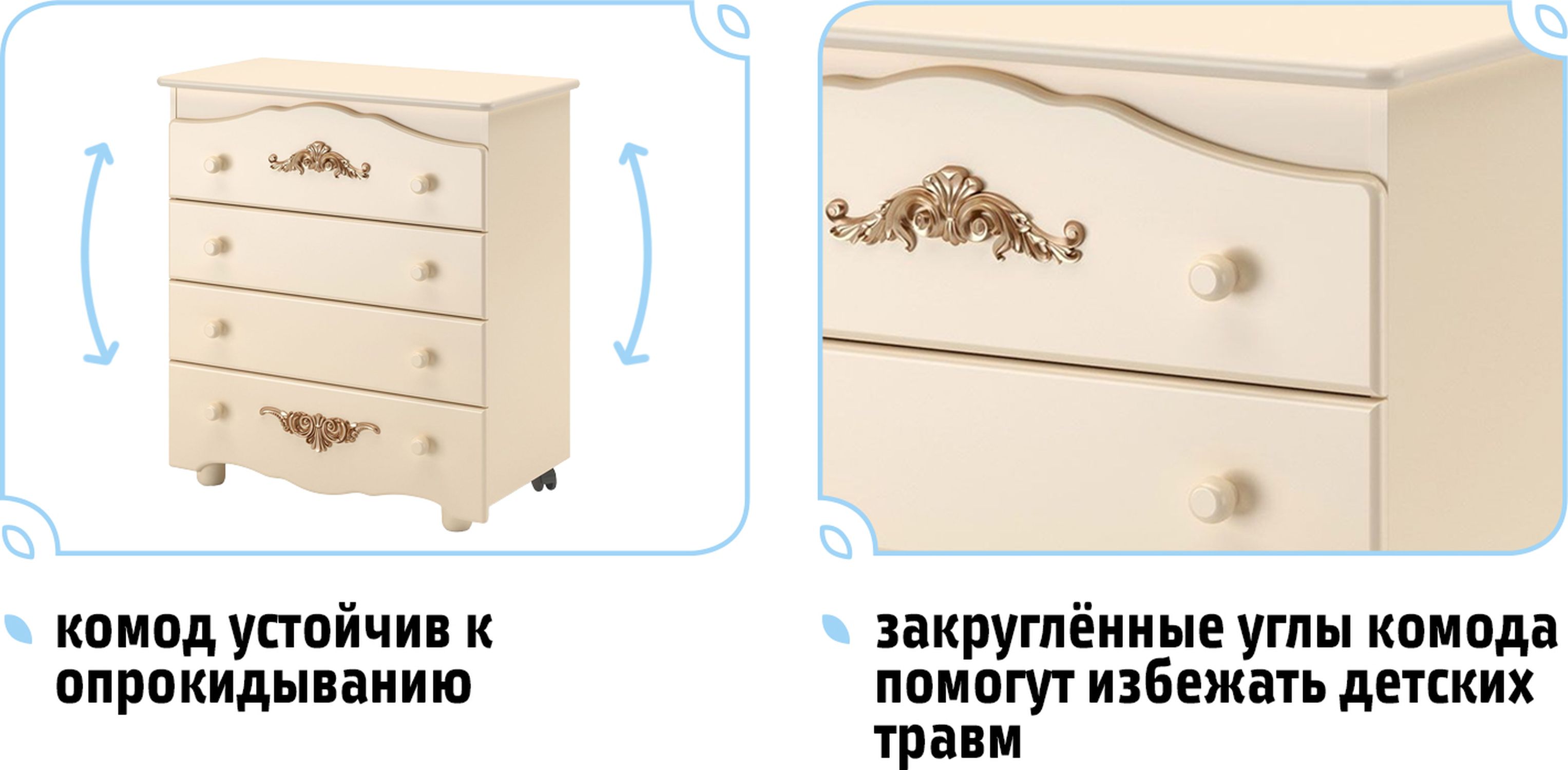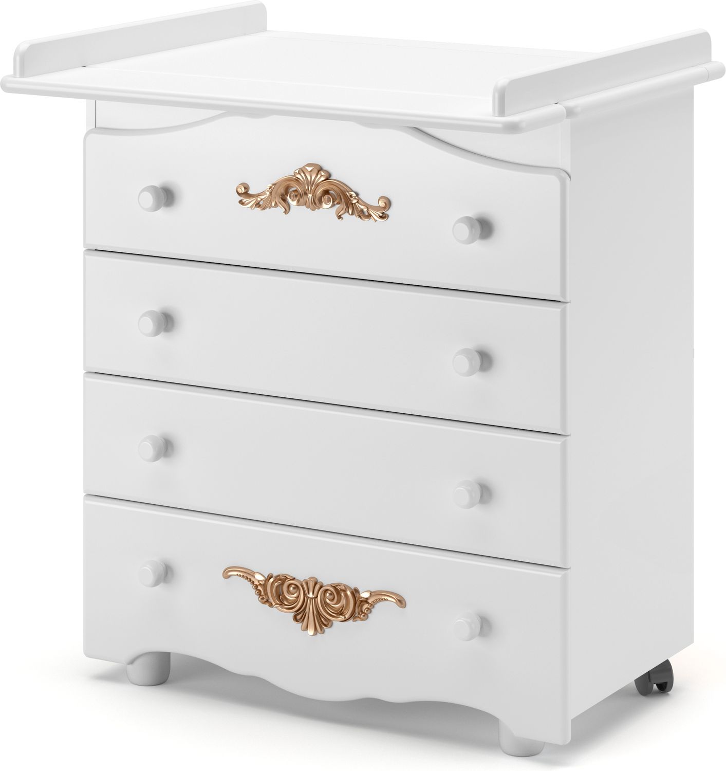 Этот элегантный комод, имеющий практичные размеры (высота 90см, ширина 84 см, глубина 44 см), с легкостью вместит все «приданое» малыша, а впоследствии будет удобен для хранения вещей подросшего ребенка. Пеленальная доска, которая устанавливается на крышке комода, имеет размер 75х68 см, что дает возможность с удобством переодеть младенца и провести гигиенические процедуры. Устойчивые прочные ножки, расположенные спереди, подчеркивают основательность фасада. Колесики, установленные сзади, позволяют при желании без труда передвигать изделие.