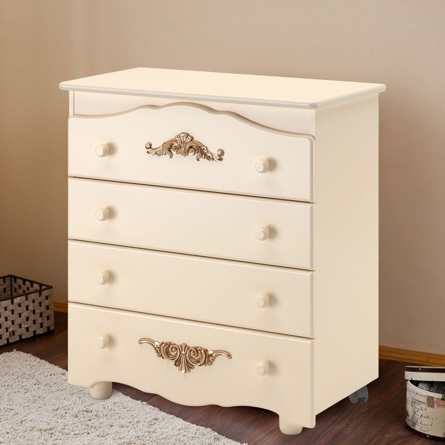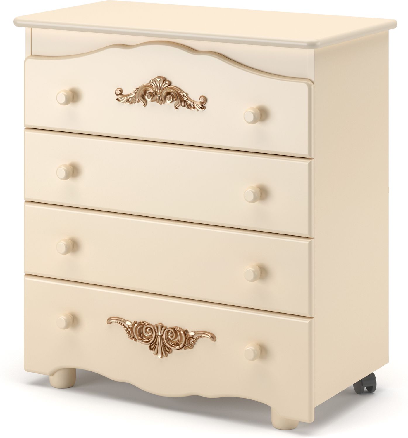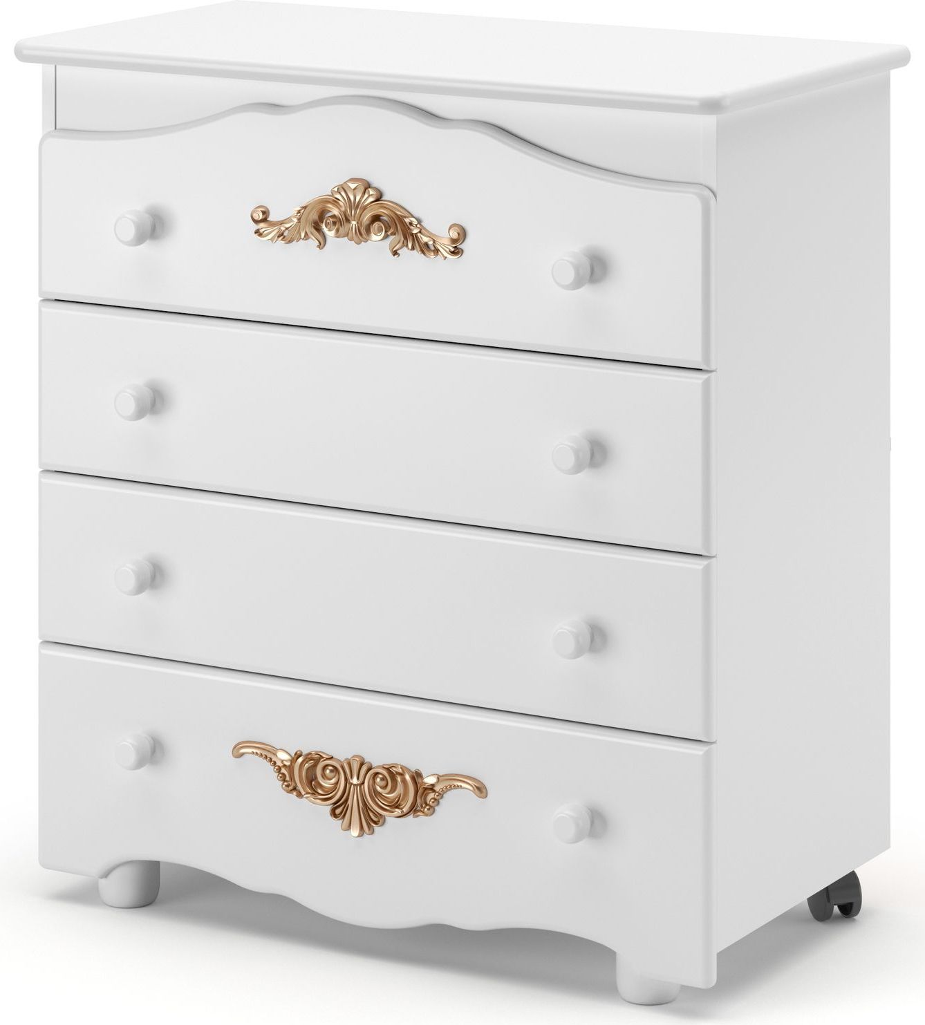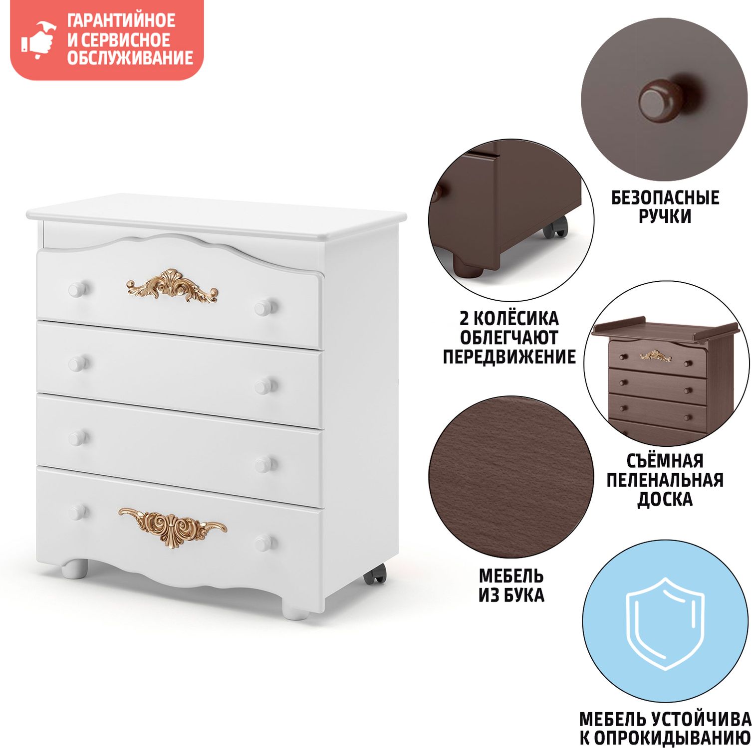 Этот элегантный комод, имеющий практичные размеры (высота 90см, ширина 84 см, глубина 44 см), с легкостью вместит все «приданое» малыша, а впоследствии будет удобен для хранения вещей подросшего ребенка. Пеленальная доска, которая устанавливается на крышке комода, имеет размер 75х68 см, что дает возможность с удобством переодеть младенца и провести гигиенические процедуры. Устойчивые прочные ножки, расположенные спереди, подчеркивают основательность фасада. Колесики, установленные сзади, позволяют при желании без труда передвигать изделие.