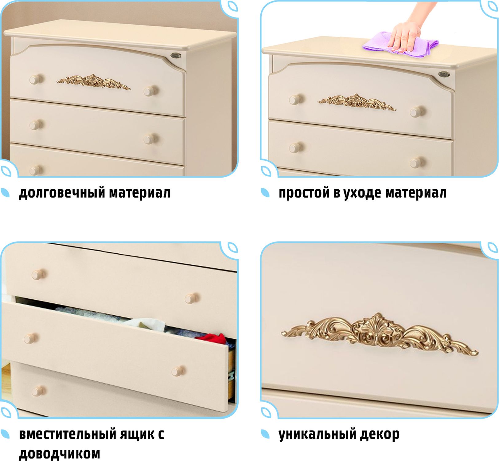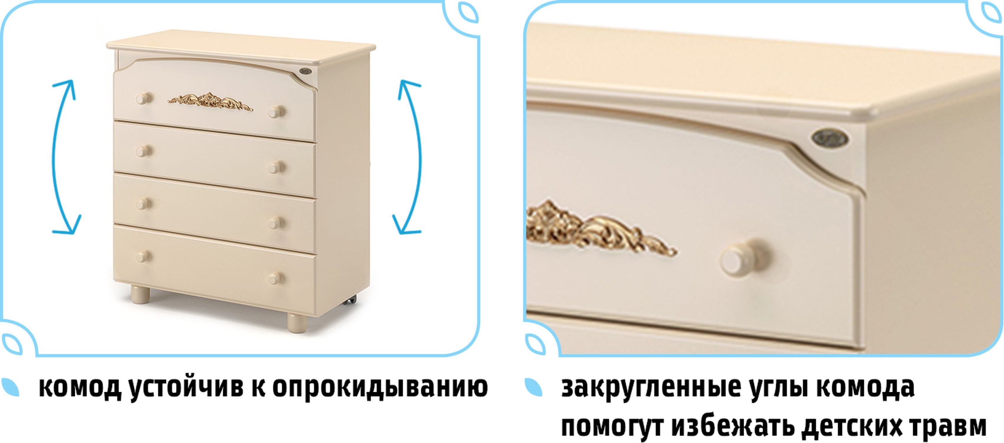 Удобство пользования комодом уже оценили многие родители, которые используют его и для пеленания, и для хранения вещей малыша. Все самое необходимое – всегда у вас под рукой, благодаря оптимальной высоте комода и пеленального столика ваша спина не подвергается дополнительной нагрузке, съемная пеленальная доска легко убирается, чтобы не занимать много места.