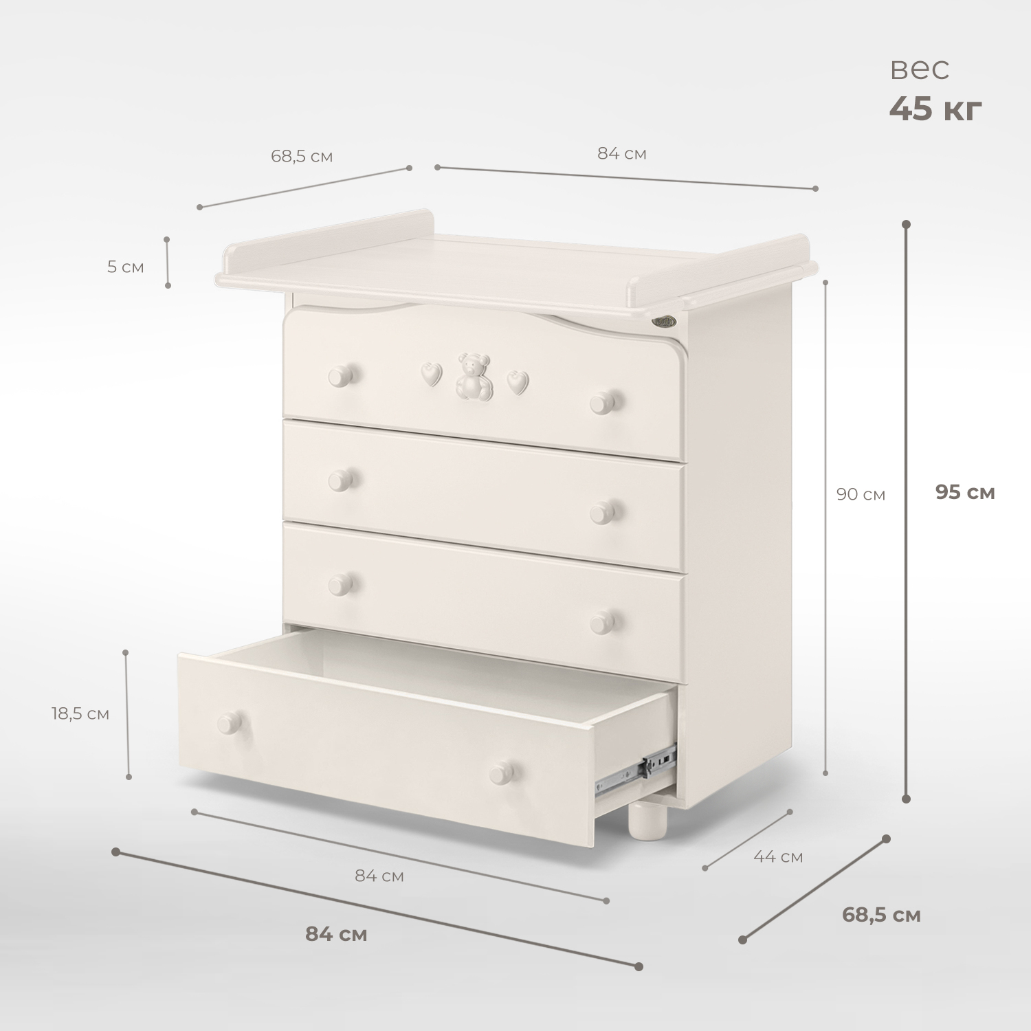Размеры без пеленального столика (Высота х Ширина х Глубина): 900 х 840 х 440 мм;Габариты изделия с пеленальным столиком (Высота х Ширина х Глубина): 950 х 840 х 685 мм