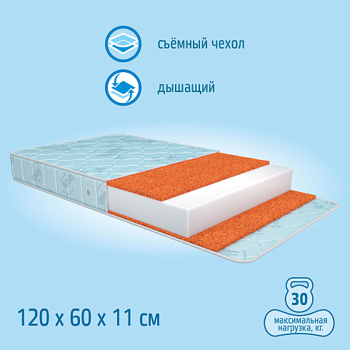 Приятные особенности :Детский матрас Nuovita Gesto. Максимальная нагрузка на матрас 30 кг. Состав наполнителя: холкон 8 см + кокос 1 см + кокос 1 см. Жесткость матраса выбирается по сезонности либо по комфортности, одна сторона матраса обладает жесткостью "выше среднего", другая - "средней". Чехол матраса съёмный, выполнен из хлопкового жаккарда.