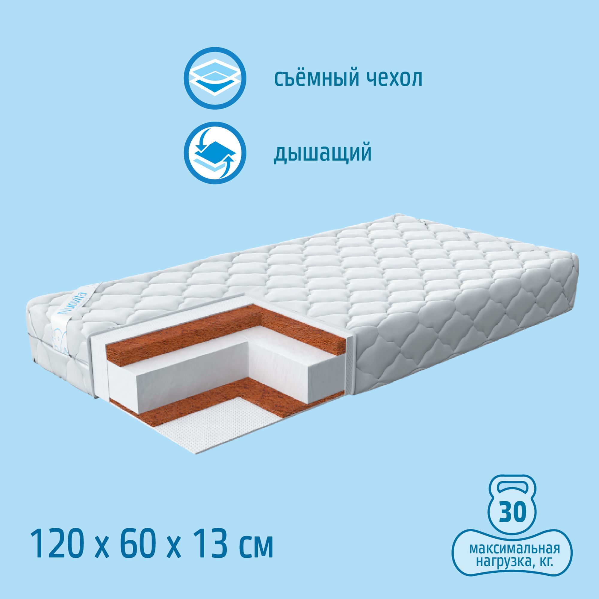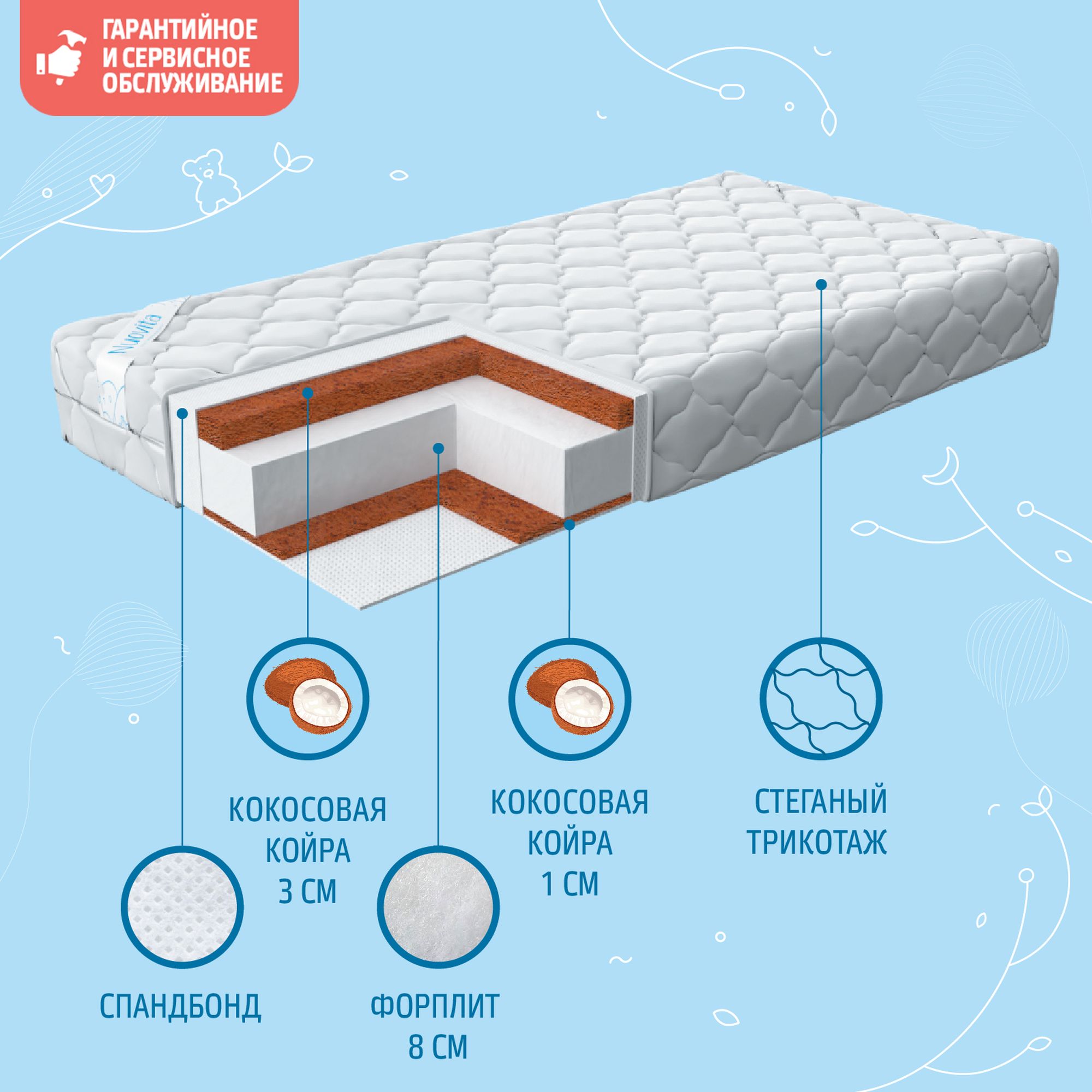 Приятные особенности :Детский матрас Nuovita Pratico. Максимальная нагрузка на матрас 30 кг. Состав наполнителя: кокос 1 см + Forplit 8 см + кокос 3 см + спанбонд. Жесткость матраса "средняя". Чехол матраса съёмный, выполнен из стеганного трикотажного полотна.