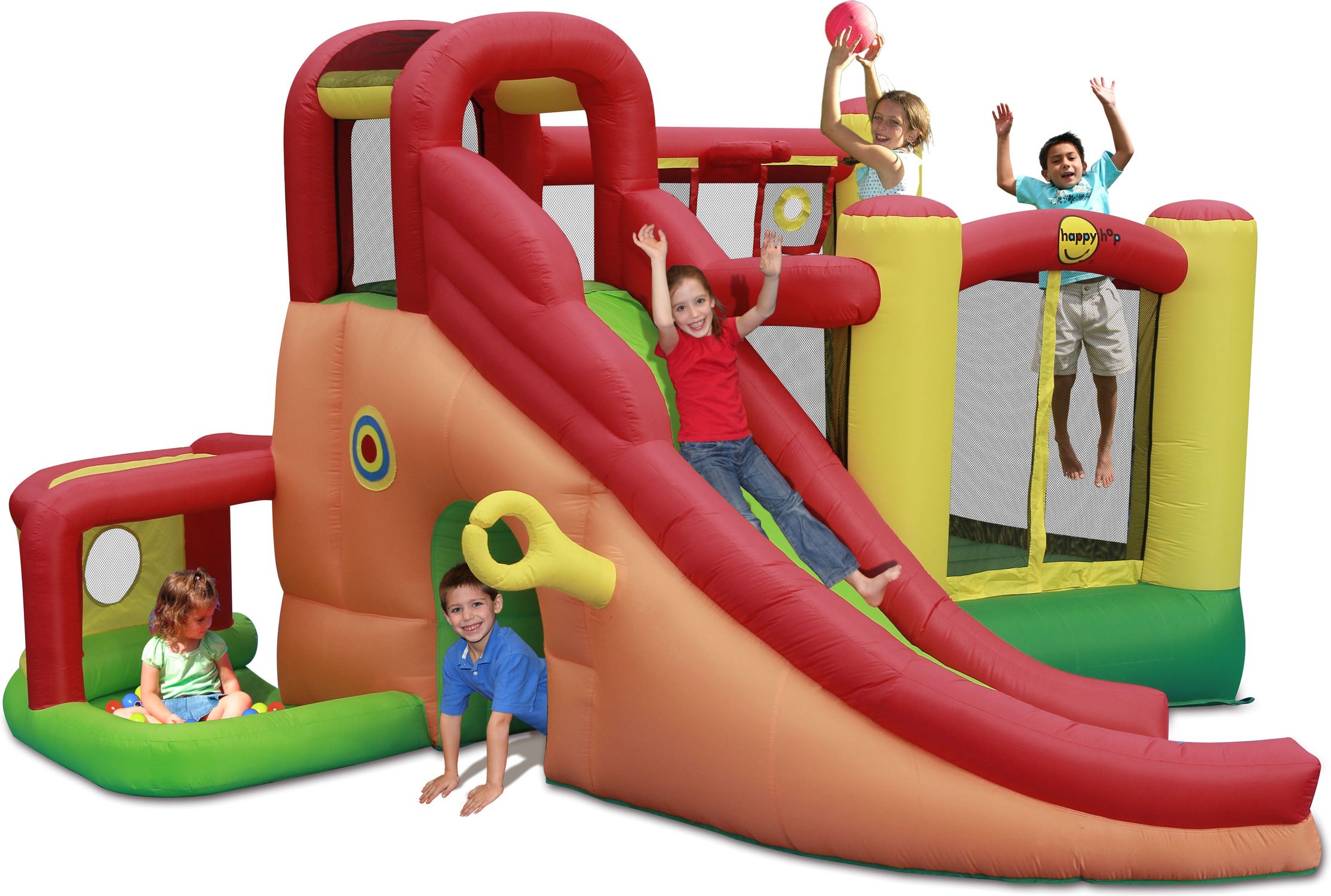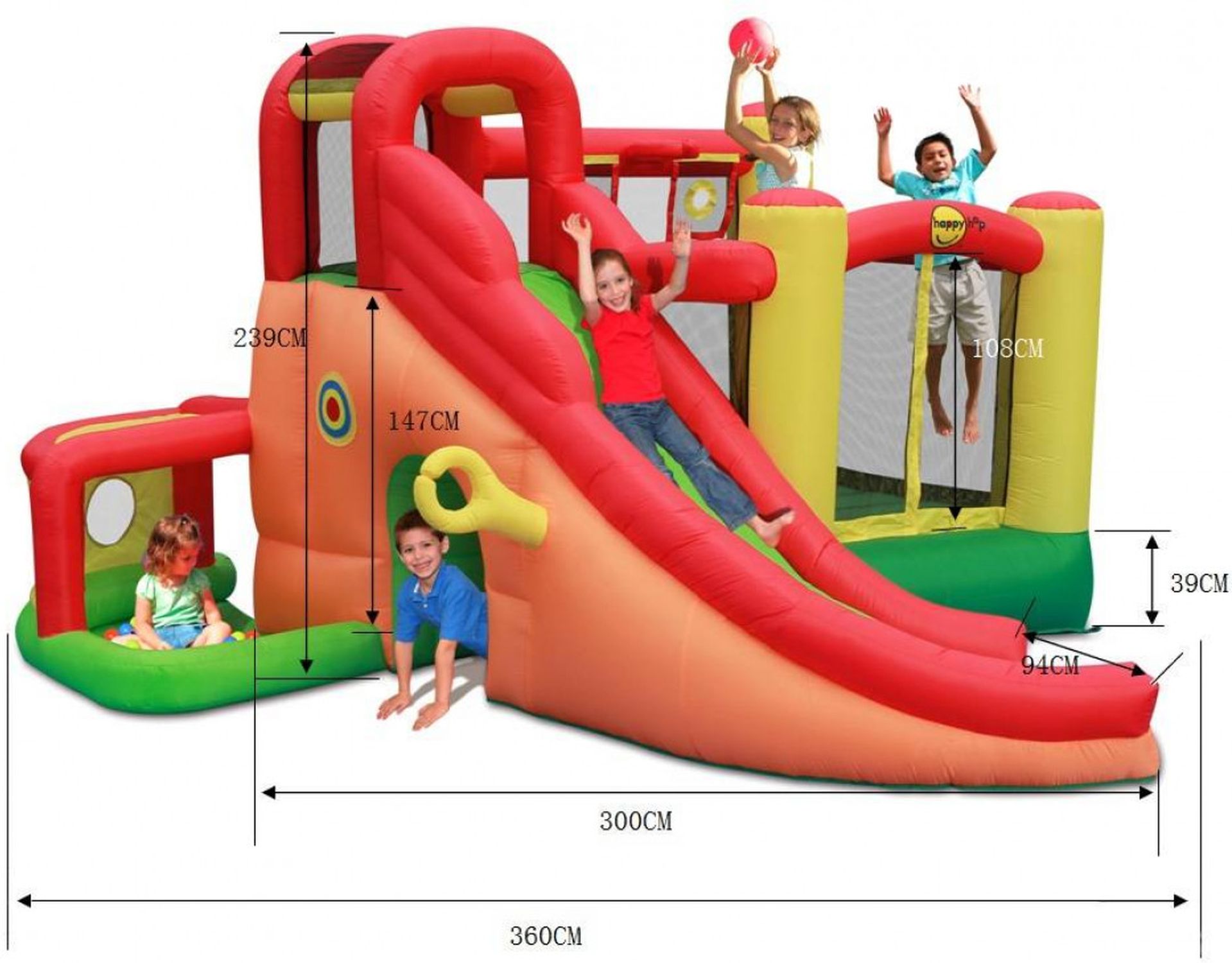 Приятные особенности детского надувного батута Happy Hop Игровой центр 11 в 1, 9406:Детский надувной батут «Игровой центр» — отличное решение для организации активного отдыха и весёлого времяпровождения! В комплексе есть практически всё, что нужно ребятам для развлечений: площадка для прыжков и гимнастический упражнений, высокая горка, дартс, кольца для игры в мяч, а также отдельный уголок для малышей, куда можно поместить множество разноцветных шариков. Размеры горки: 300 см * 94 см Материал батута прочен на растяжение и на разрыв. Изделие выдерживает широкий диапазон температур. Насос батута безопасен при использовании и безвреден для окружающей среды. Насос можно использовать при температуре от -15 до + 40 °C. При возникновении в насосе короткого замыкания или при прочих возникших проблемах при его эксплуатации, он немедленно выключается, тем самым обеспечивает безопасность надувного батута. Насос отвечает экологическим стандартам ЕС, имеет сертификат безопасности GS.