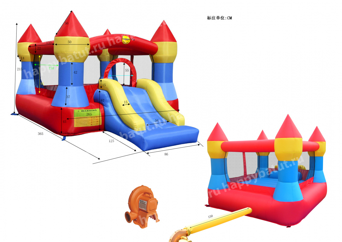 Приятные особенности:При игре на батуте «Великан» совсем не трудно вообразить себя принцессой или отважным рыцарем. «Великан» имеет удобную прыжковую поверхность с горкой и привлекательный дизайн. Одновременно здесь могут прыгать или играть сразу три ребенка в возрасте от трех до десяти лет.Насос батута высокого качества, высокоэффективен, безопасен при использовании и безвреден для окружающей среды.Насос можно использовать при температуре от -15 до + 40 °C. Помимо этого, он оснащен устройством защиты. При возникновении в насосе короткого замыкания или при прочих возникших проблемах при его эксплуатации, он немедленно выключается, тем самым обеспечивает безопасность пользователю надувного батута. Насос отвечает экологическим стандартам ЕС, а также имеет сертификат безопасности GS.