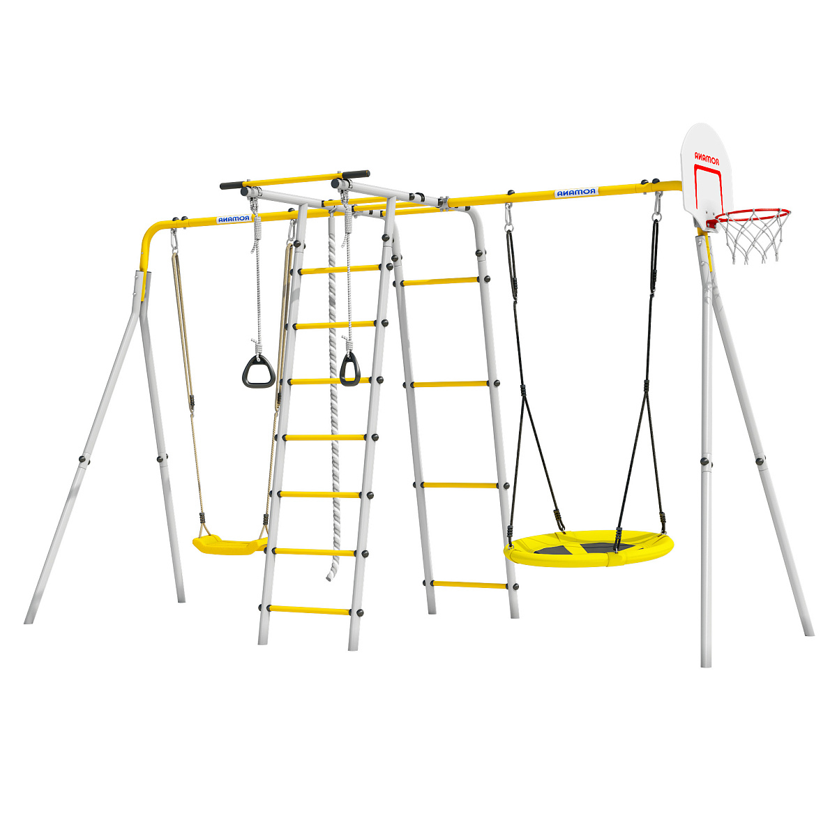 Приятные особенности:Современный комплекс ROMANA Лесная поляна 3 NEW PRO станет удачным вложением в будущее здоровье малыша. Оборудованием могут пользоваться сразу несколько детей от трех лет. Для веселого времяпрепровождения и совместной игры турник включает все необходимое.Любители качелей смогут покататься на аттракционе "гнездо". Также предусмотрены кольца, баскетбольный щит и всевозможные лестницы.Оборудование отличается не только продвинутым разнообразным функционалом, но и прекрасным качеством. Все комплектующие изготовлены согласно ГОСТу и отвечают необходимым требованиям и стандартам.ROMANA Лесная поляна-3 NEW PRO на детской площадке будет пользоваться популярностью как у девочек, так и у мальчиков. Инвентарь способствует развитию ловкости, гибкости и выносливости. Даже самому маленькому пользователю будет несложно освоить кольца, рукоход и качели. Эксплуатироваться конструкция способна длительное время.