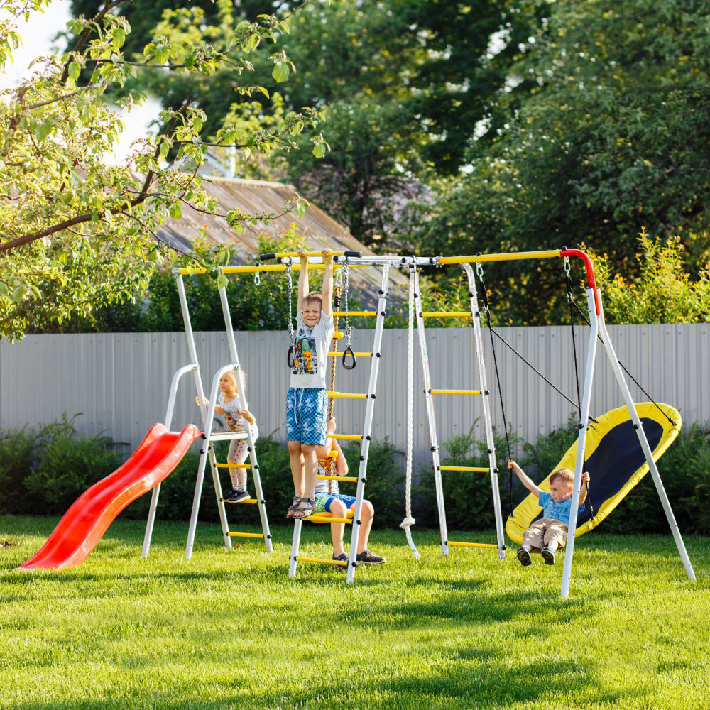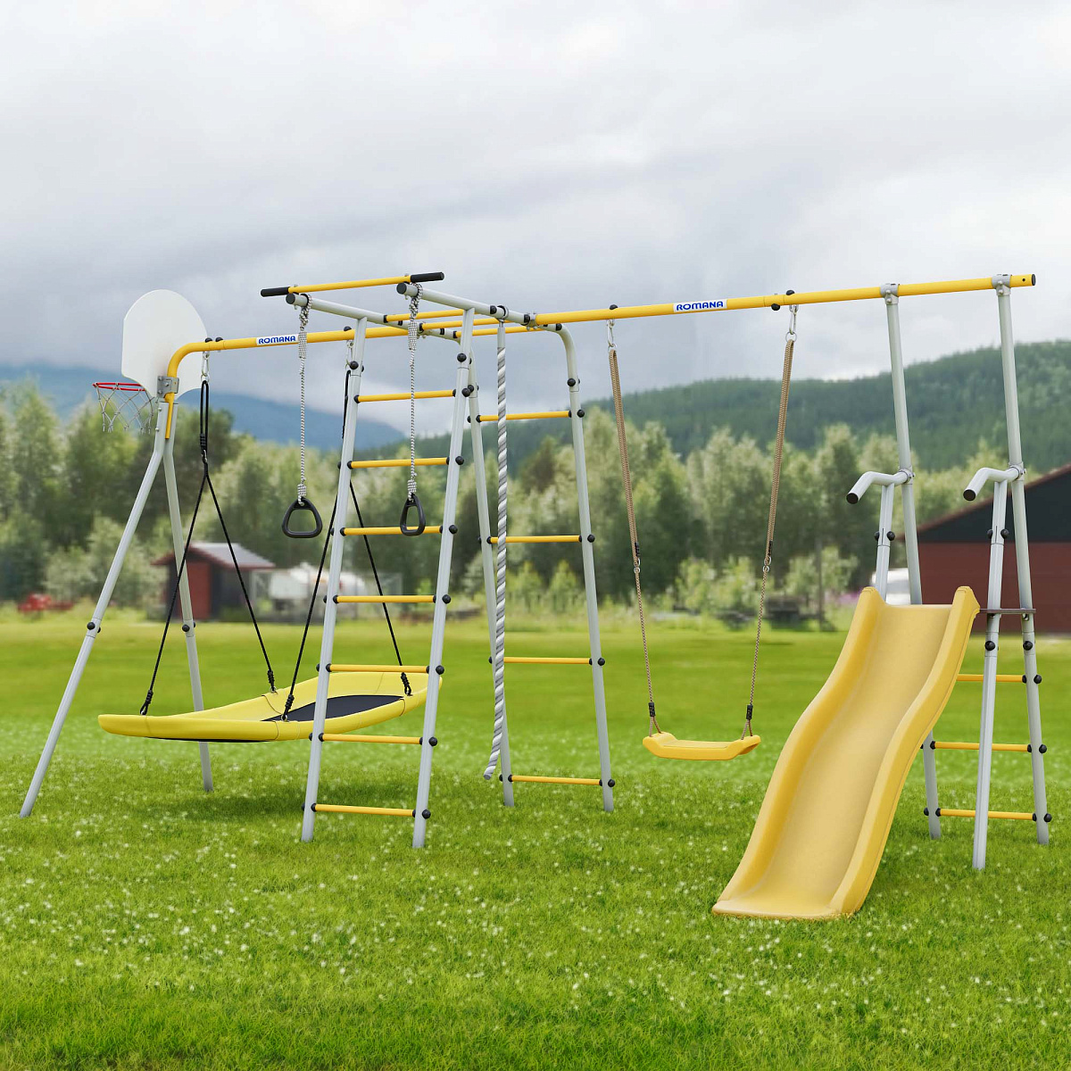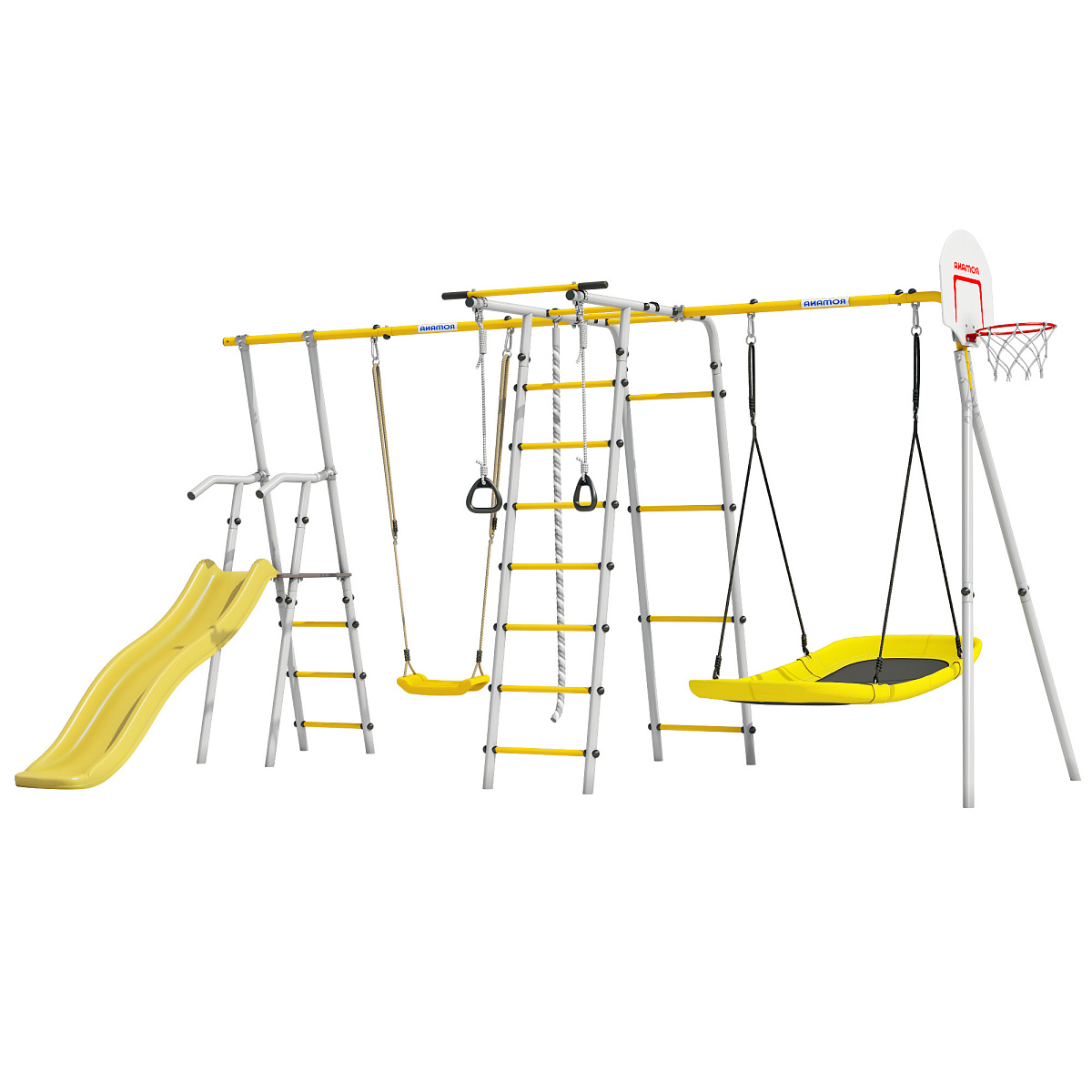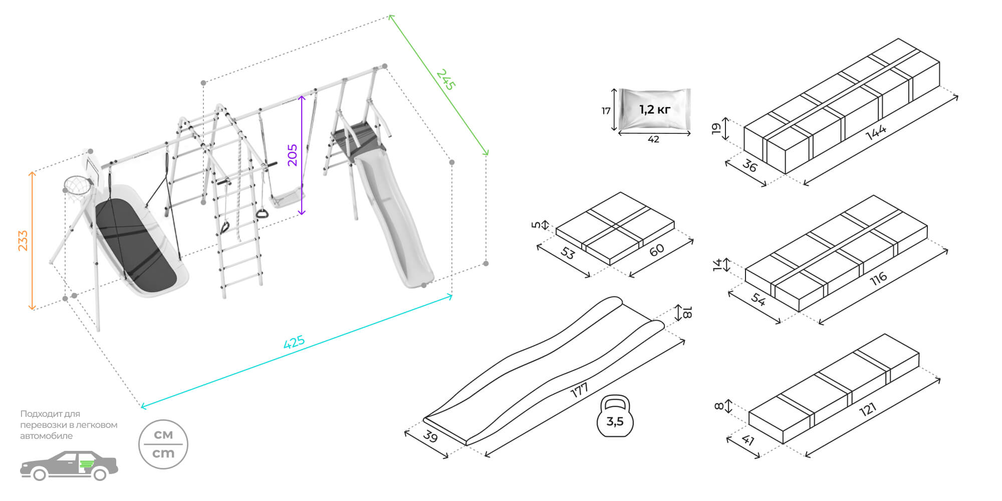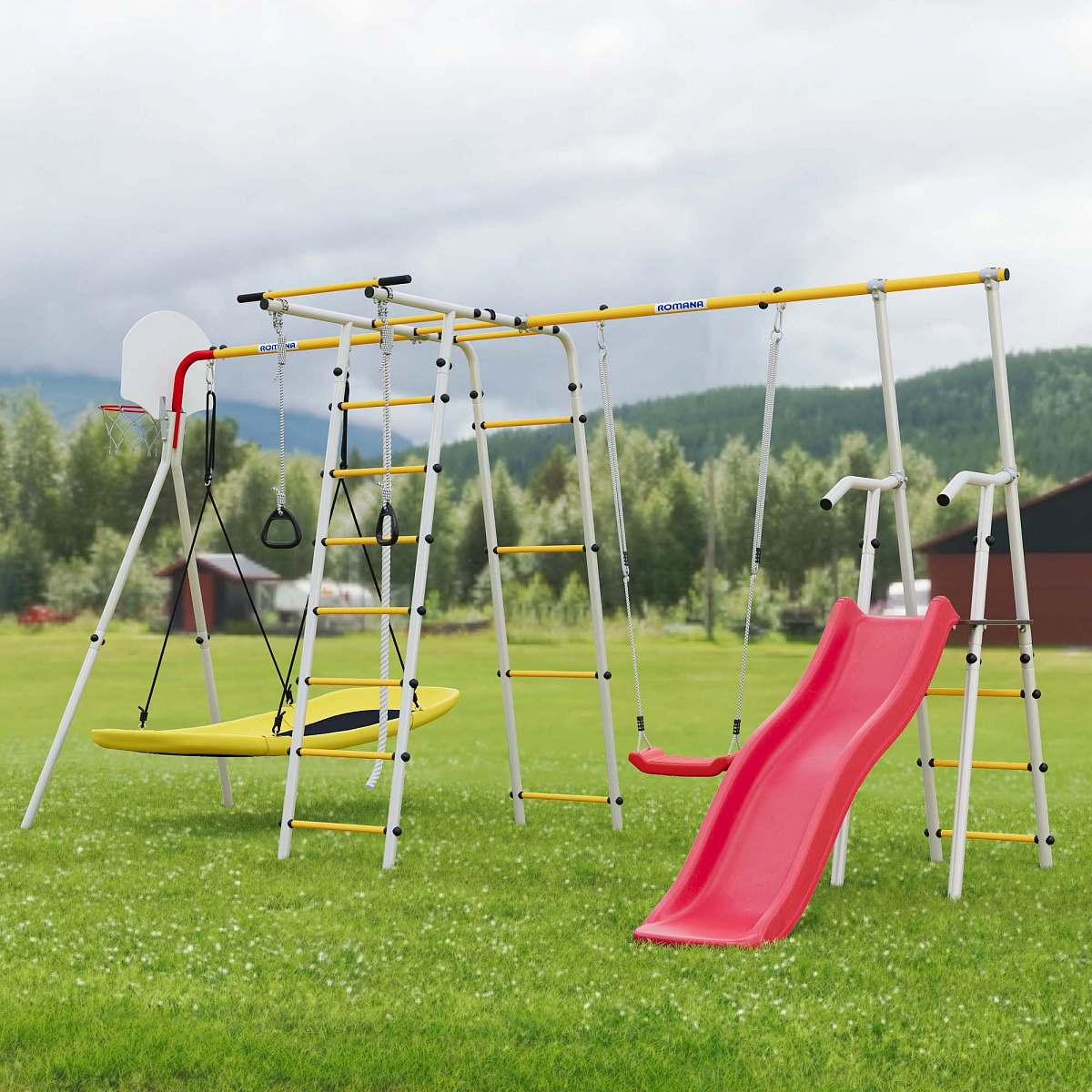 Приятные особенности:Спортивный комплекс ROMANA Лесная поляна-3 NEW PRO является удачным решением для оборудования детской площадки. Комплекс, оснащенный горкой, станет любимым местом активного отдыха у детей с трех лет. Немаловажное преимущество инвентаря – отличная вместимость оборудования. Комплексом могут пользоваться сразу несколько малышей.Конструкция выдерживает до 100 кг веса. Изделие оборудовано двумя качелями: моделью "лодка" и пластиковыми. Кроме того, имеются кольца, баскетбольный щит и лестницы лаза.Все детали оборудования выполнены из высококачественных экологичных материалов. Пользоваться спортивным комплексом не только весело, но и полезно. В ходе применения ребенок тренирует все группы мышц, гибкость и ловкость. Система детских аттракционов ROMANA Лесная поляна-3 NEW PRO - это выгодное вложение в инфраструктуру придомового участка или детской площадки.