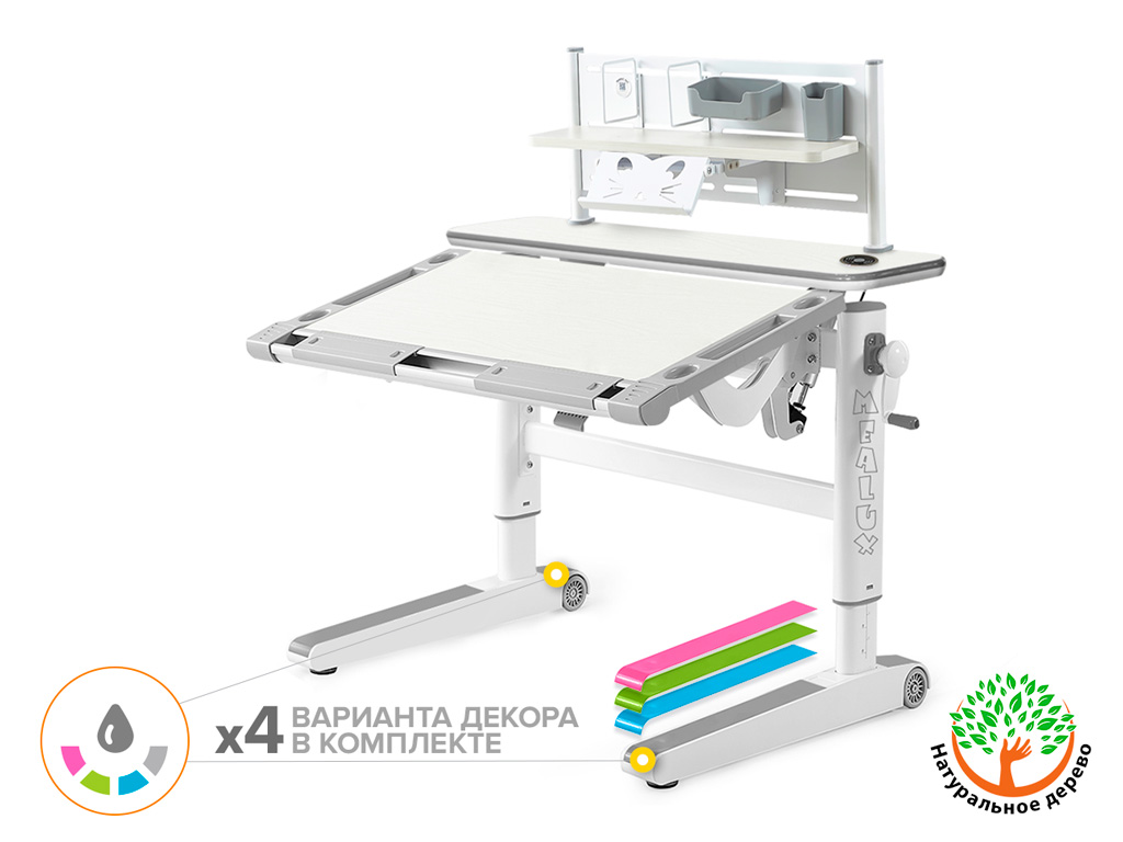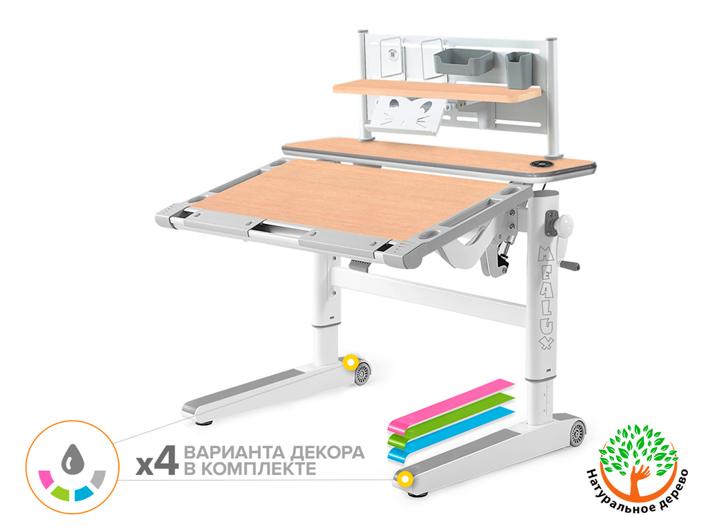 Приятные особенности:Детский стол-парта Mealux ErgoWood M Multicolor Energy + полка- это сочетание премиум качества, современного дизайна, уникальной функциональности и компактности. Столешница разделена на две части: большая рабочая поверхность (93,5х49 см) с регулируемым углом наклона, которая дополнена пеналами для канцтоваров и статичная задняя полочка (глубина 26 см), на которой можно хранить книги, а также, для большей эргономичности, дополнить ее полкой-надстройкой. Активный образ жизни сейчас в тренде, как никогда, поэтому наши столы разработаны с учетом всех тенденций современности. Благодаря широкому диапазону регулировки высоты, стол подходит для работы стоя, поэтому стоит учесть рекомендацию специалистов ортопедов и чередовать положение "сидя-стоя" каждые 30-45 минут, чтобы повысить продуктивность и улучшить общее состояние организма. Данный стол отлично подходит, как для малышей, так и для взрослых. Высота стола легко регулируется специальной механической ручкой, а на ножках стола размещена специальная шкала соотношения высоты стола и роста ребенка. В результате стол и ребенок будут "расти" вместе и у ребенка будет формироваться правильная осанка. Рабочая поверхность стола с регулируемым углом наклона до 30 градусов. Поэтому, можно установить оптимальный угол наклона для занятий (чтение, письмо, рисование). В результате, будет поддерживаться правильная осанка, а также глаза ребенка будут на безопасном расстоянии от учебника / тетради. Стол дополнен высококачественным механизмом газ-лифт, который обеспечивает плавность движения во время смены угла наклона столешницы. Специальным рычагом можно устанавливать оптимальный угол наклона в зависимости от занятий (письмо, чтение, рисование). С помощью специальной ручки можно регулировать высоту рабочей части столешницы. Заданная высота устанавливается независимо от высоты всей конструкции стола. Каркас стола изготовлен из металла, массивные металлические ножки стола дополнены регулировочными накладками, чтобы нивелировать стол, в случае, если неровный пол. Также на ножках есть колесики для плавного перемещения стола по комнате.