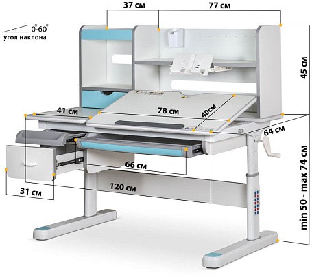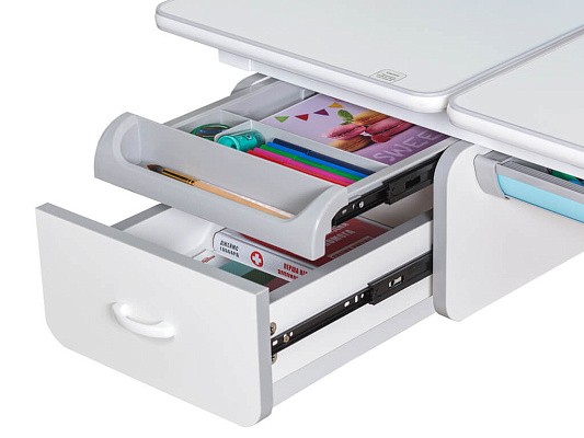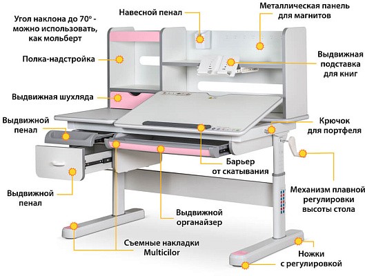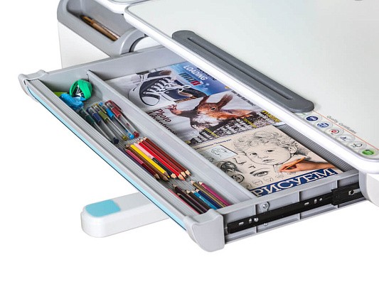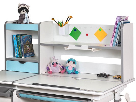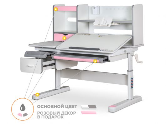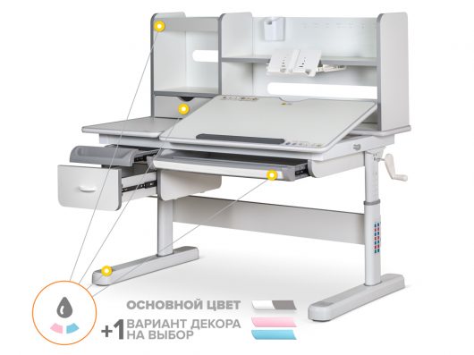 Приятные особенности: Важной особенностью детского стола Mealux Evo Florida Multicolorявляется наличие сменных цветных накладок. Приобретайте стол серого цвета и получите на выбор голубые, либо розовые накладки. Накладки меняются на ножках, пластиковом выдвижном органайзере, выдвижном ящике и полочке на надстройке. Меняйте цвет декора в зависимости от настроения вашего ребенка!На функциональной надстройке есть несколько полочек для размещения книг, либо монитора. Металлическую стенку стола можно использовать для размещениязаметок.Деревянный ящик для хранения различных принадлежностей прекрасно дополняет полку-надстройку.Регулируемая подставка под книгу меняет угол наклона. За ненадобностью подставка легко убирается внутрь стола.Высота стола регулируется с помощью червячного механизма ручкой. Как вы, так и ваш ребенок, сможете с легкостью отрегулировать стол, а благодаря шкале роста, изображенной на ножках, это будет сделать еще проще. Ручку можно разместить с любой стороны стола.Подвижная часть столешницы меняет угол наклона до 60 градусов с помощью плавного газлифта. Столешницу можно отрегулировать для письма, чтения или даже рисования.Под подвижной частью столешницы размещен выдвижной органайзер их прочного и безопасного ABS-пластика.В выдвижном ящике и небольшом пенале удобно хранить тетради, и мелкие школьные канцелярские принадлежности.Прорезиненный барьер предотвращает соскальзывание предметов со столешницы.На металлической ручке можно разместить рюкзак или спортивную форму.