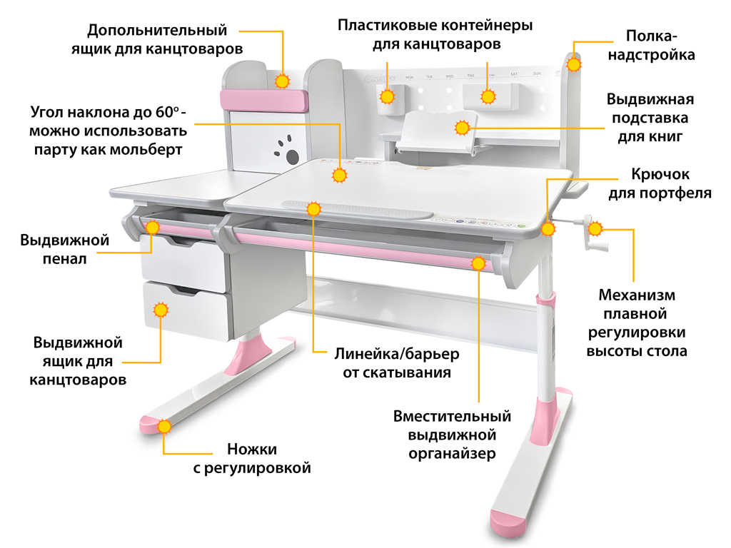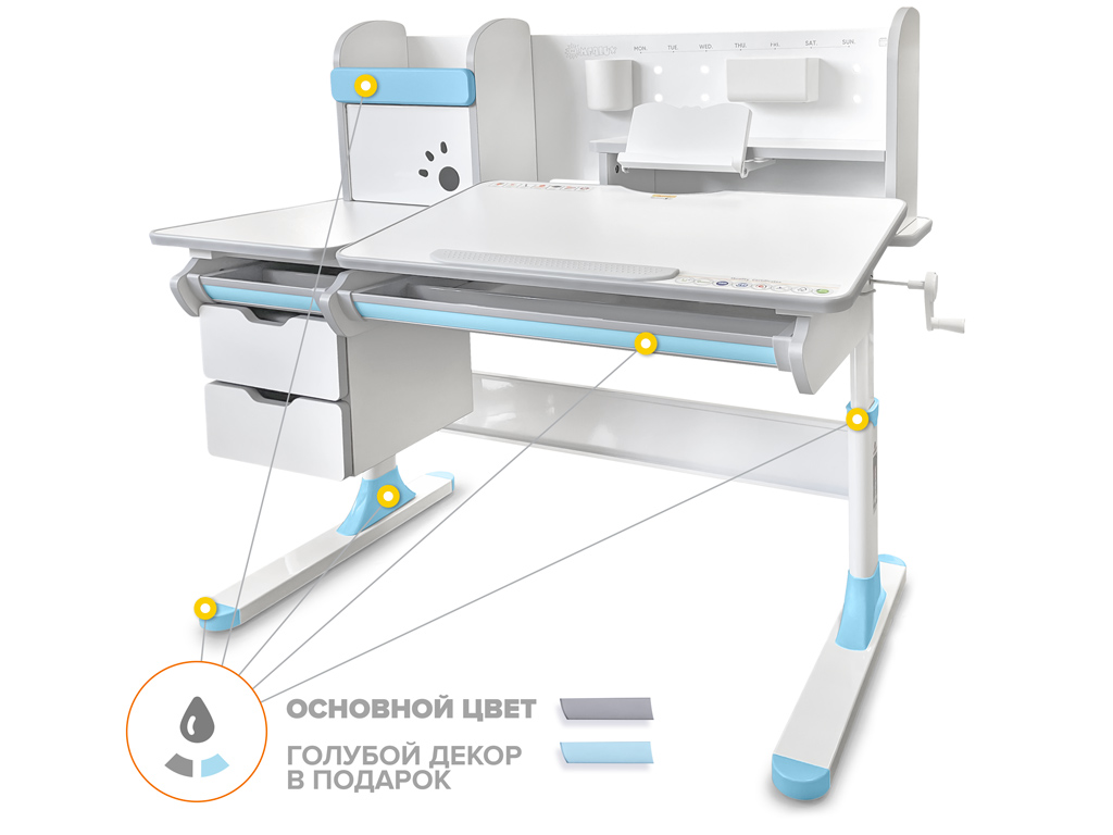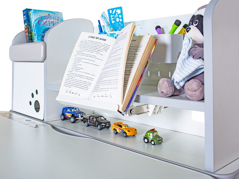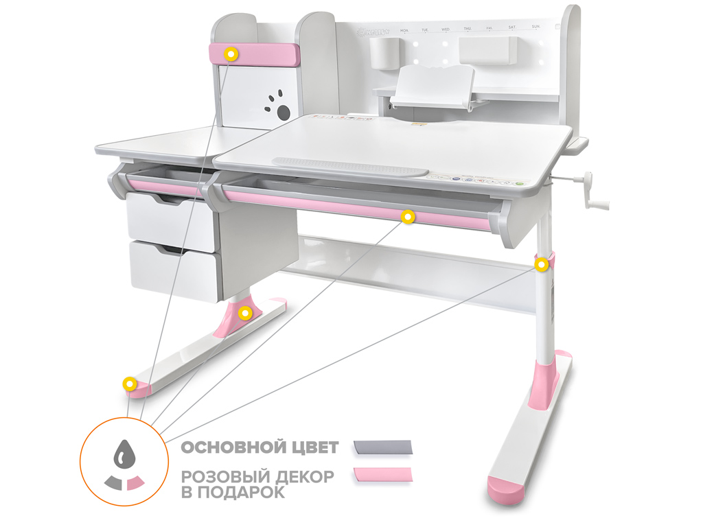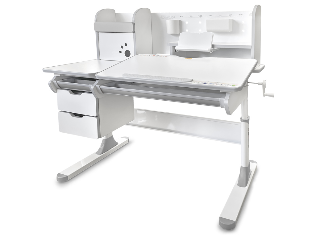Приятные особенности:Детский стол Mealux Hamilton Multicolor + надстройка -Одной из важных особенностей данной модели является наличие цветных накладок в подарок! Приобретайте полную комплектацию стола в сером цвете и получите розовые либо голубые накладки совершенно бесплатно! Накладки меняются на ножках, выдвижном органайзере и полке надстройке.Удобным дополнением для стола является полка - надстройка с двумя полочками поменьше и шкафчиком с металлической дверцей. Задняя стенка надстройки также металлическая. Ее можно использовать для закрепления заметок магнитами. Для удобного хранения мелких письменных принадлежностей на стенке крепятся два подвесных контейнера.Прекрасным дополнением к полке является прочная выдвижная подставка для книги с изменяемым углом наклона. При необходимости подставка убирается.Помимо полок у надстройки есть очень удобный шкафчик, в котором ребенок может хранить свои вещи. Металлическая дверца открывается наверх, а для удобства и безопасности – на дверце есть специальные отверстия для пальцев. Теперь все школьные принадлежности точно будут в порядке.Под статичной частью столешницы размещены выдвижные ящики и пенал из прочных материалов для хранения канцелярских принадлежностей.Стол имеет большой выдвижной органайзер размещенный под столешницей, который изготовлен из прочного, безопасного пластика.Высота стола регулируется с помощью червячного механизма ручкой, которую при сборке можно установить справа, либо слева.С помощью газлифта подвижная часть столешницы меняет угол наклона до 60 градусов. Столешницу с отрегулированным углом наклона можно использовать для письма, чтения и рисования.Наличие съемного прорезиненного барьера на столешнице предотвращает скатывание предметов во время выполнения домашнего задания.