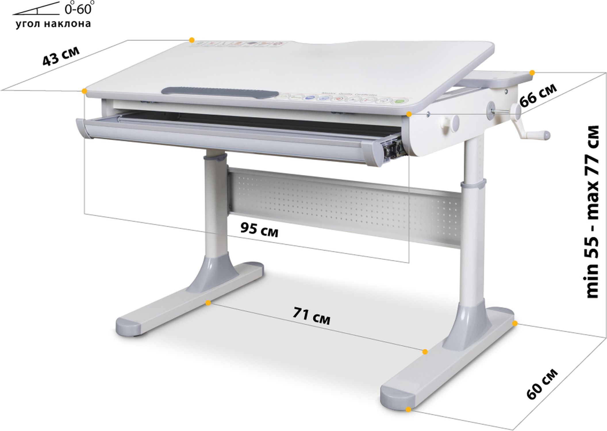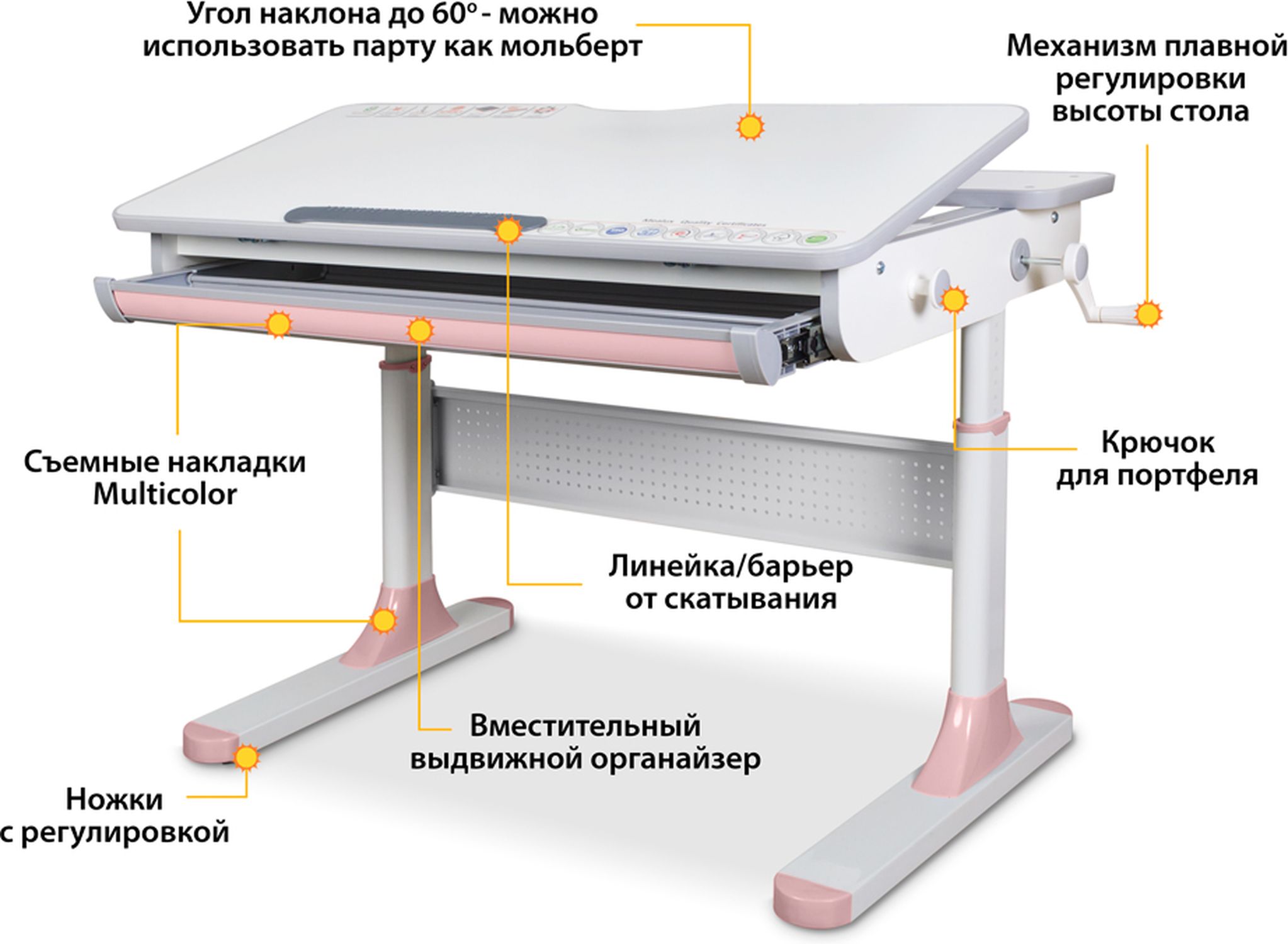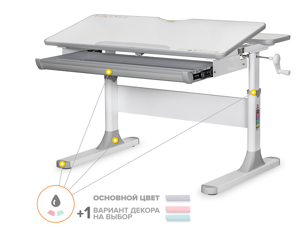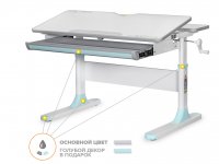 Приятные особенности:Одной из важных особенностей детской парты BD-610 Edmonton Lite является наличие цветных накладок в подарок! Приобретайте растущий стол и получите один з цветных наборов накладок совершенно бесплатно! Накладки представлены в розовом и голубом цветах. Стол имеет большой выдвижной органайзер, размещенный под столешницей, который изготовлен из прочного, безопасного пластика. Lite версия стола представлена как с полкой, так и без полки. Детский письменный стол BD-610 Mealux Edmonton с полкой S50 сочетает в себе стильный дизайн и высококачественные материалы. Эта модель позволит удобно разместить книгу или планшет на выдвижной металлической подставке для книг, которой укомплектована полка S50. Это доступный по цене детский письменный стол, с помощью которого создаются условия для комфортной работы и сохранения здоровья ребенка на протяжении всего срока обучения. Высота стола регулируется с помощью червячного механизма ручкой, которую при сборке можно установить либо справа, либо слева. С помощью газлифта столешница меняет угол наклона до 60 градусов, что помогает сохранить правильную осанку при работе за столом. Наличие съемного прорезиненного барьера на столешнице предотвратит скатывание предметов во время выполнения домашнего задания. В комплект к столу входит металлический крючок для размещения рюкзака или спортивной формы. Металлические ножки стола дополнены специальными регулировочными мебельными опорами для обеспечения его устойчивости.